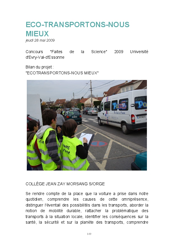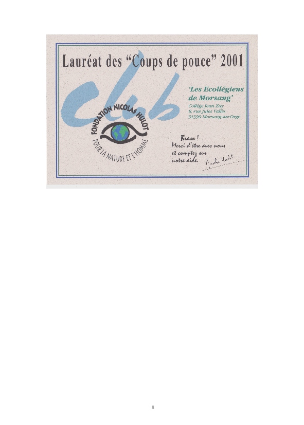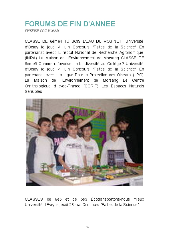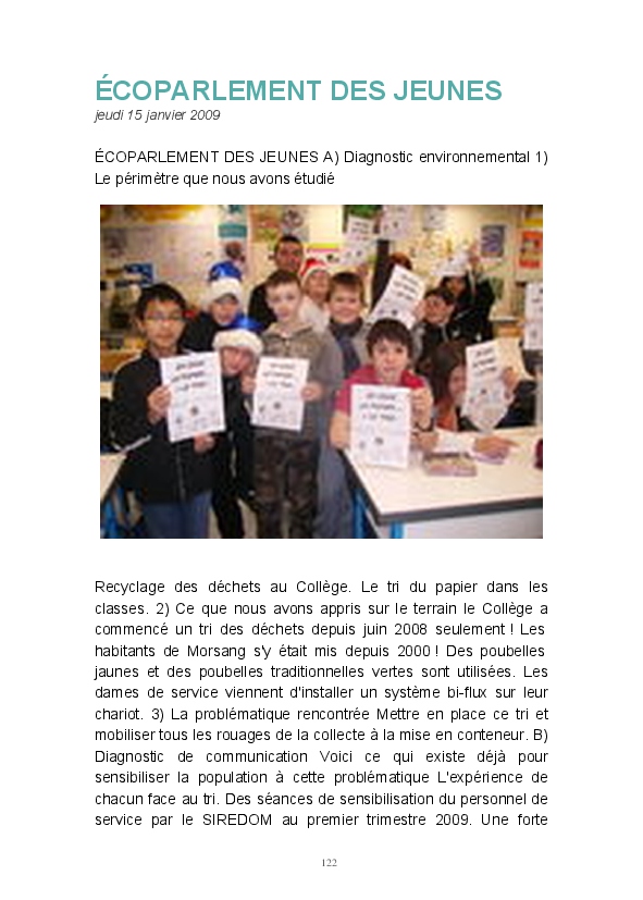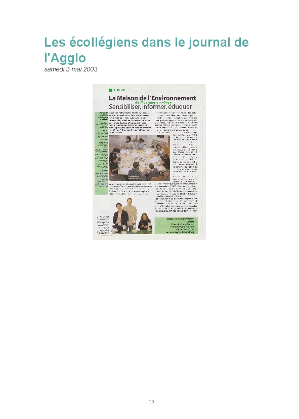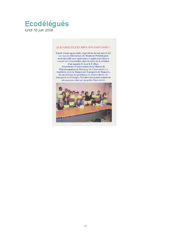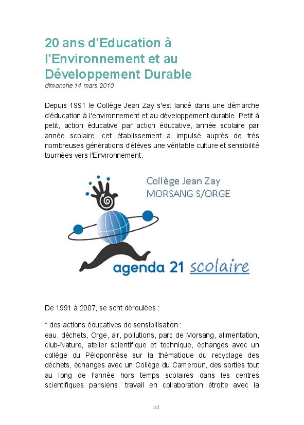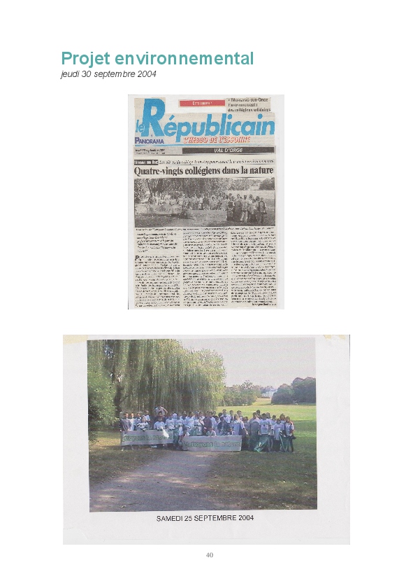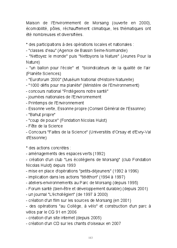 De nombreux projets pédagogiques ont été mis en place sur des thématiques variées : air, déchets, écomobilité, eau, santé, solidarité, … . La Ville de Morsang et le Conseil Général de l’Essonne ont soutenu et contribué au succès de toutes ces activités. Sous cette impulsion, la Ville de Morsang a, en 2012, ouvert une Maison de l’Environnement avec laquelle un partenariat a tout naturellement été mis en place avec les écollégiens.