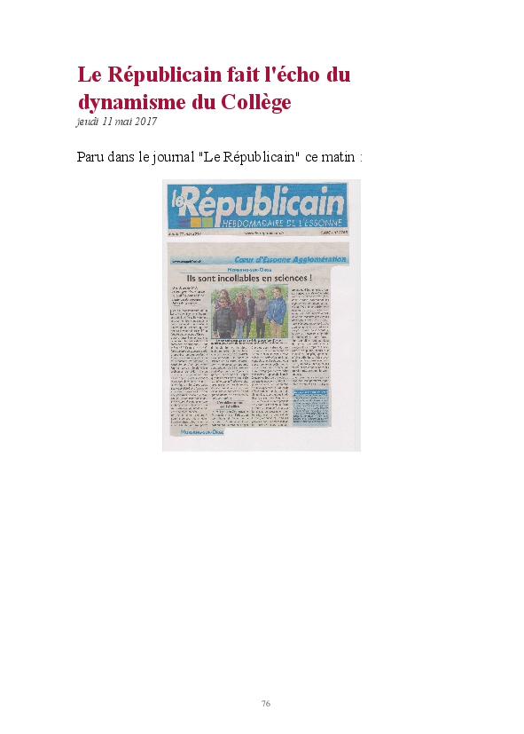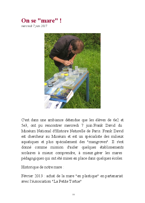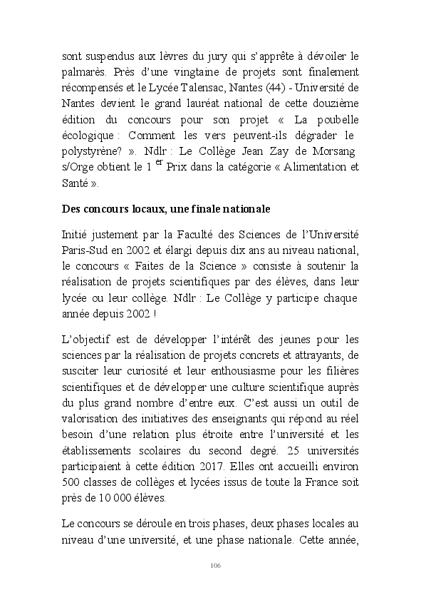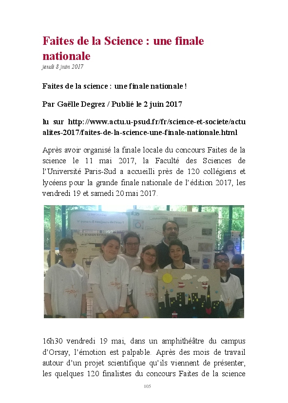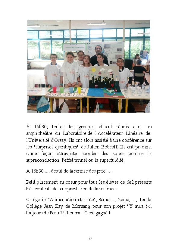 2016/2017 : première année d'une nouvelle réforme du Collège. Au Collège Jean Zay, chaque classe de 6ème a quatre heures de Sciences et un seul professeur. Grâce au dynamisme de Monsieur Chavanne, leur professeur de Sciences, les 6e2 ont pu réaliser tout un tas d'activités de sciences : des expériences, des sorties, des animations, des rencontres avec des intervenants extérieurs, ... . L'année a été riche, variée, distrayante et enrichissante. De plus, les 6e2 ont participé au Concours Faites de la Science avec un projet intitulé "Y aura t-il toujours de l'eau ?". Ils ont obtenu la première place !