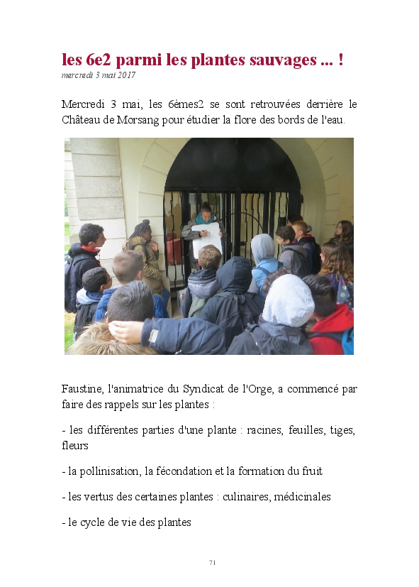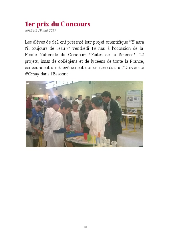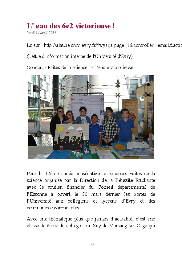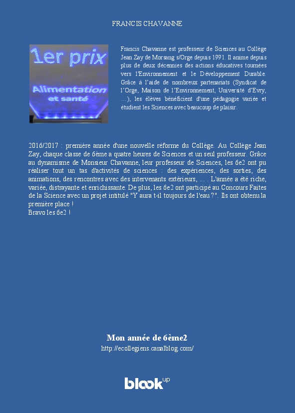 2016/2017 : première année d'une nouvelle réforme du Collège. Au Collège Jean Zay, chaque classe de 6ème a quatre heures de Sciences et un seul professeur. Grâce au dynamisme de Monsieur Chavanne, leur professeur de Sciences, les 6e2 ont pu réaliser tout un tas d'activités de sciences : des expériences, des sorties, des animations, des rencontres avec des intervenants extérieurs, ... . L'année a été riche, variée, distrayante et enrichissante. De plus, les 6e2 ont participé au Concours Faites de la Science avec un projet intitulé "Y aura t-il toujours de l'eau ?". Ils ont obtenu la première place !