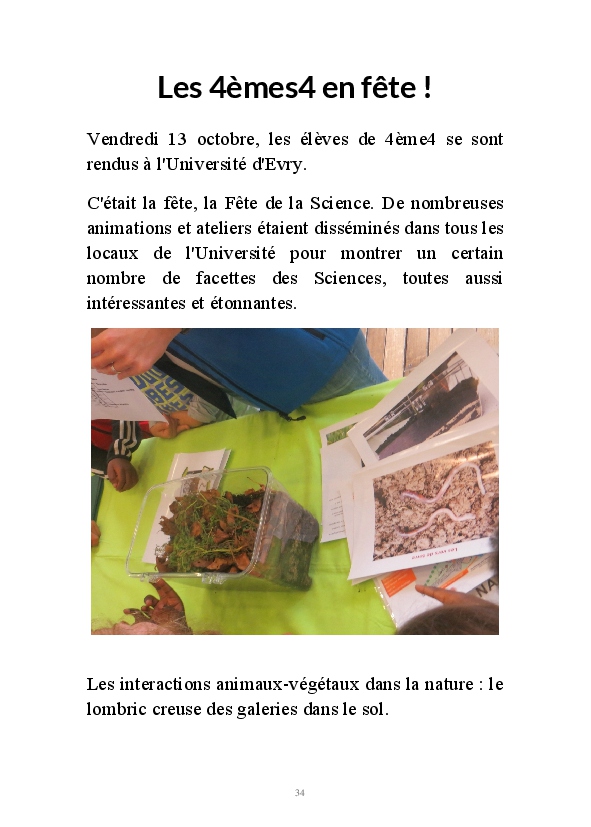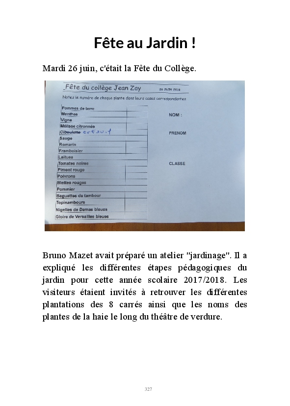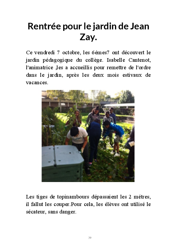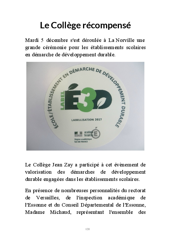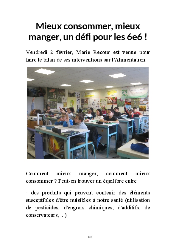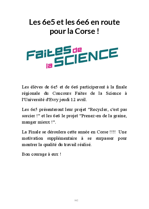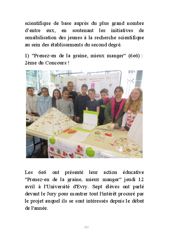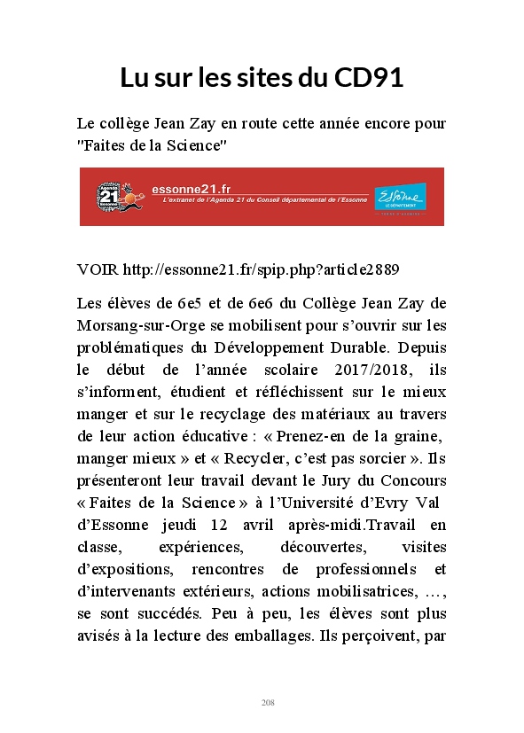 2017 / 2018 : deuxième année au cours de laquelle chaque professeur de Sciences, au Collège Jean Zay de Morsang s/Orge, s’occupe d’une classe de 6ème pour enseigner aux élèves toutes les SCIENCES. Cette année, trois classes de 6e ont développé une action éducative intitulée « Prenez-en de la graine » qui s’est déclinée sur l’Alimentation (manger mieux) et les Déchets (recyclage des emballages). De nombreux partenaires ont permis d’approfondir ces thèmes et de sensibiliser tous les élèves à la notion de Développement Durable : Maison de l’Environnement de Morsang, CPN Val de Seine, ERON, Herbe Folle, Espaces Naturels Sensibles, … . Encore une année riche en événements, à lire avec passion !