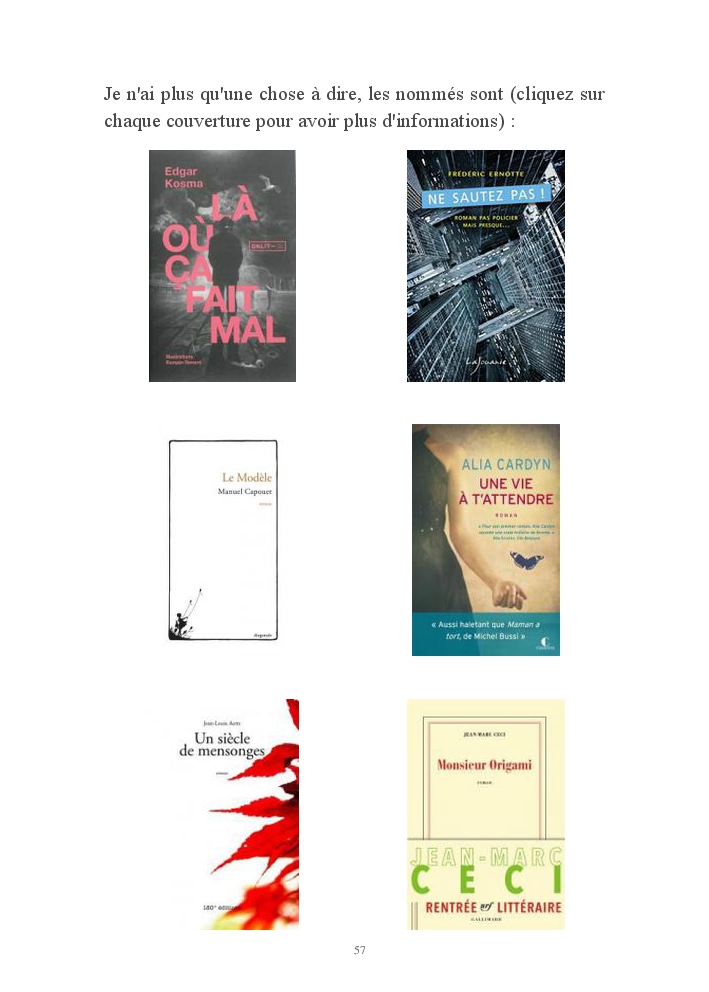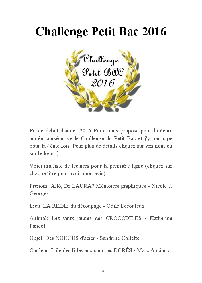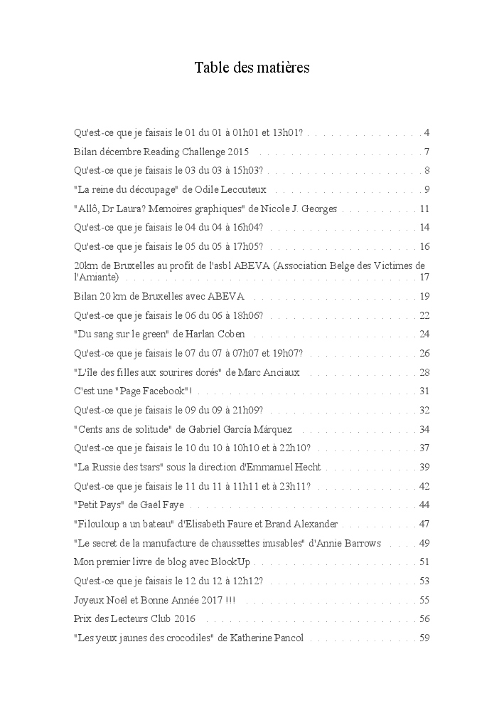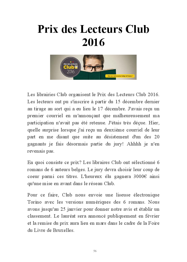 Sur le blog jai participé pour la quatrième fois au Challenge Petit Bac chez Ennalit et je l'ai réussi, j'ai couru pour la deuxième fois les 20km de Bruxelles, j'ai créé une page Facebook pour le blog, j'ai imprimé mon premier livre de blog avec Blook Up et les librairies Club m'ont annoncé que je faisais partie du jury de la première édition du Prix des Lecteurs Club.