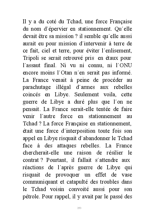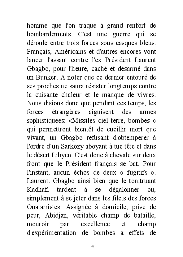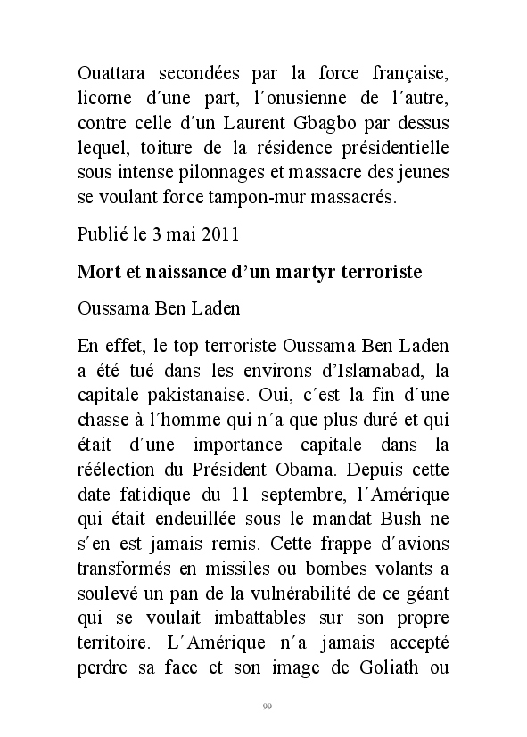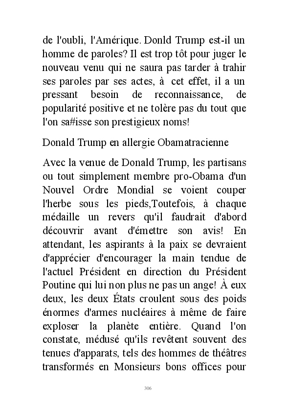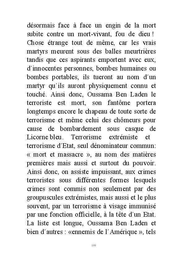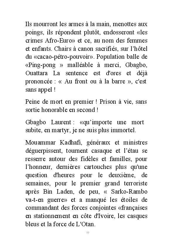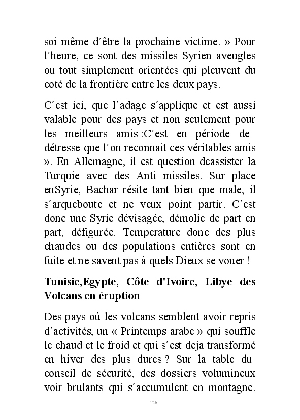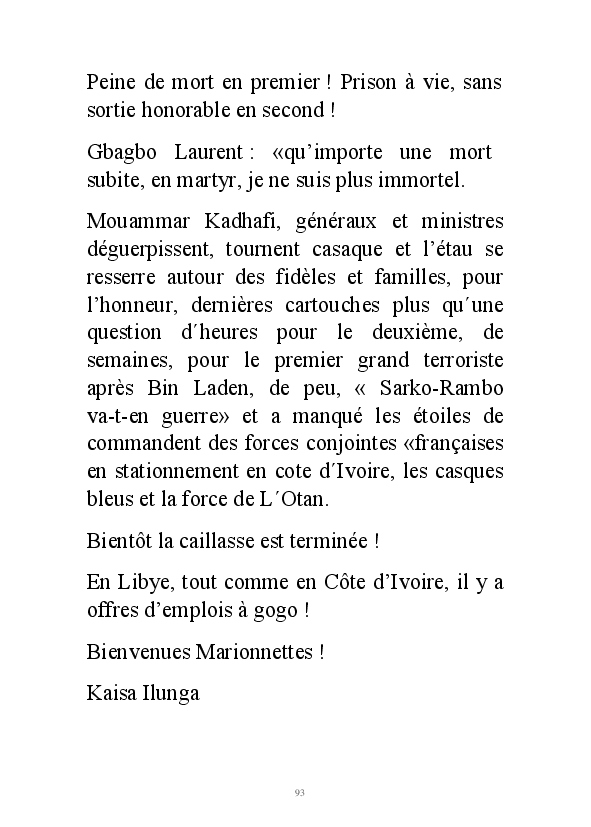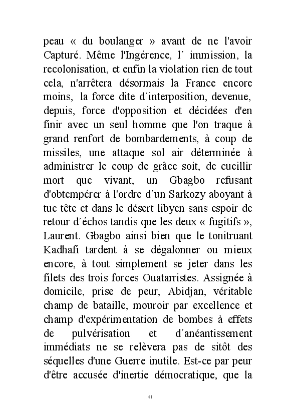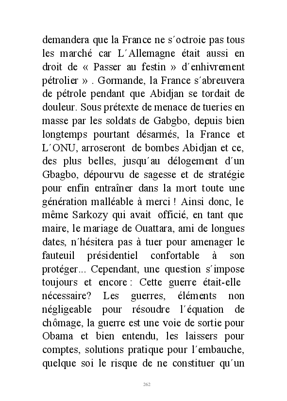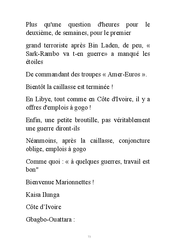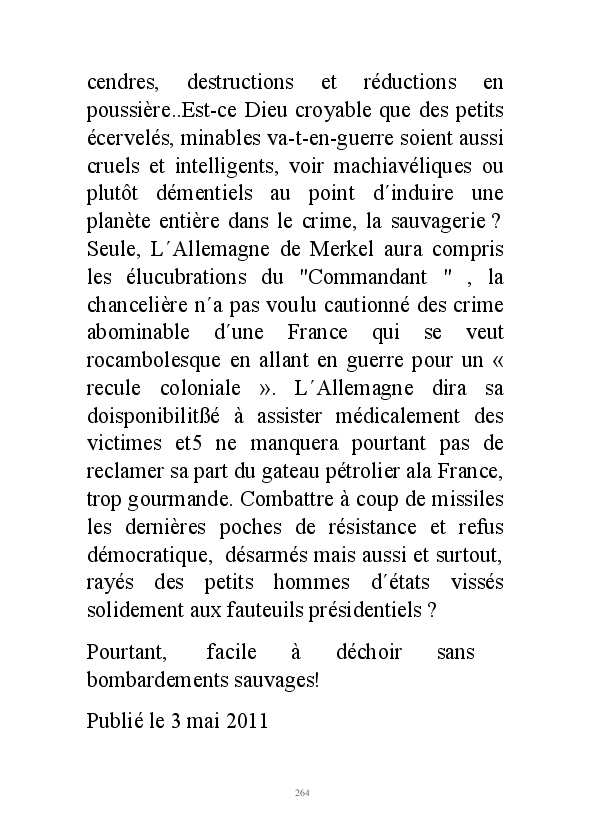 Des foyers de tensions se sont allumés ici et là depuis 2003 avec les guerres de Bush, contre Saddam, de Sarko-phage en Côte d'ivoire, Libye contre Kadhafi provoquant des flux migratoires, Organisations de paix, fabricants d'armes plongent dans l'arène des fauves, des armes pleuvent dans le ciel, résurgence du terrorisme Self-made; incendiaires d'hier, aujourd'hui anges de la paix, le tout, dans une dramaturgie démentielle, diabolique.Conséquence du carton de vote dans l'urne pour un bandit d'état, un va-t-en-guerre!