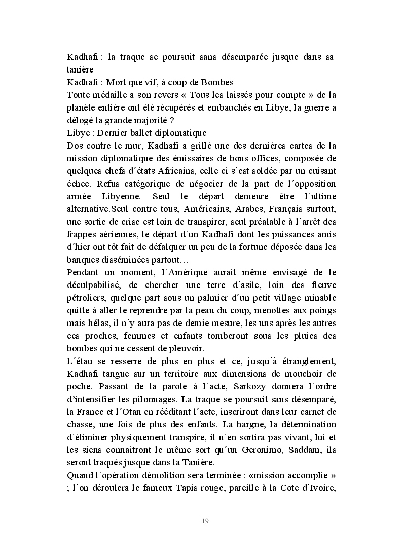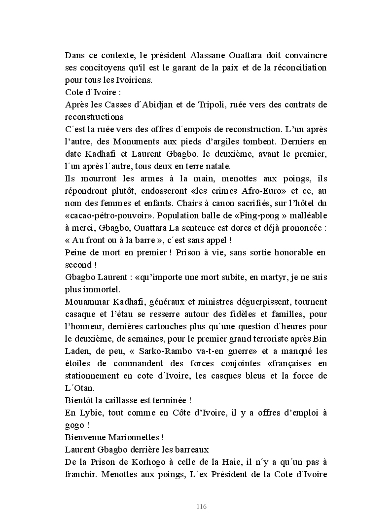 Roman d'actu polit. faits réels, dramaturgiques sur deux fronts Abidjan-Tripoli. Loin de l'imaginaire, les Présidents-commanditaires transforment la sale besogne en sauvetage "Licorne", noble. Sarko s'agite, l'étau se resserre, Bâtiments à canons, chasseurs sillonnent le ciel, déluge, caillasse de Tripoli, assassinat et putsch kadhafi, ingrédients explosifs du Nouveau Désordre Mondial,pour M.r, Obama:"c´était une erreur!",il y a eu overdose de démocratie, trop tard!