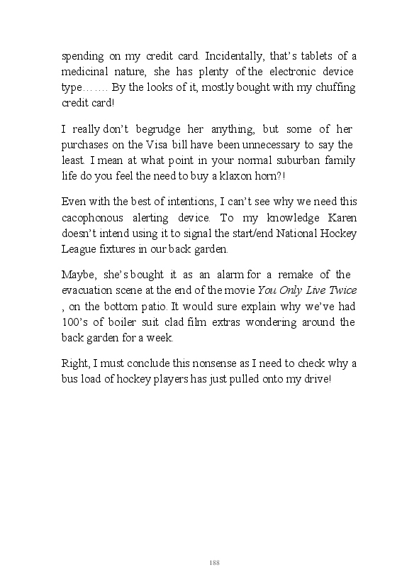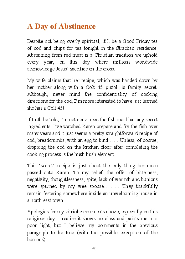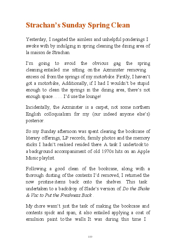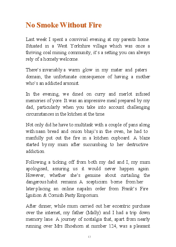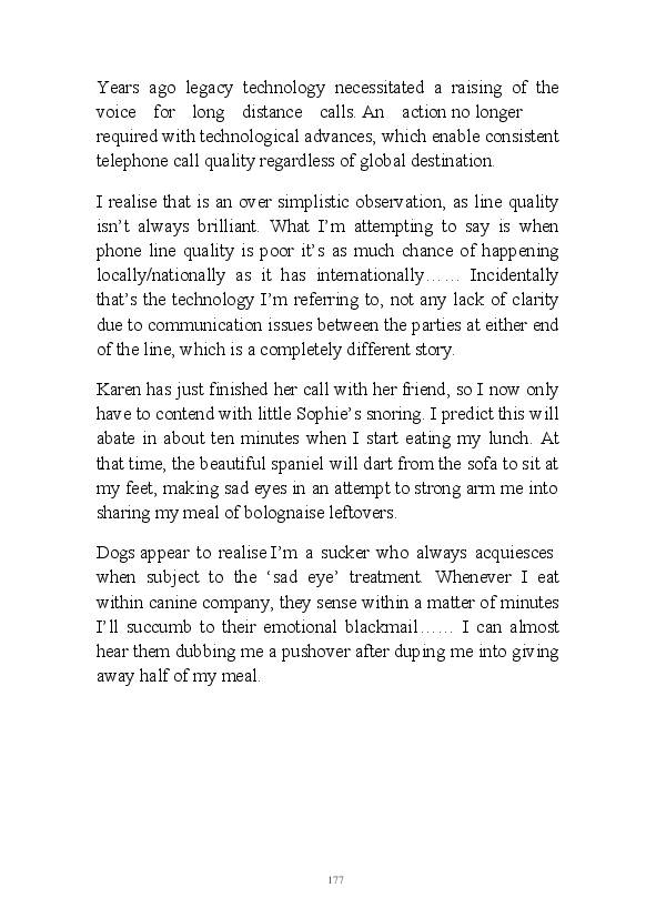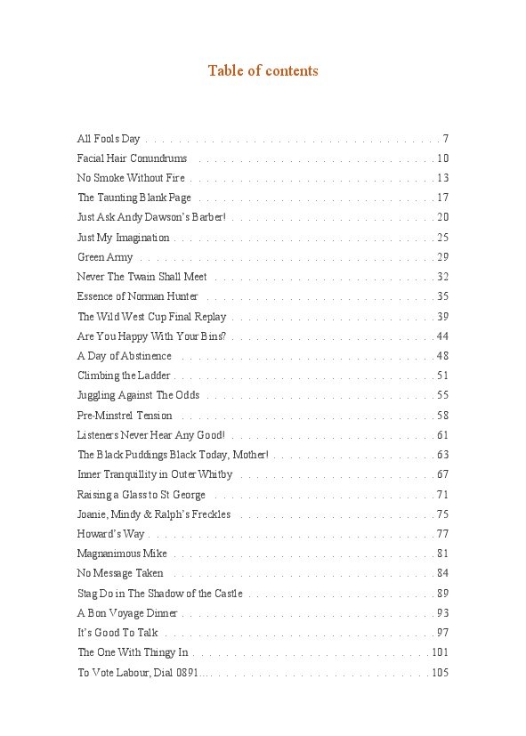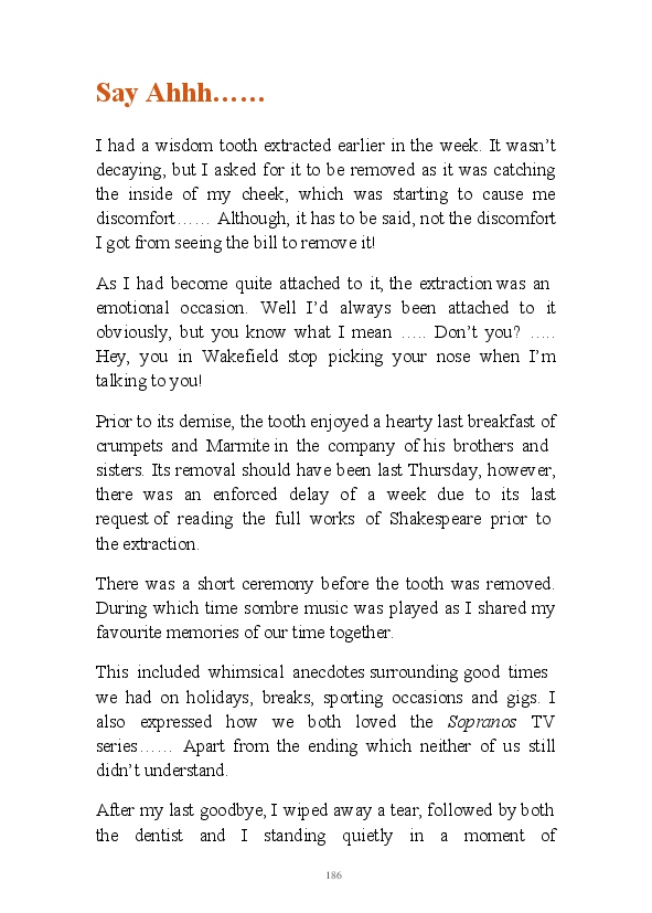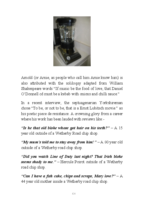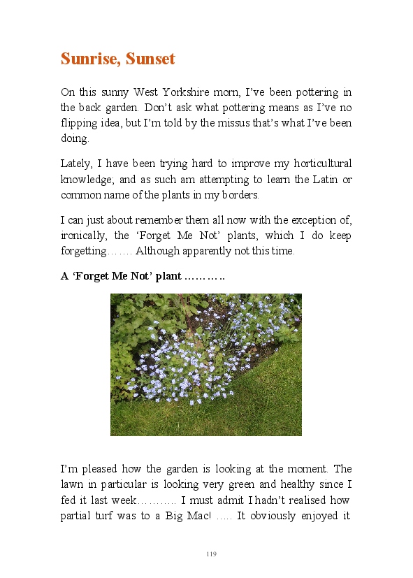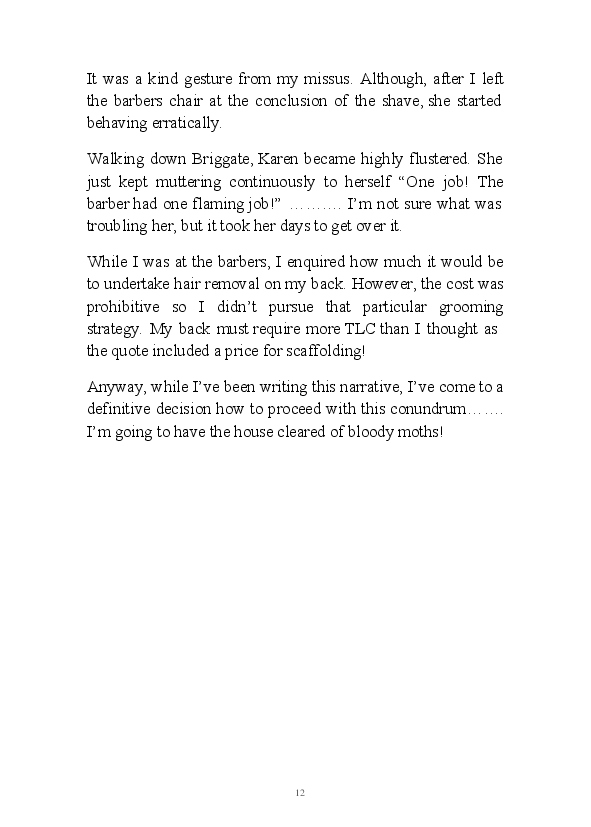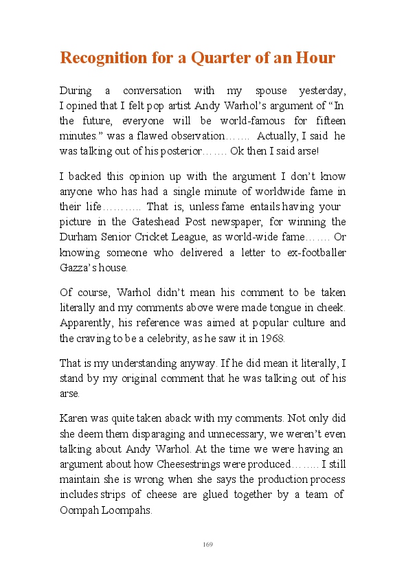 '15 Minutes of Fame' contains excerpts from the author's daily diary in April & May 2017. He has no idea why he titled this work by that name as he hasn't even had 1 minute of fame. The light hearted yarns within the book include visiting a posh place in Whitby, family get togethers and the unlikely tale of his brother inventing infra-red peanuts. Despite his depressive nature and inherent silliness, his wife loves him dearly.... Oh, hold on she's just said she thinks he's an arse!