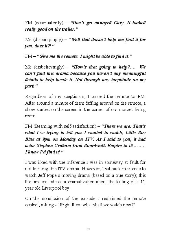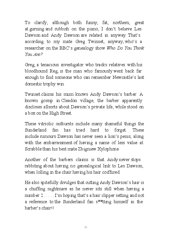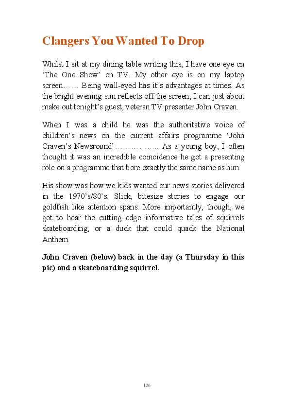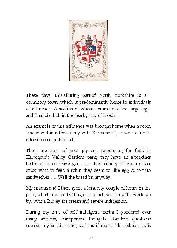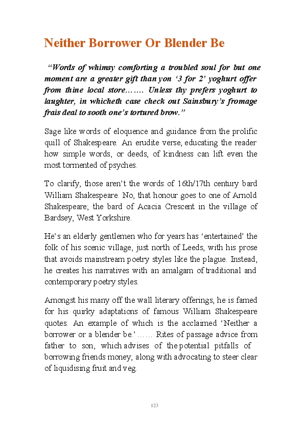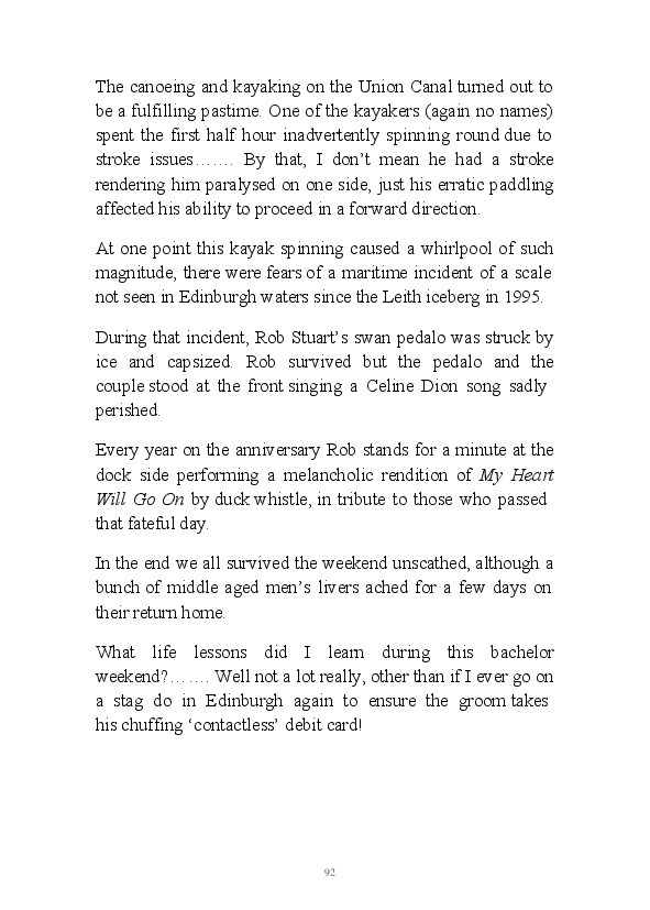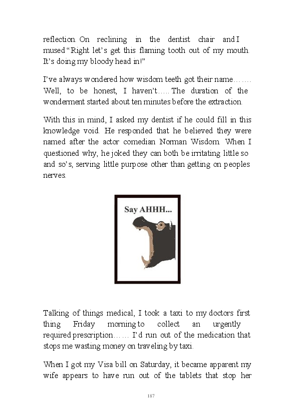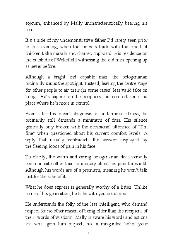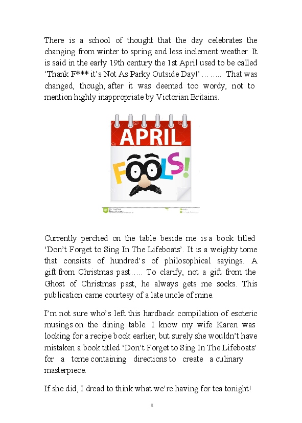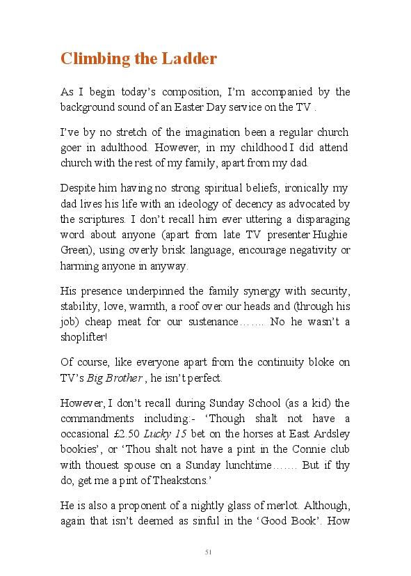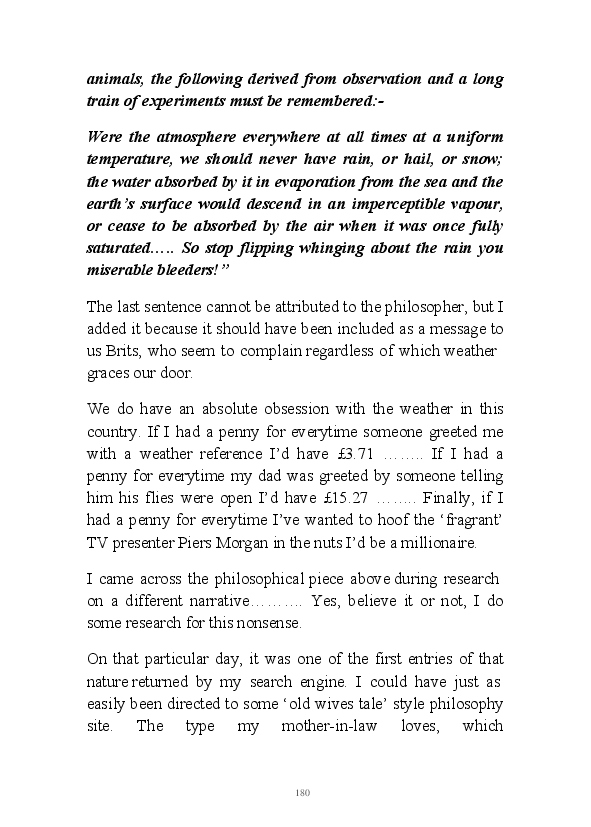 '15 Minutes of Fame' contains excerpts from the author's daily diary in April & May 2017. He has no idea why he titled this work by that name as he hasn't even had 1 minute of fame. The light hearted yarns within the book include visiting a posh place in Whitby, family get togethers and the unlikely tale of his brother inventing infra-red peanuts. Despite his depressive nature and inherent silliness, his wife loves him dearly.... Oh, hold on she's just said she thinks he's an arse!