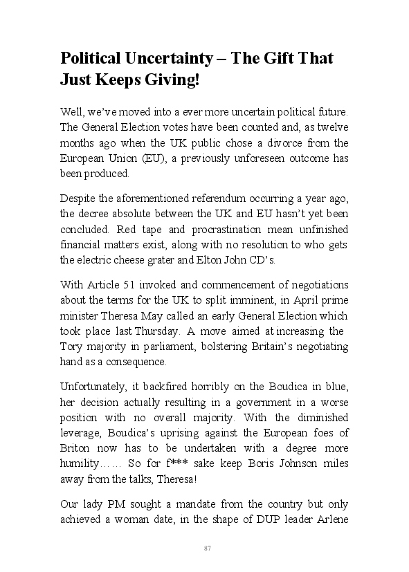 'Prose & Cons' provides excerpts from the author's darkly humorous daily diary blogs in June 2017, in association with a selection of sonnets. Poetry a new literary challenge for Mr Strachan, inspired by his keen eye for the pretentious. Subjects within this tome include his father's hospital admission, a good riddance to the month of June and noticing the Scarbrough pub in Leeds is spelt wrong. Born with only one head, the author is adapting to his 'difference'.