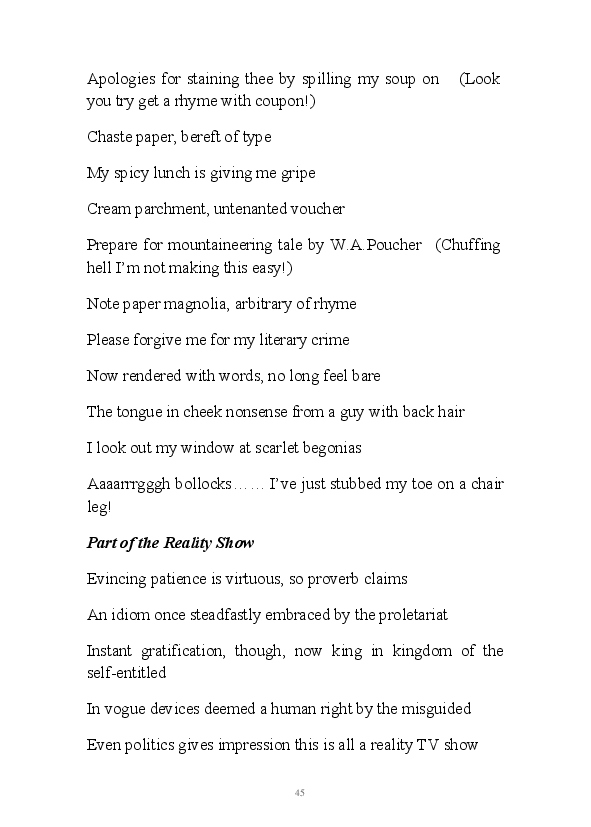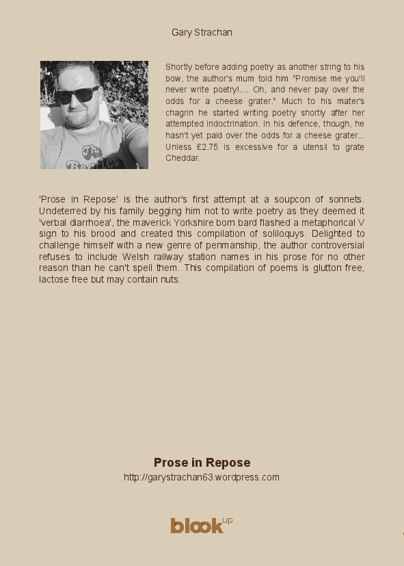 'Prose in Repose' is the author's first attempt at a soupcon of sonnets. Undeterred by his family begging him not to write poetry as they deemed it 'verbal diarrhoea', the maverick Yorkshire born bard flashed a metaphorical V sign to his brood and created this compilation of soliloquys. Delighted to challenge himself with a new genre of penmanship, the author controversial refuses to include Welsh railway station names in his prose for no other reason than he can't spell them. This compilation of poems is glutton free, lactose free but may contain nuts.