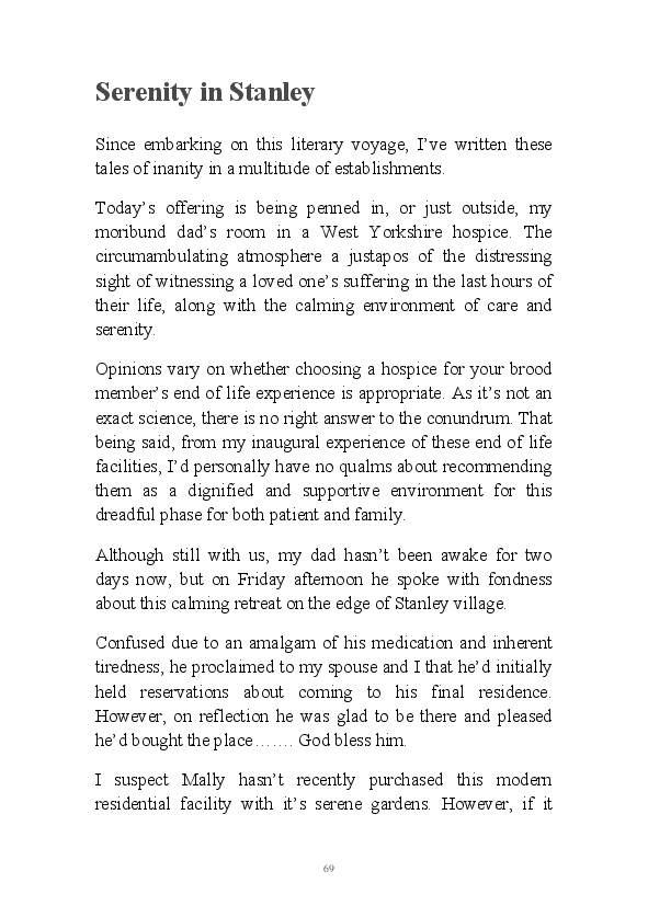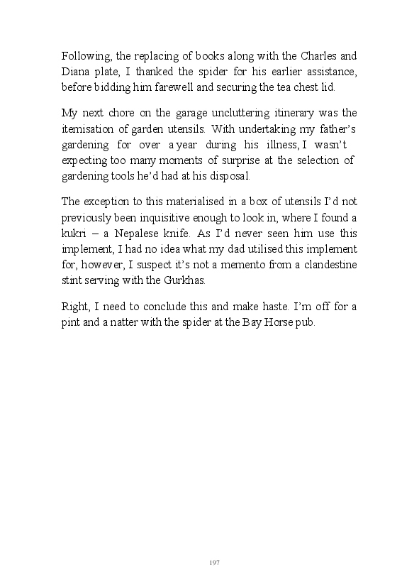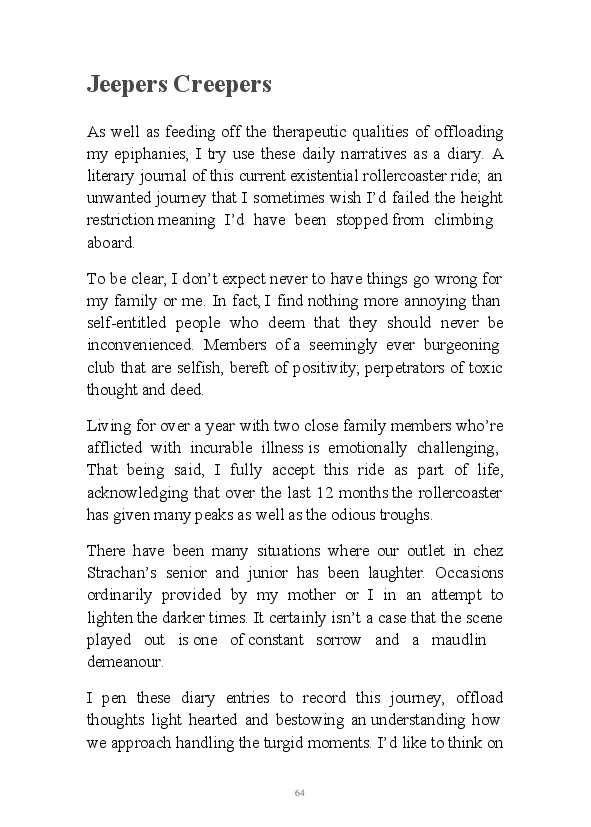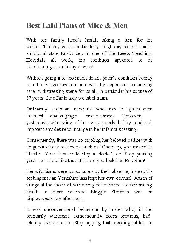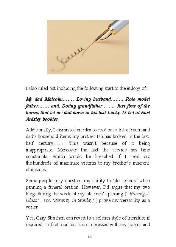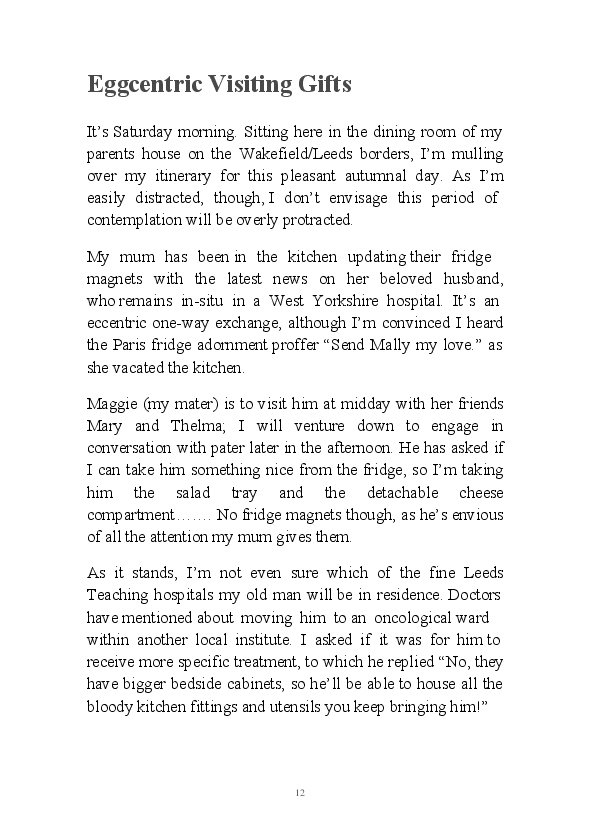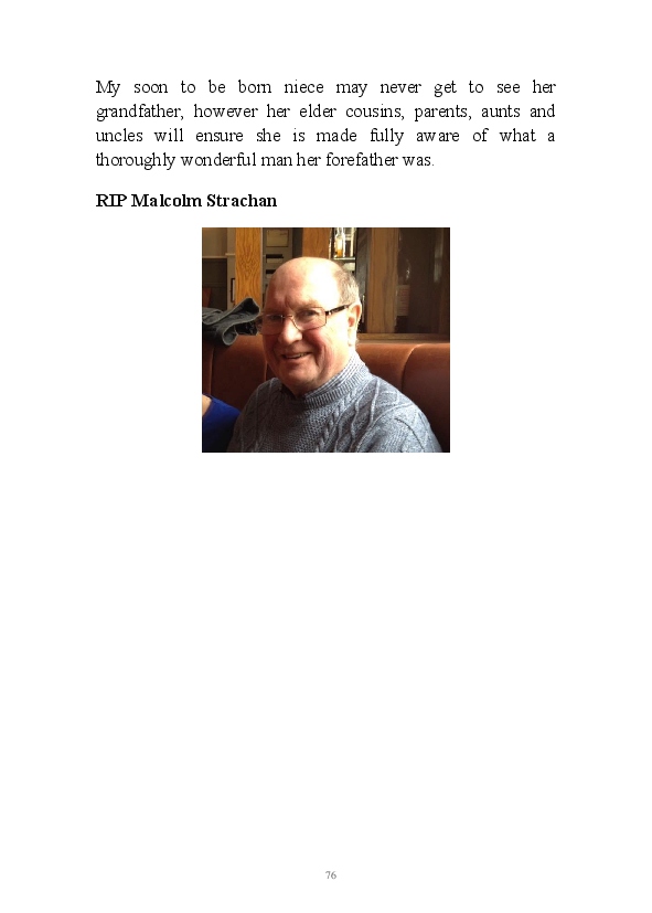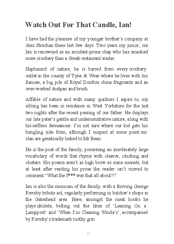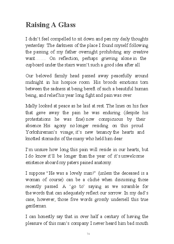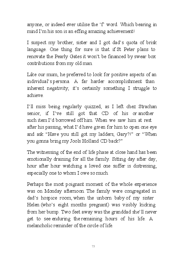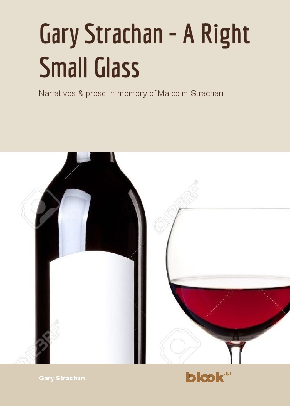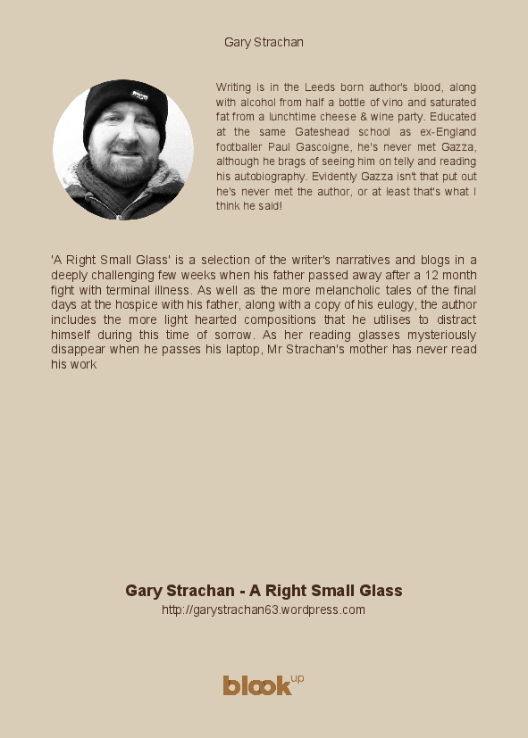 'A Right Small Glass' is a selection of the writer's narratives and blogs in a deeply challenging few weeks when his father passed away after a 12 month fight with terminal illness. As well as the more melancholic tales of the final days at the hospice with his father, along with a copy of his eulogy, the author includes the more light hearted compositions that he utilises to distract himself during this time of sorrow. As her reading glasses mysteriously disappear when he passes his laptop, Mr Strachan's mother has never read his work