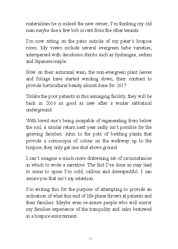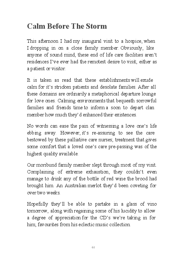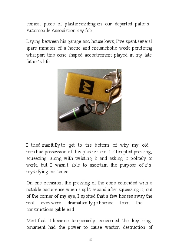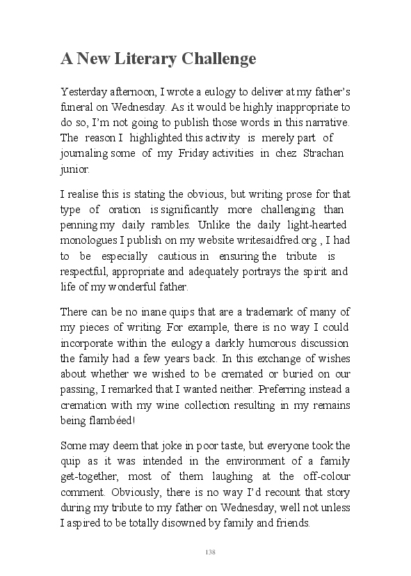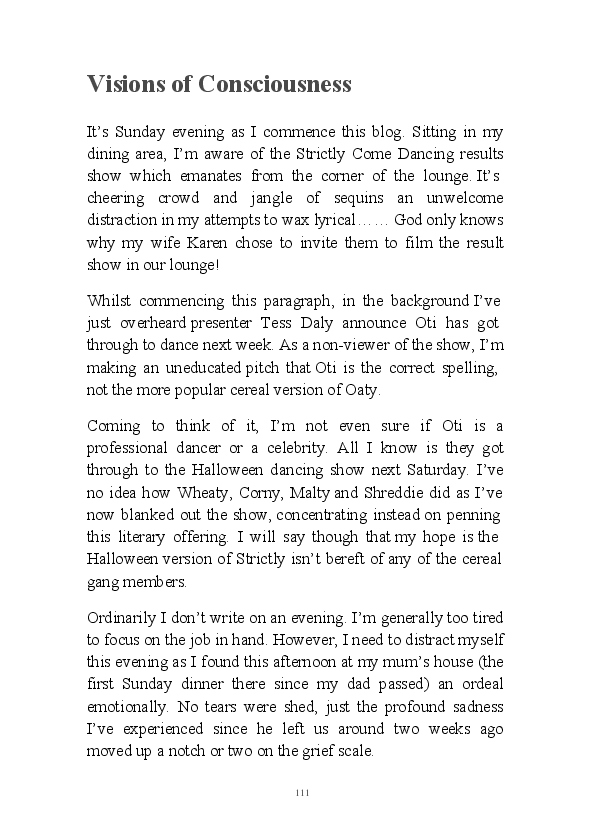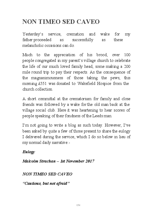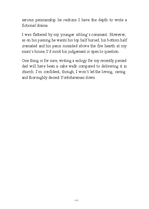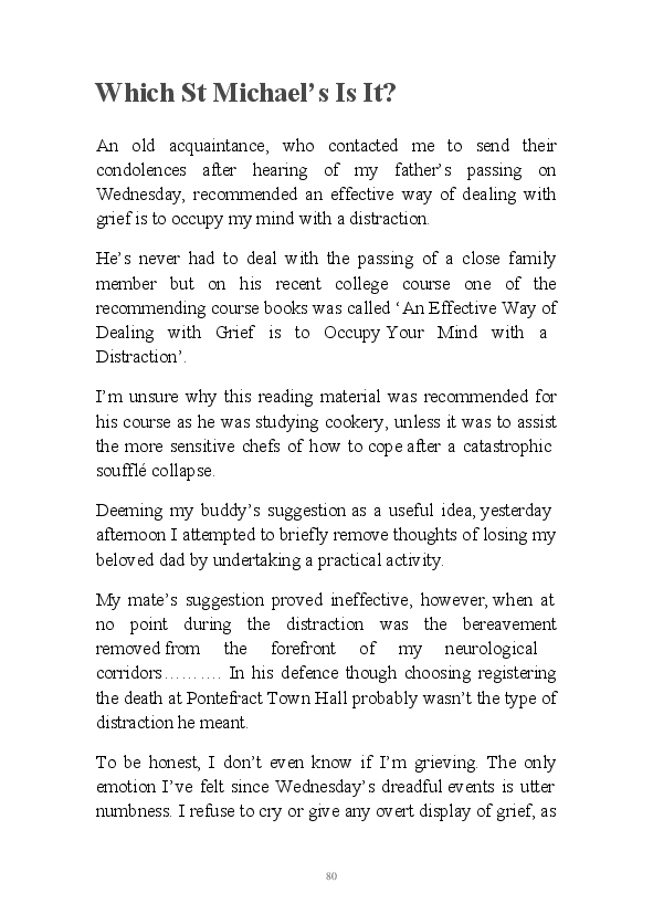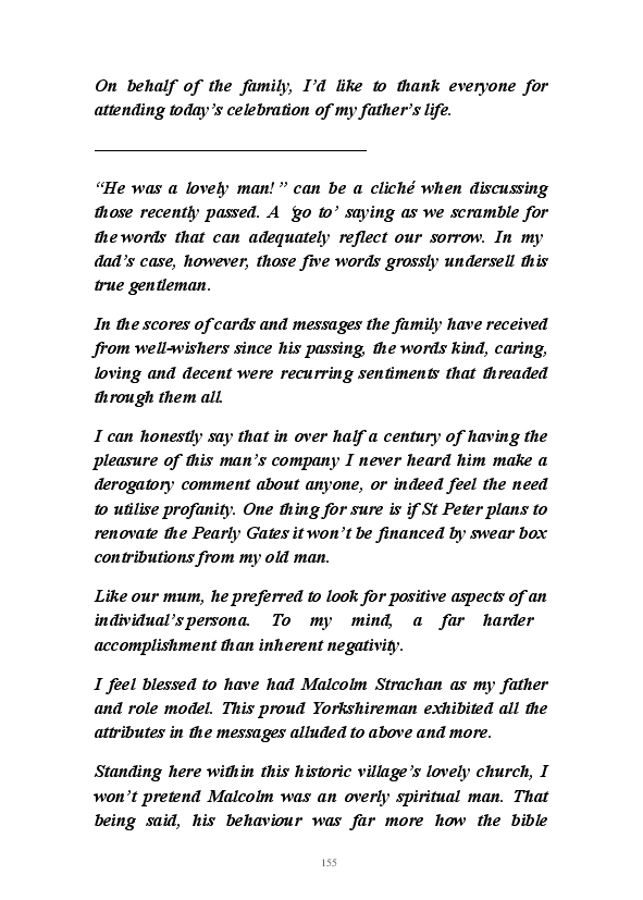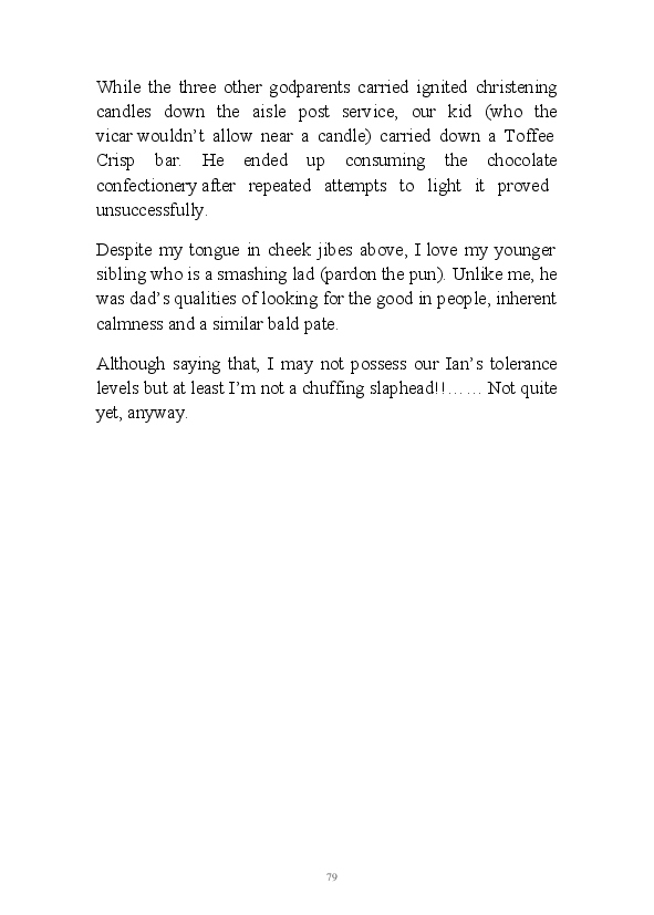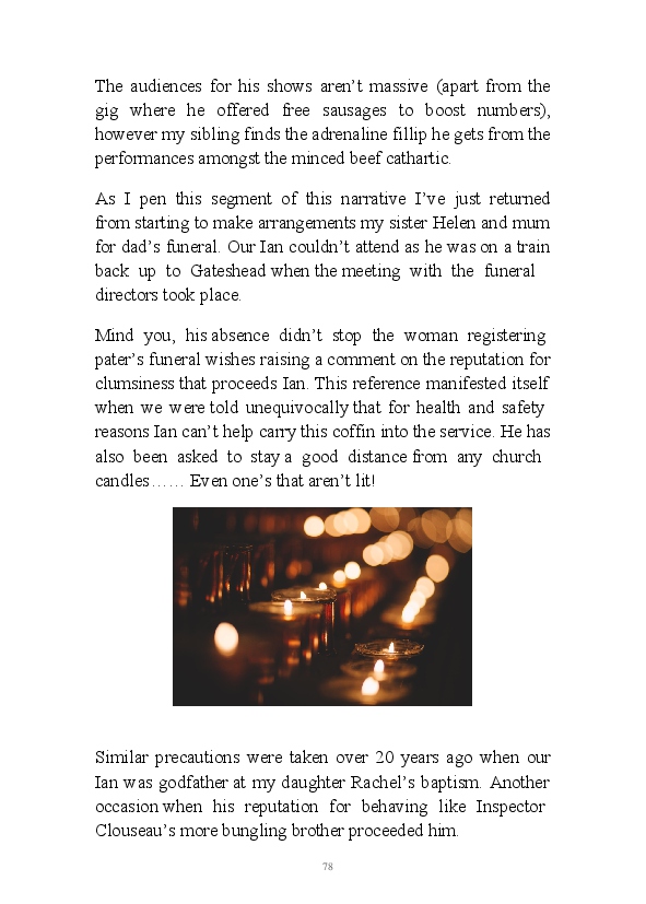 'A Right Small Glass' is a selection of the writer's narratives and blogs in a deeply challenging few weeks when his father passed away after a 12 month fight with terminal illness. As well as the more melancholic tales of the final days at the hospice with his father, along with a copy of his eulogy, the author includes the more light hearted compositions that he utilises to distract himself during this time of sorrow. As her reading glasses mysteriously disappear when he passes his laptop, Mr Strachan's mother has never read his work