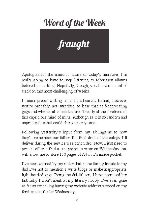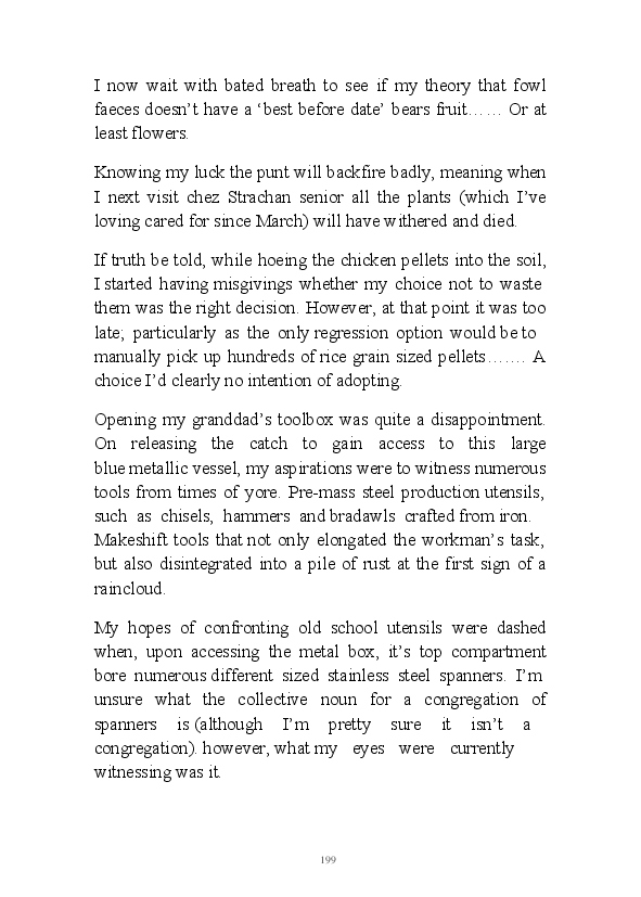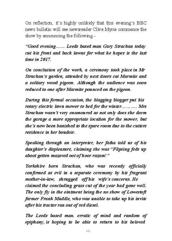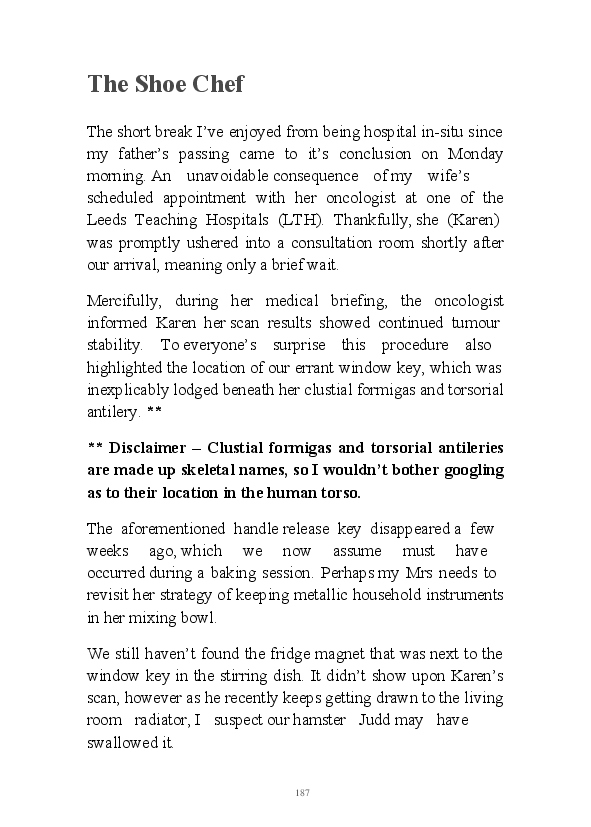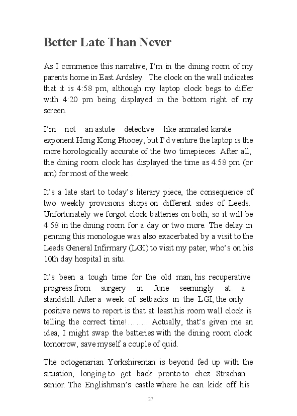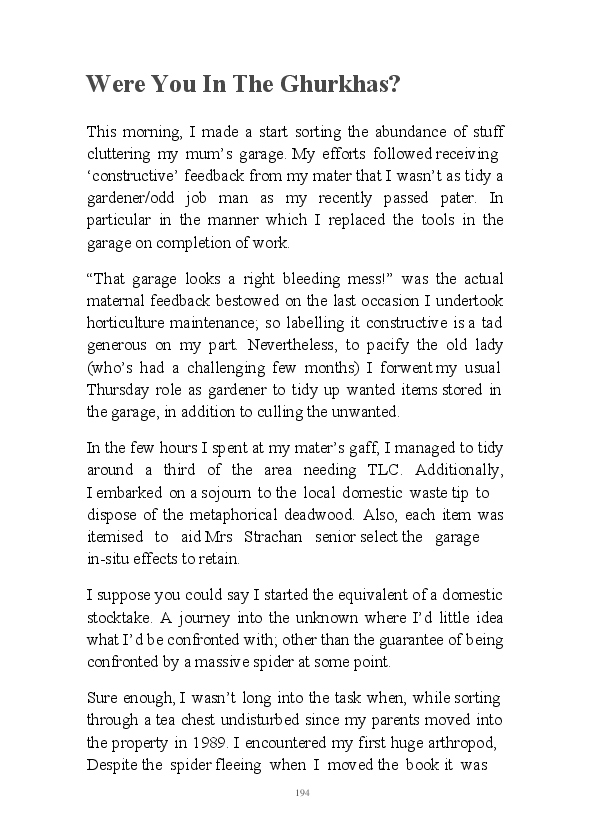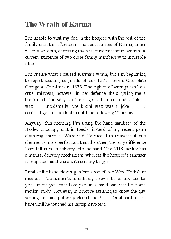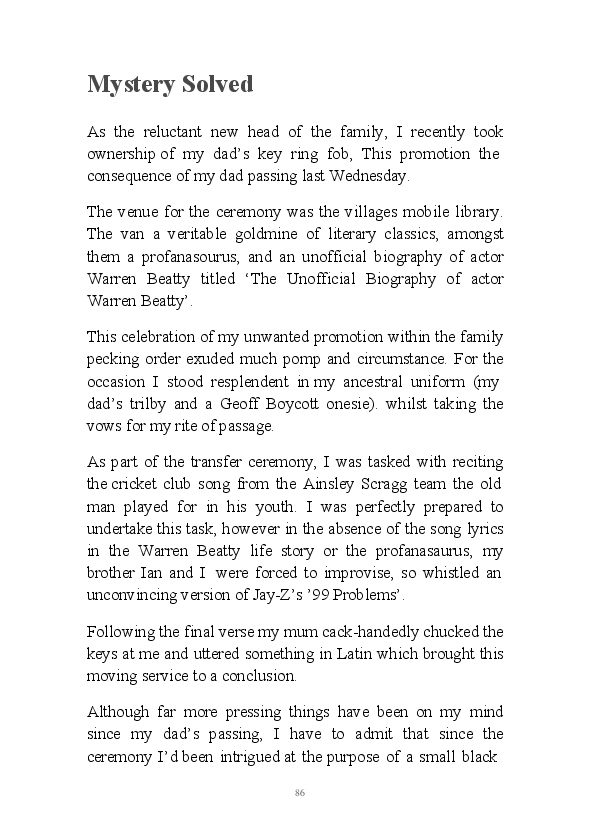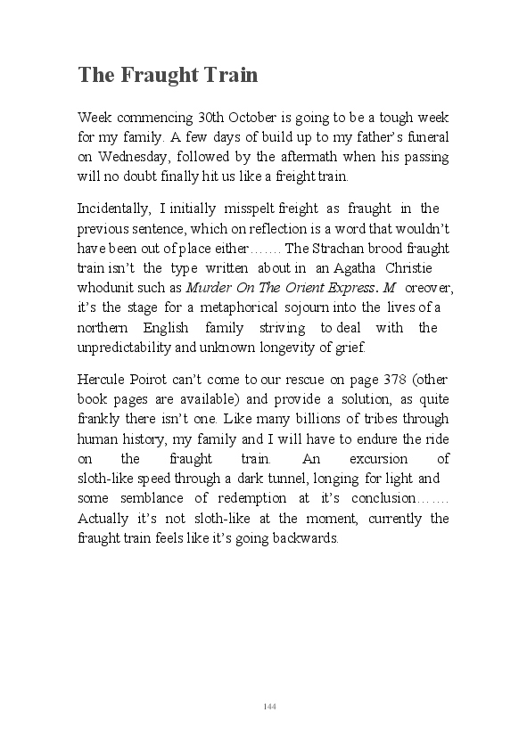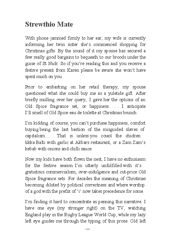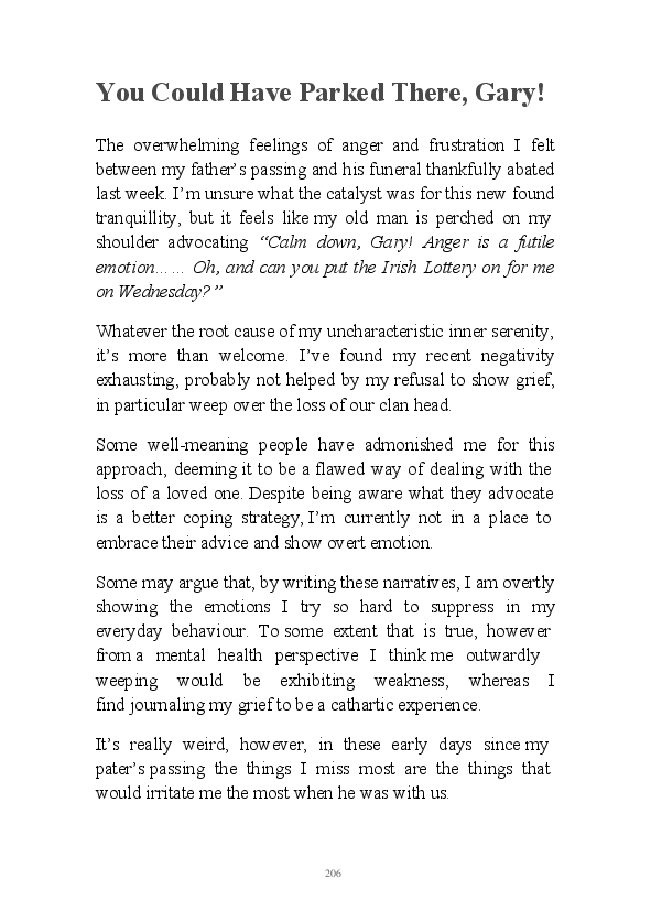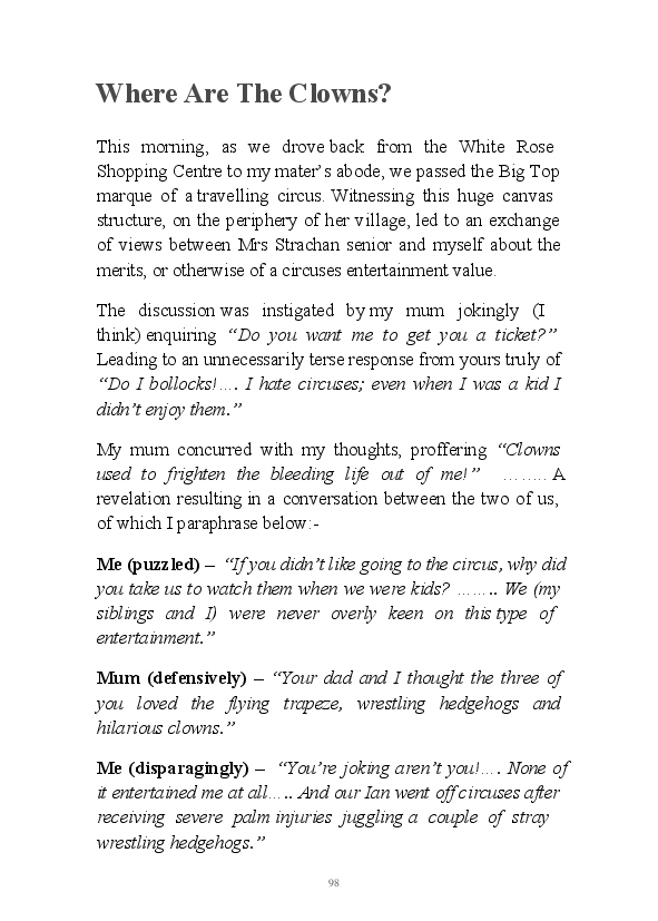 'A Right Small Glass' is a selection of the writer's narratives and blogs in a deeply challenging few weeks when his father passed away after a 12 month fight with terminal illness. As well as the more melancholic tales of the final days at the hospice with his father, along with a copy of his eulogy, the author includes the more light hearted compositions that he utilises to distract himself during this time of sorrow. As her reading glasses mysteriously disappear when he passes his laptop, Mr Strachan's mother has never read his work