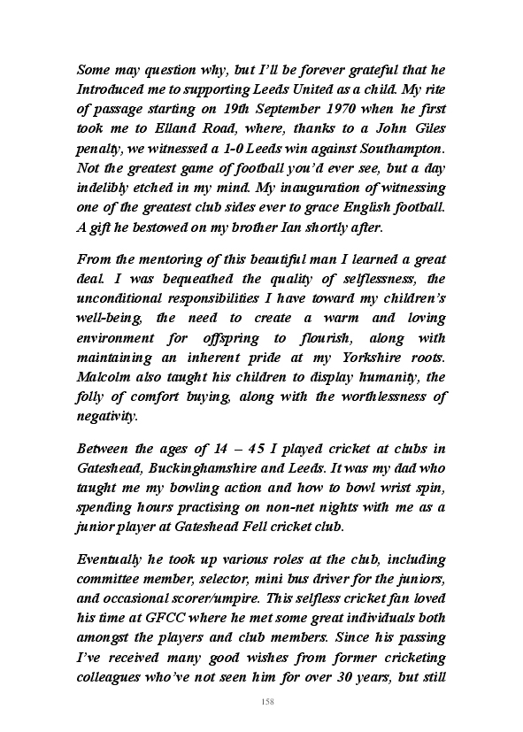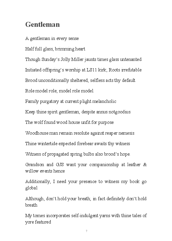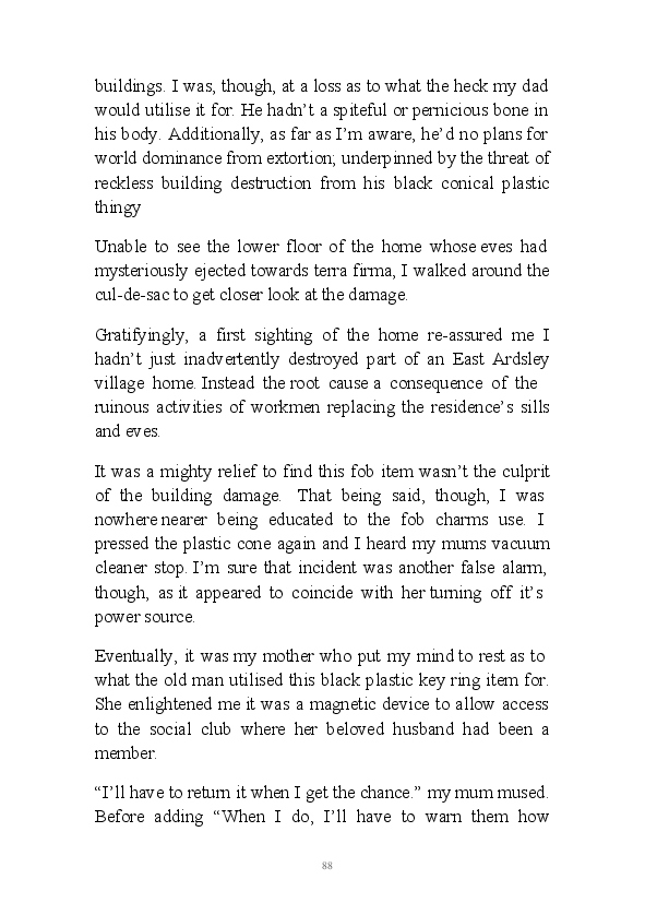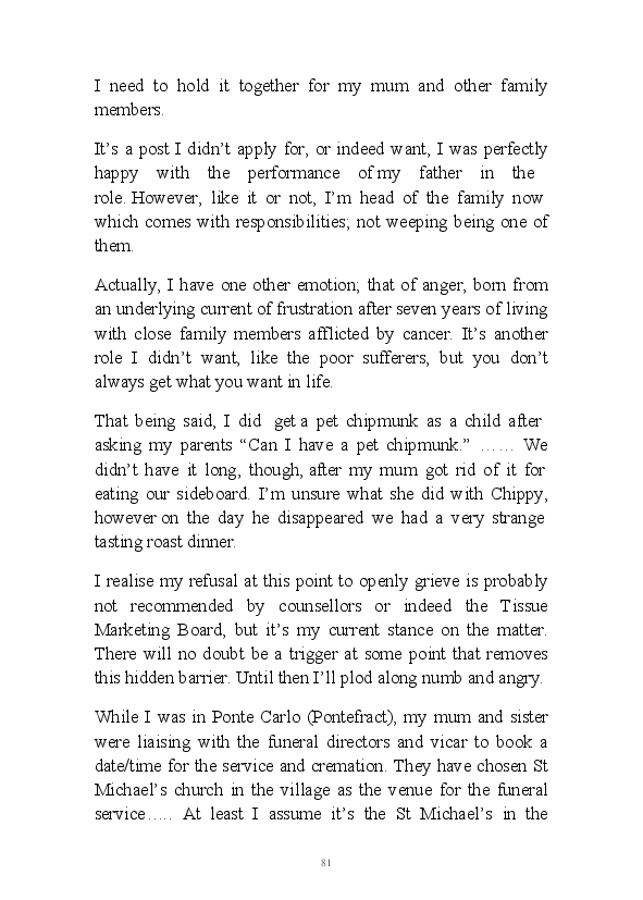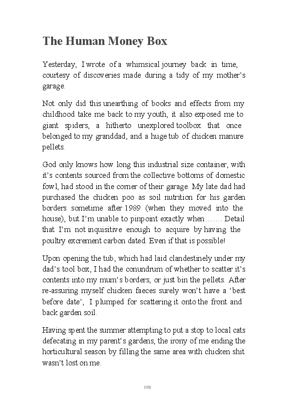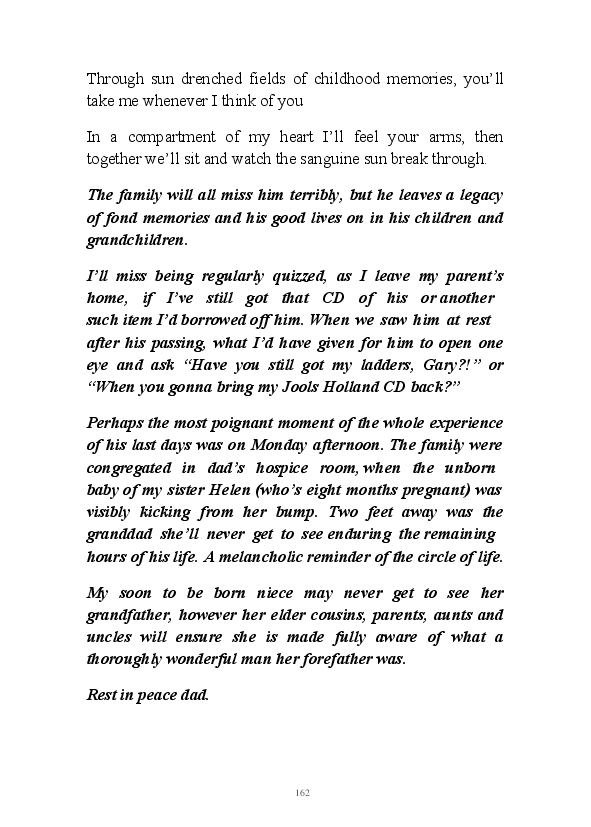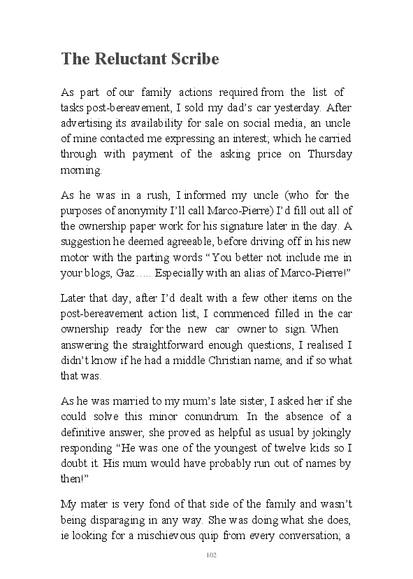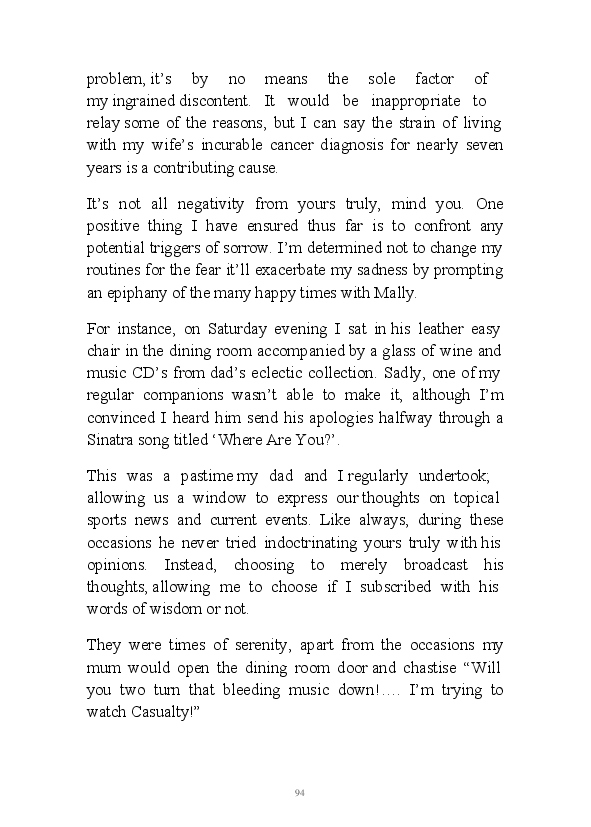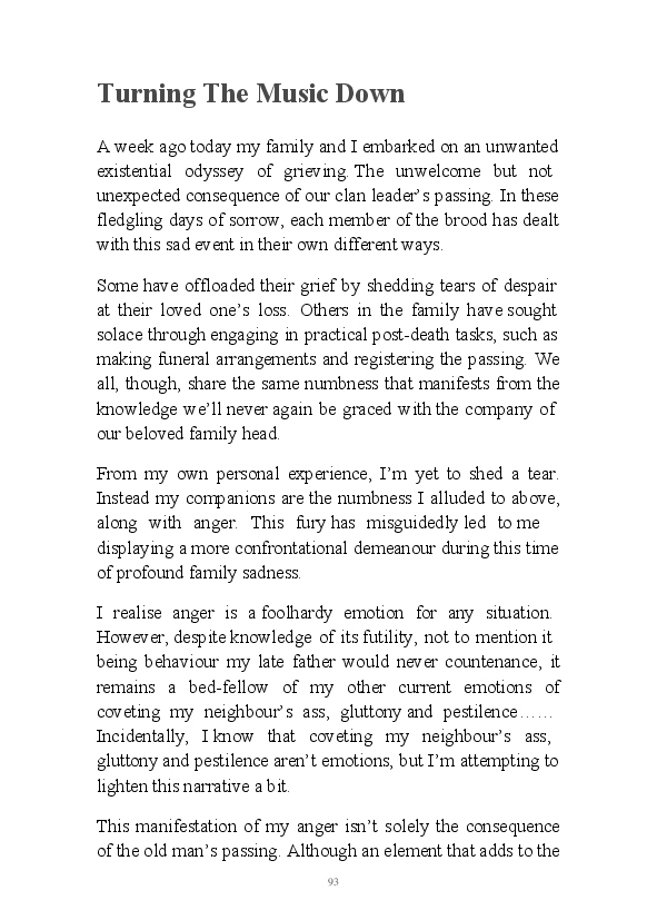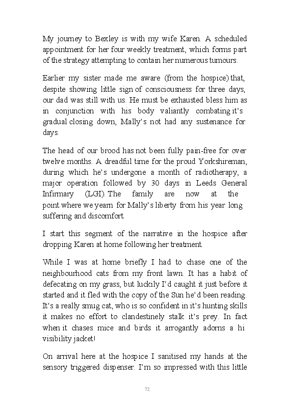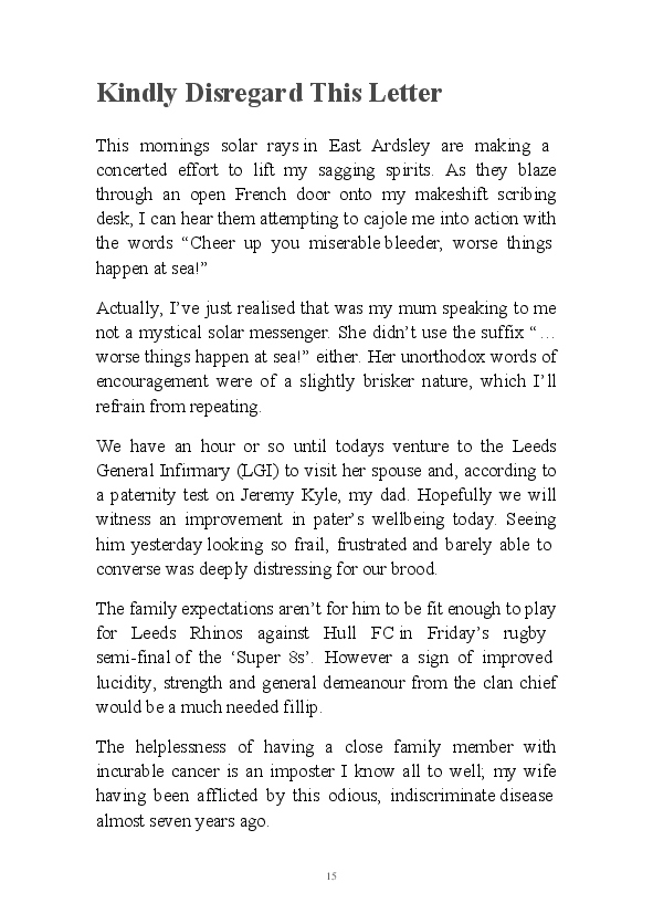 'A Right Small Glass' is a selection of the writer's narratives and blogs in a deeply challenging few weeks when his father passed away after a 12 month fight with terminal illness. As well as the more melancholic tales of the final days at the hospice with his father, along with a copy of his eulogy, the author includes the more light hearted compositions that he utilises to distract himself during this time of sorrow. As her reading glasses mysteriously disappear when he passes his laptop, Mr Strachan's mother has never read his work