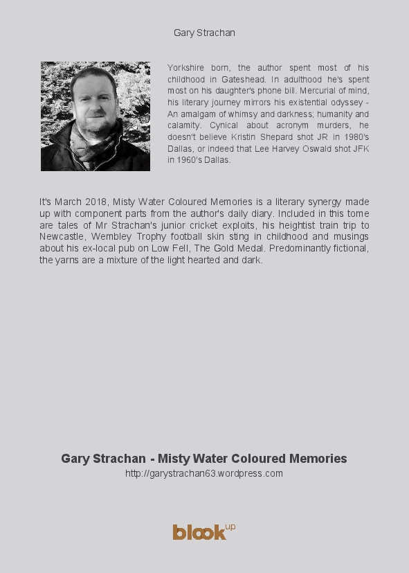 It's March 2018, Misty Water Coloured Memories is a literary synergy made up with component parts from the author's daily diary. Included in this tome are tales of Mr Strachan's junior cricket exploits, his heightist train trip to Newcastle, Wembley Trophy football skin sting in childhood and musings about his ex-local pub on Low Fell, The Gold Medal. Predominantly fictional, the yarns are a mixture of the light hearted and dark.