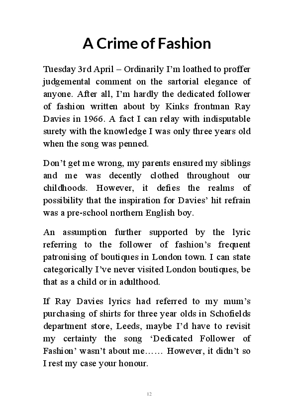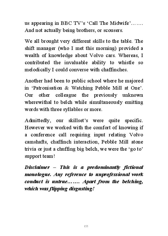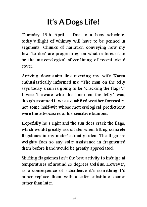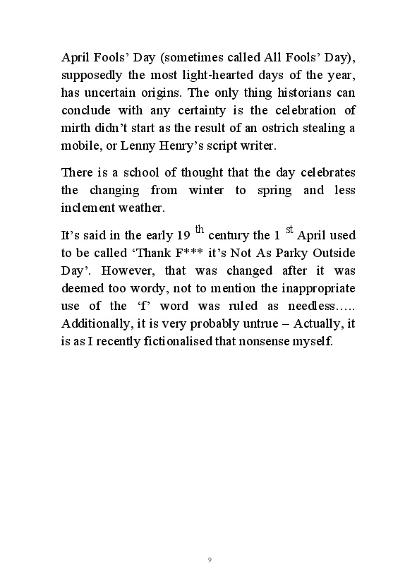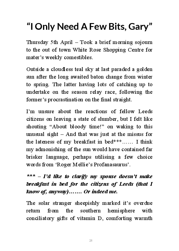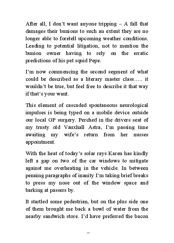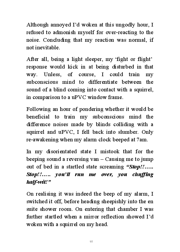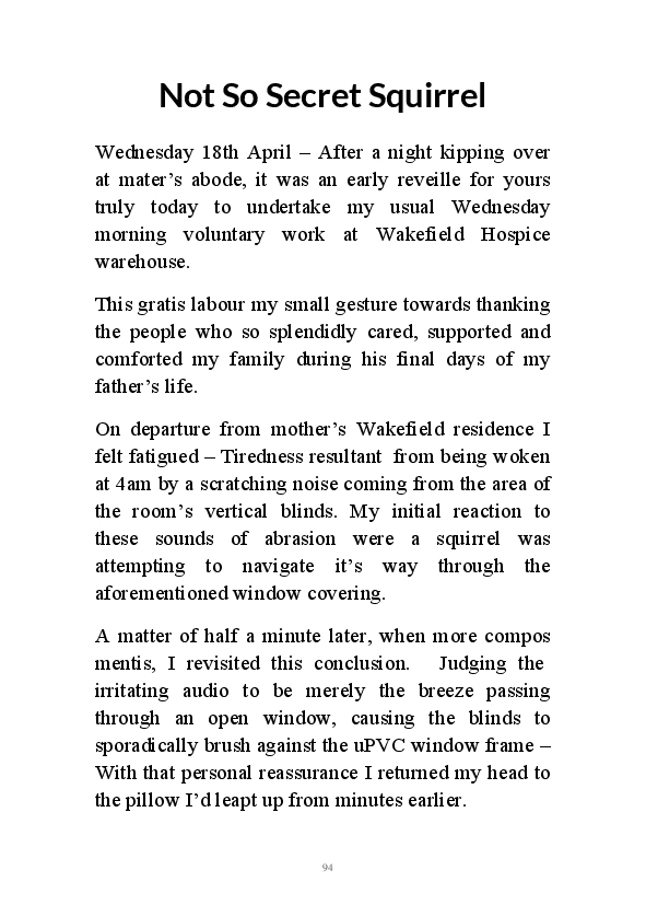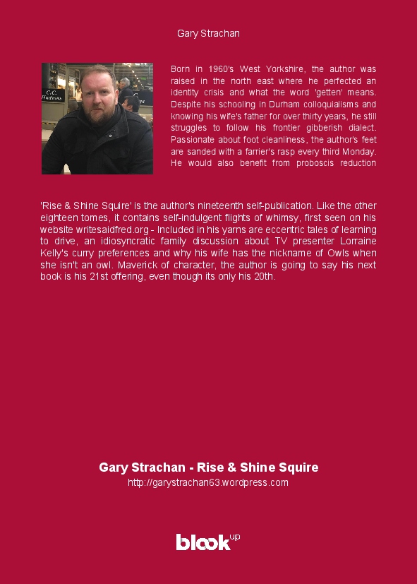 'Rise & Shine Squire' is the author's nineteenth self-publication. Like the other eighteen tomes, it contains self-indulgent flights of whimsy, first seen on his website writesaidfred.org - Included in his yarns are eccentric tales of learning to drive, an idiosyncratic family discussion about TV presenter Lorraine Kelly's curry preferences and why his wife has the nickname of Owls when she isn't an owl. Maverick of character, the author is going to say his next book is his 21st offering, even though its only his 20th.