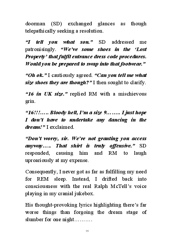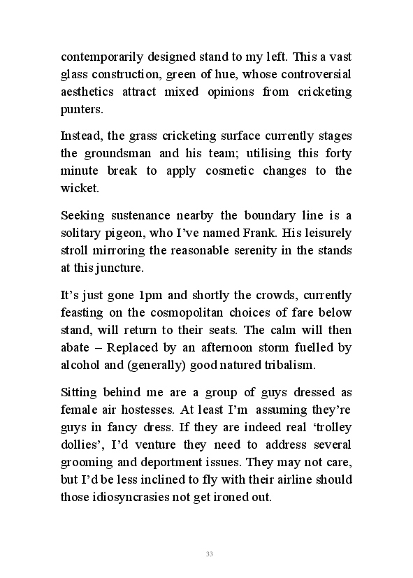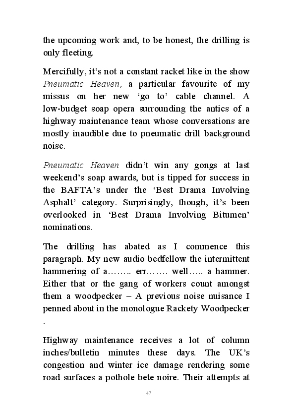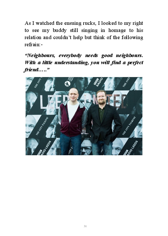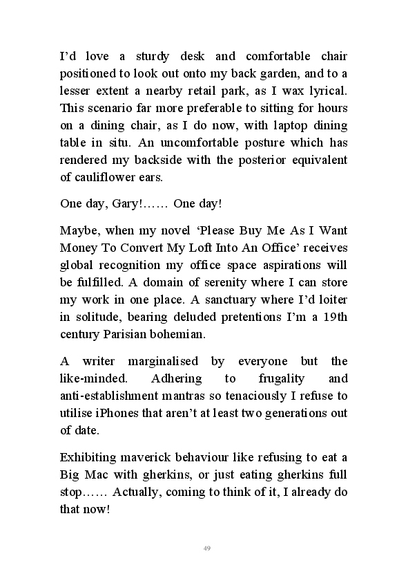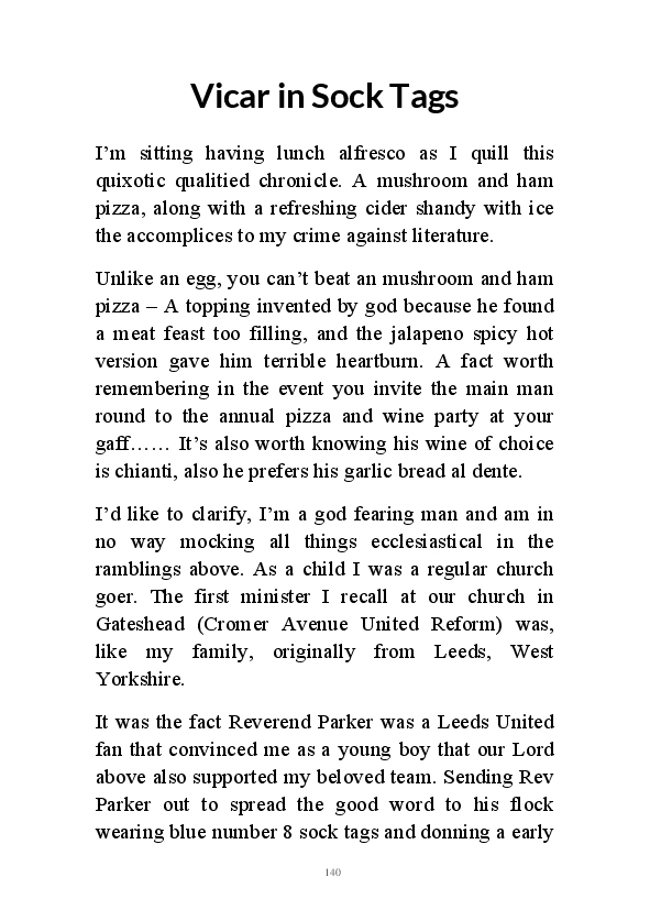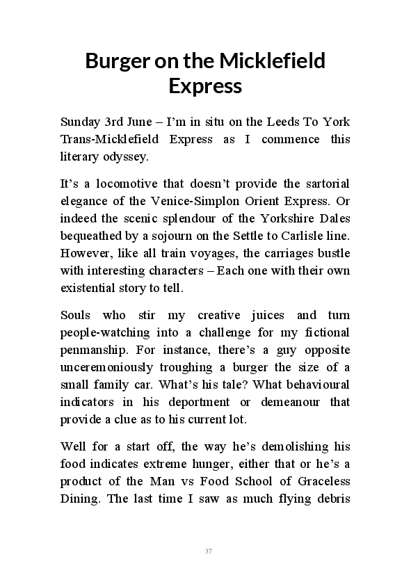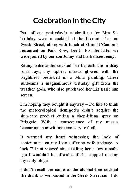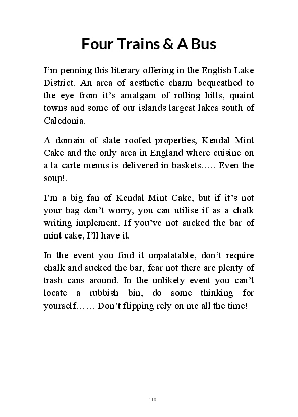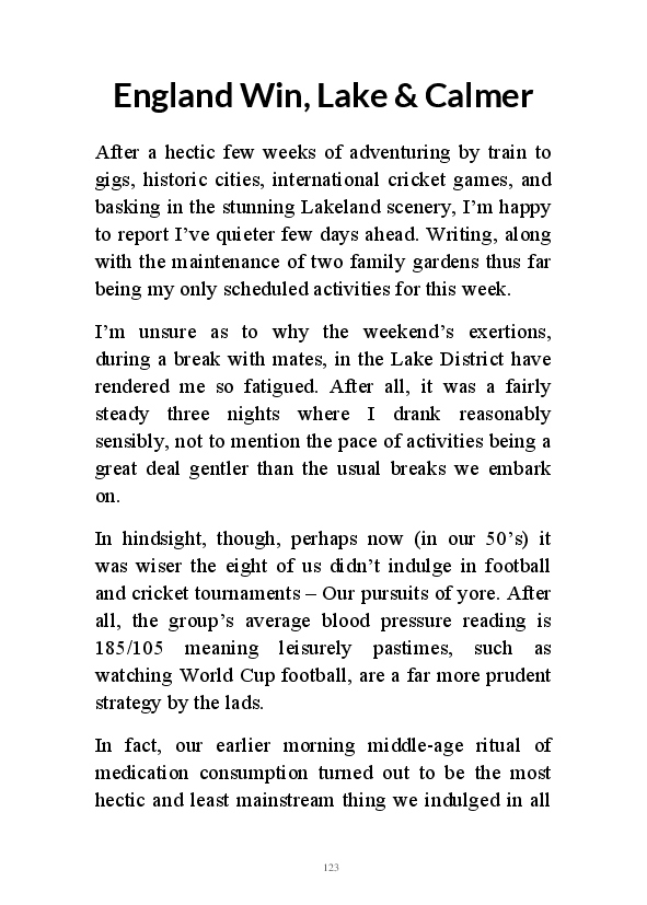Yarns include reviews of gigs he attended during the period in the cities of London and Oxford, pedestrian tales of middle age men holidaying in the Lake District, along with his foolish proposal to change his name by deed poll to Mr Spoons.