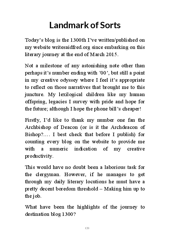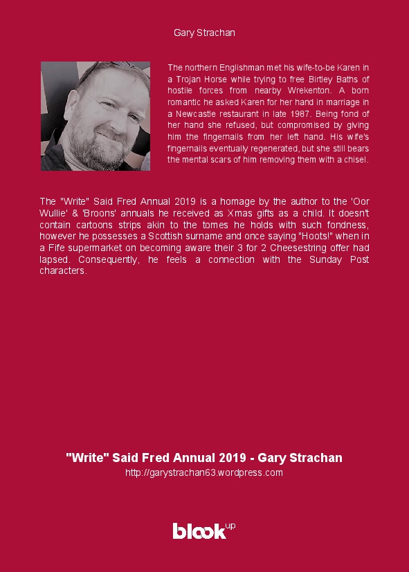 The "Write" Said Fred Annual 2019 is a homage by the author to the 'Oor Wullie' & 'Broons' annuals he received as Xmas gifts as a child. It doesn't contain cartoons strips akin to the tomes he holds with such fondness, however he possesses a Scottish surname and once saying "Hoots!" when in a Fife supermarket on becoming aware their 3 for 2 Cheesestring offer had lapsed. Consequently, he feels a connection with the Sunday Post characters.