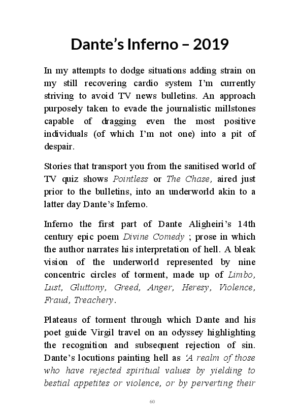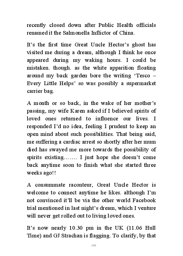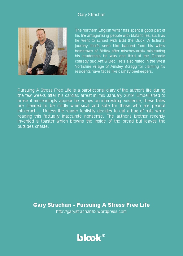 Pursuing A Stress Free Life is a part-fictional diary of the author's life during the few weeks after his cardiac arrest in mid January 2019. Embellished to make it misleadingly appear he enjoys an interesting existence, these tales are claimed to be mildly whimsical and safe for those who are peanut intolerant..... Unless the reader foolishly decides to eat a bag of nuts while reading this factually inaccurate nonsense. The author's brother recently invented a toaster which browns the inside of the bread but leaves the outsides chaste.