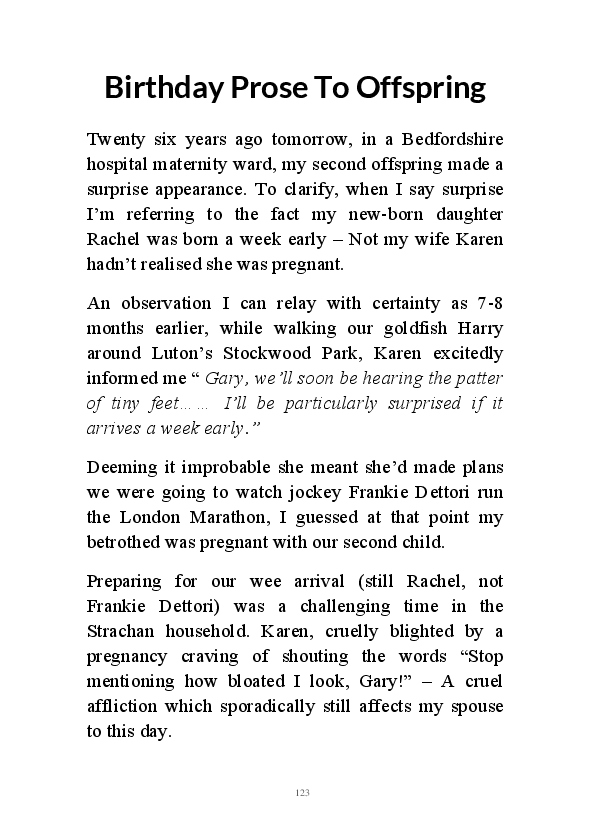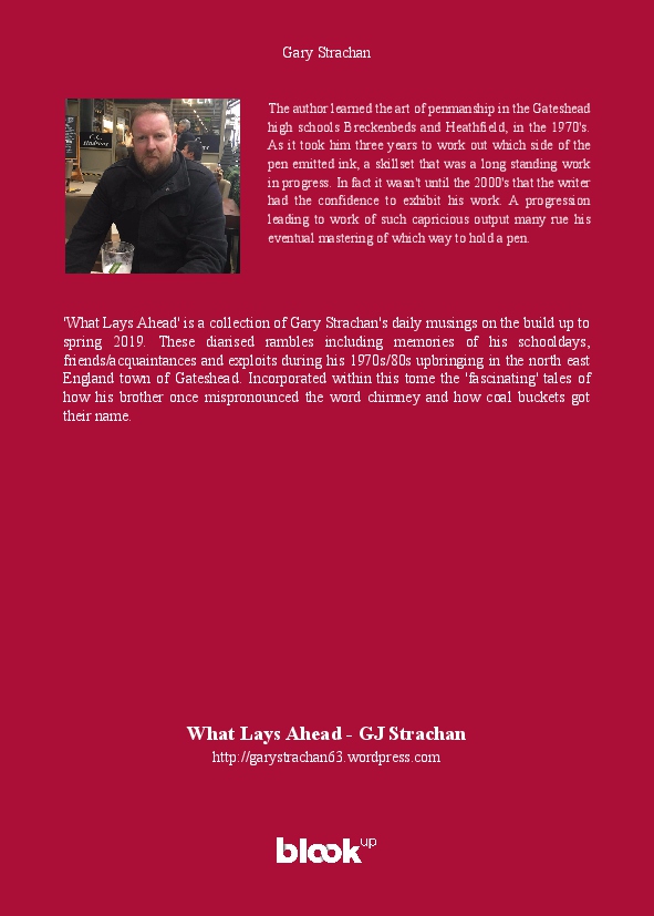 'What Lays Ahead' is a collection of Gary Strachan's daily musings on the build up to spring 2019. These diarised rambles including memories of his schooldays, friends/acquaintances and exploits during his 1970s/80s upbringing in the north east England town of Gateshead. Incorporated within this tome the 'fascinating' tales of how his brother once mispronounced the word chimney and how coal buckets got their name.