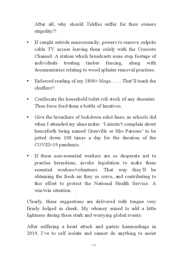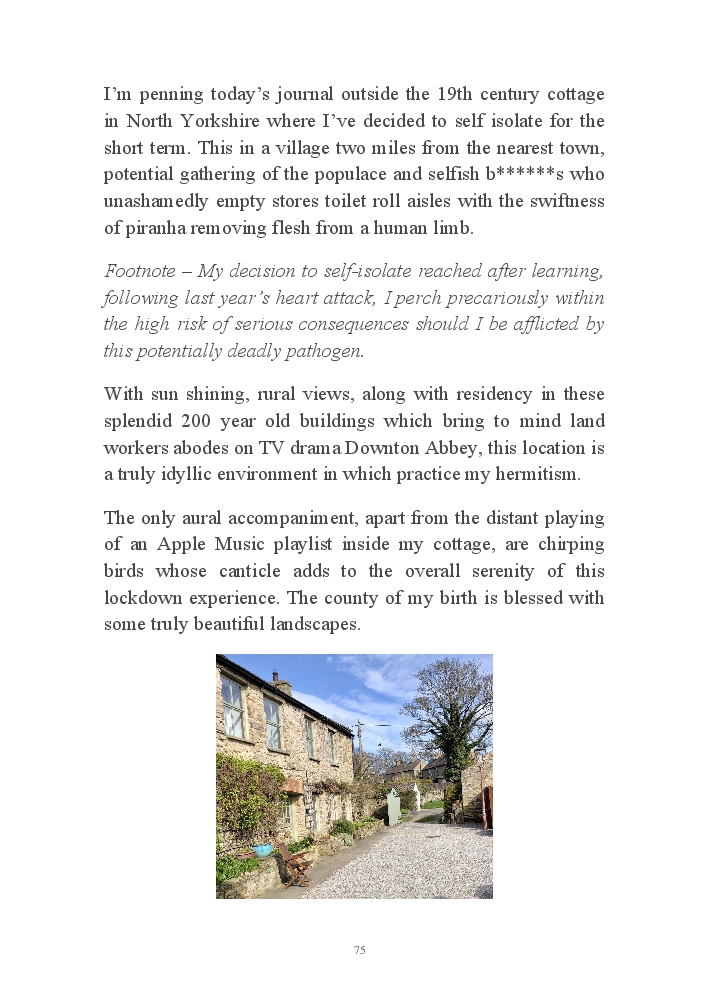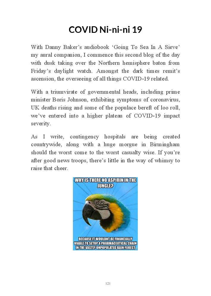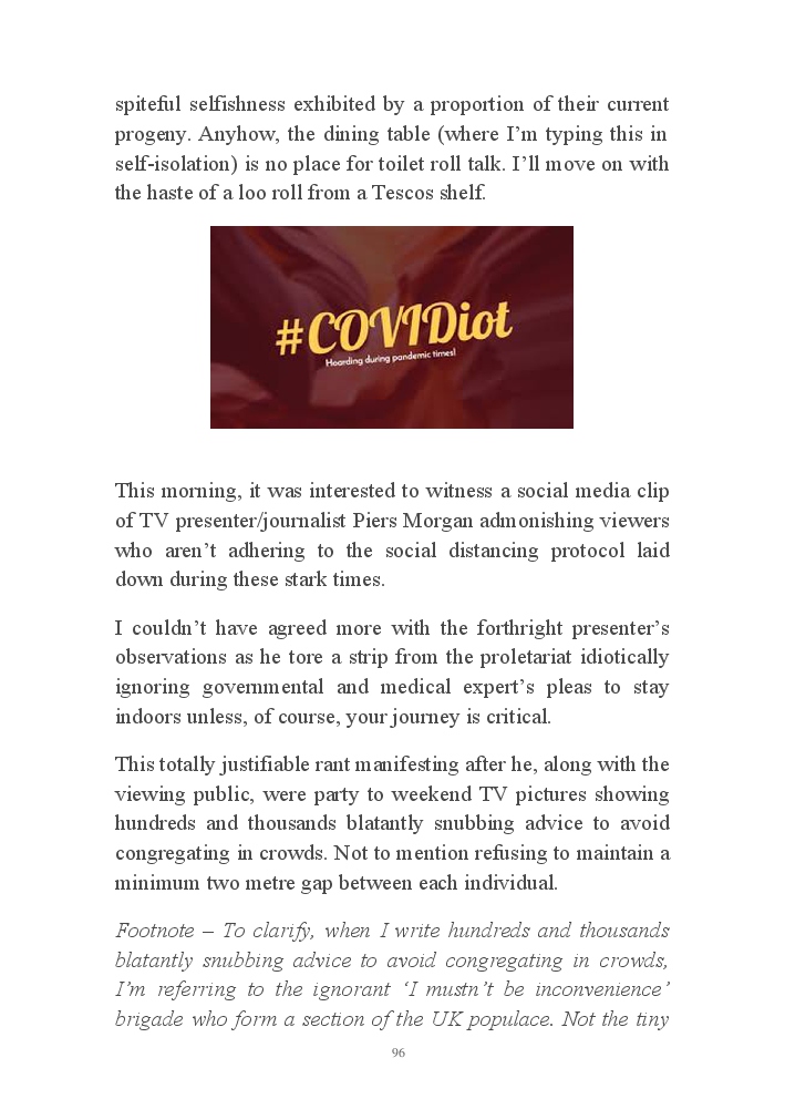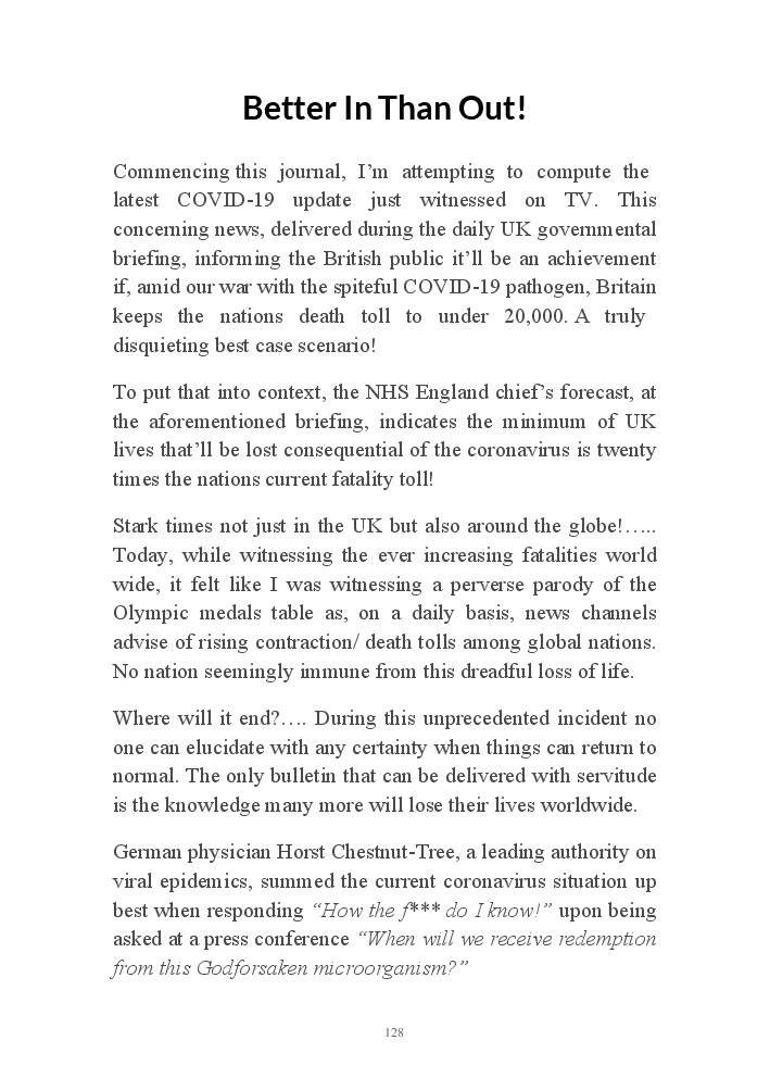 Corona Chronicles - Volume One affords exactly what it says on the tin, ie providing the authors daily journals penned in March 2020, a month where the pandemic COVID-19 took hold upon his UK homeland. This prose an amalgam of whimsy and the utter darkness at living with an indiscriminate pathogen steadfastly fixed on destroying live. Incidentally, that's the coronavirus he's referring to not his mother, who's house he now resides.