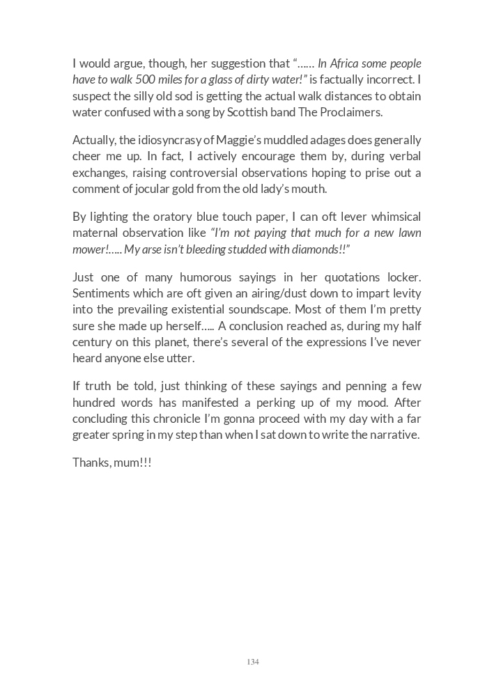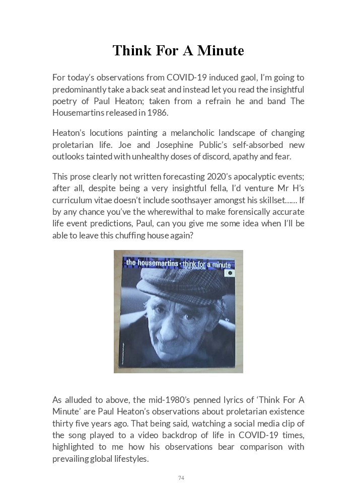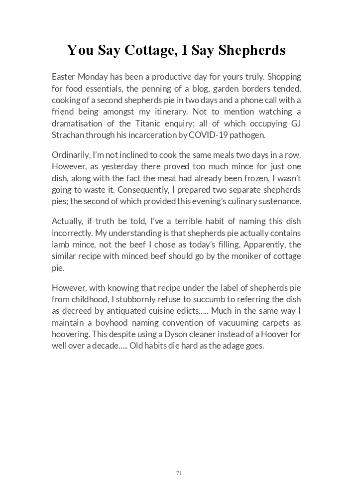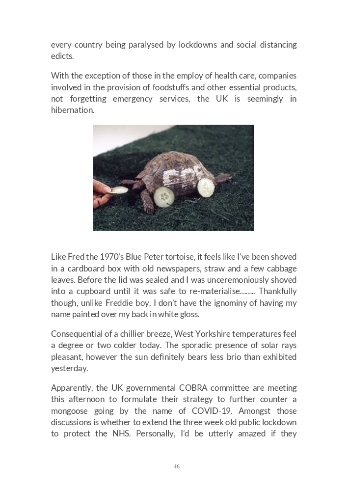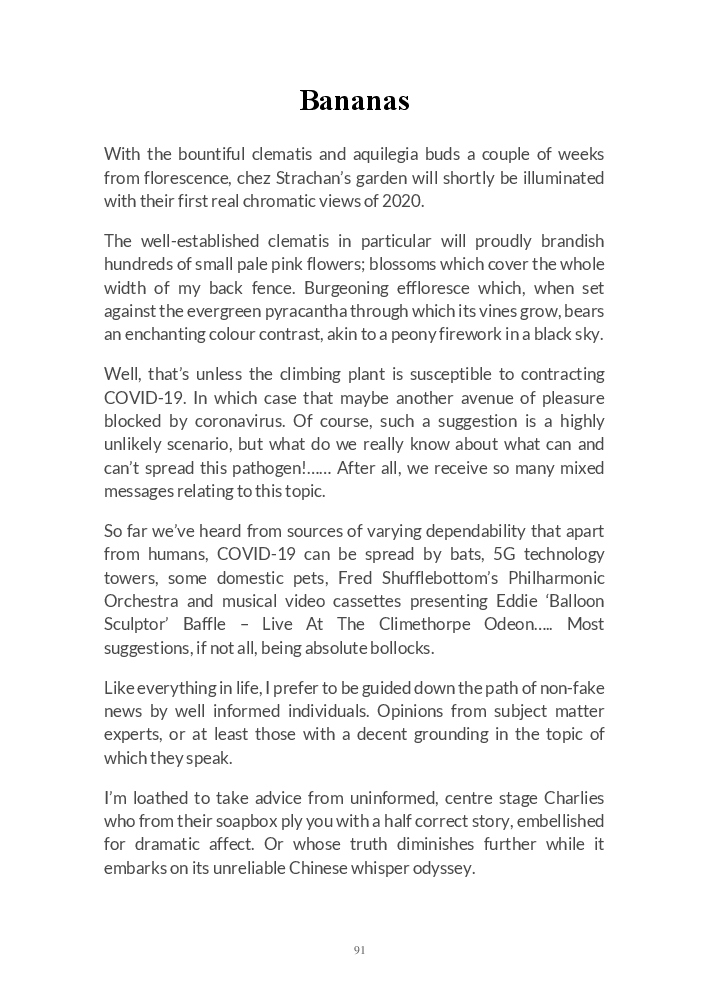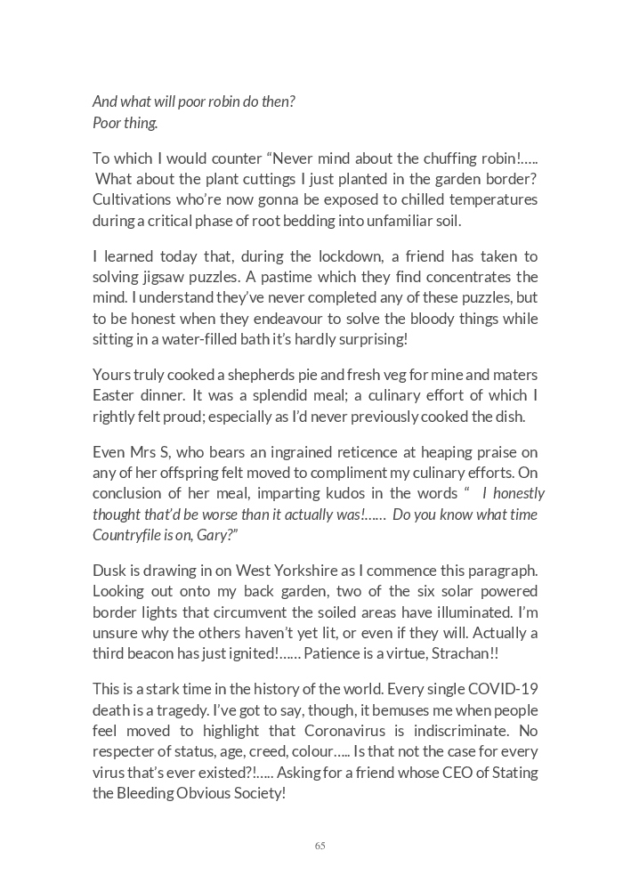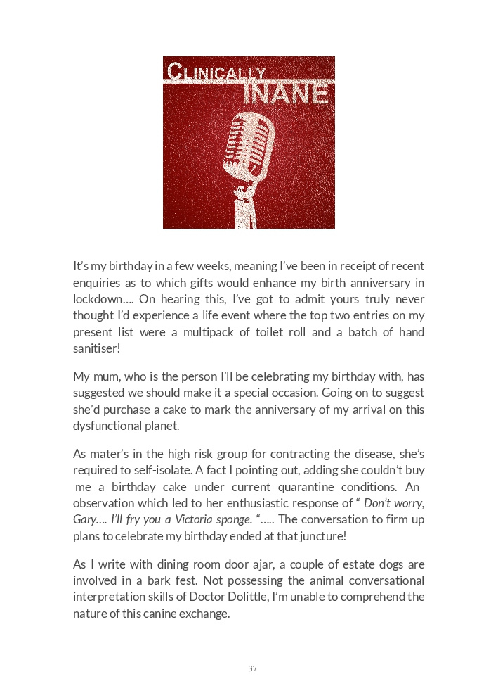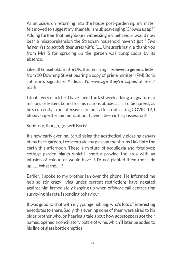 Corona Chronicles. - Vol 2 are the author's journals from April 2020 among a backdrop of COVID-19 induced lockdown. An amalgam of jocular and dark chronicles, they describe living through an era of pandemic, requiring adherence to social distancing edicts, along with governmental advocacies to practise hermitry. These narratives include spending a birthday in quarantine, the sad passing of two of his childhood footballing heroes and the angst from knowing he can't have a haircut for three months. Always endeavouring to take positives from situations, the author reflects on these surreal times by observing "Well at least I didn't have to buy a bloody round for a few months!"