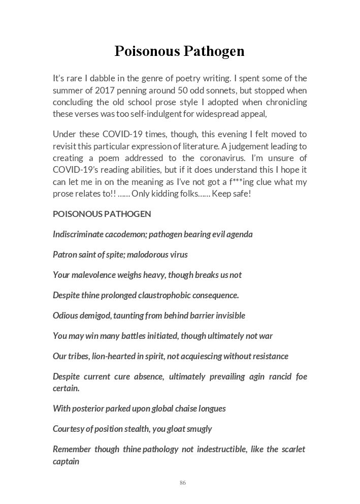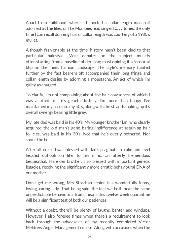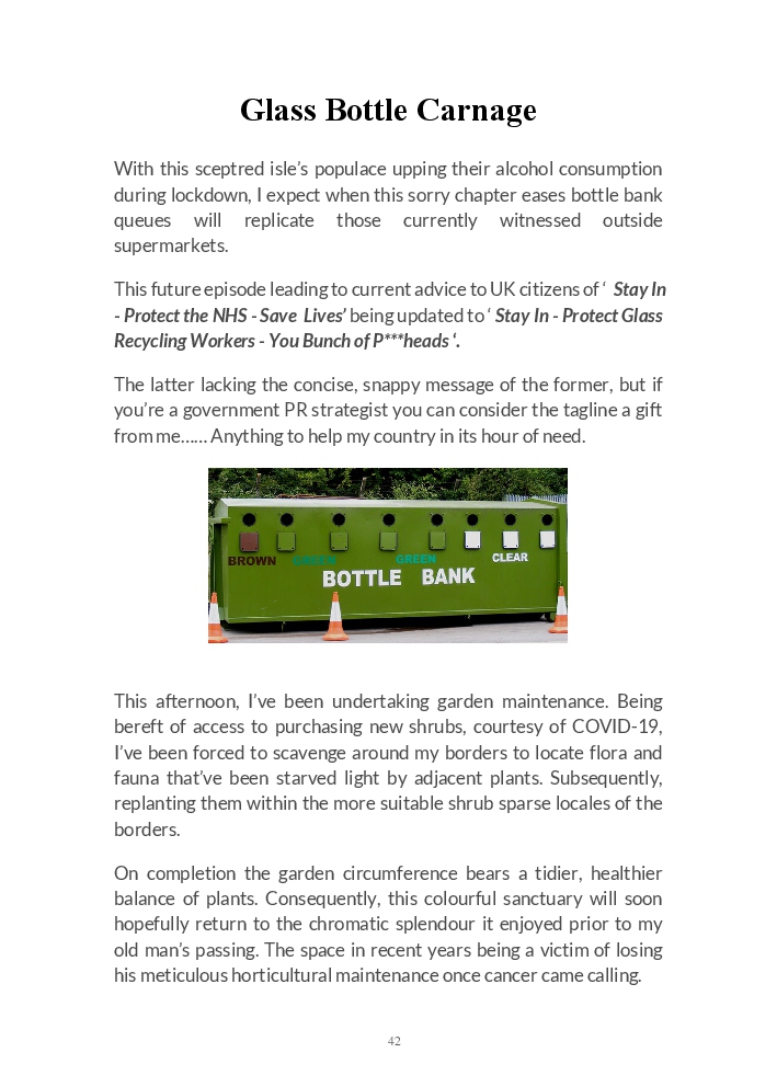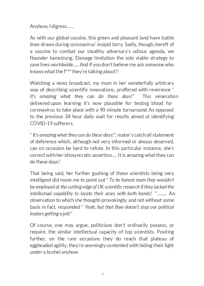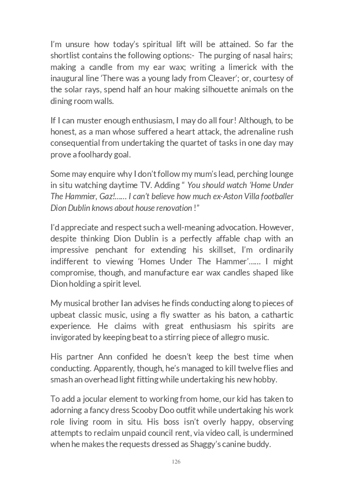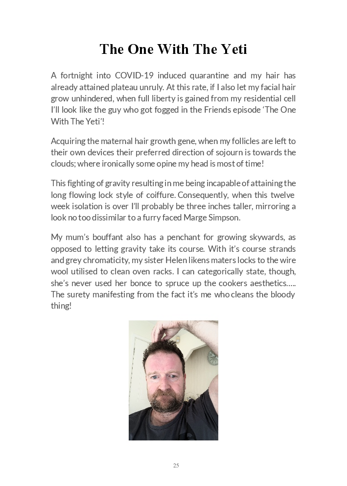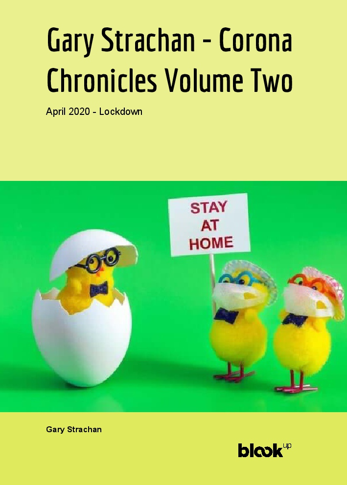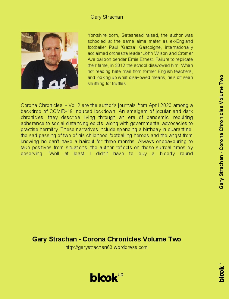 Corona Chronicles. - Vol 2 are the author's journals from April 2020 among a backdrop of COVID-19 induced lockdown. An amalgam of jocular and dark chronicles, they describe living through an era of pandemic, requiring adherence to social distancing edicts, along with governmental advocacies to practise hermitry. These narratives include spending a birthday in quarantine, the sad passing of two of his childhood footballing heroes and the angst from knowing he can't have a haircut for three months. Always endeavouring to take positives from situations, the author reflects on these surreal times by observing "Well at least I didn't have to buy a bloody round for a few months!"