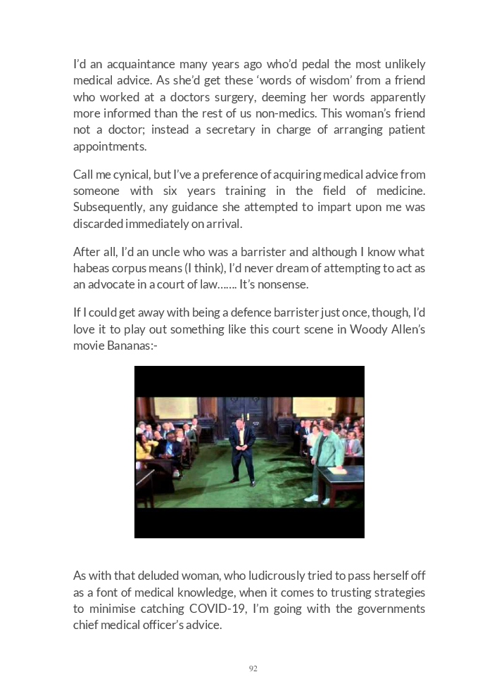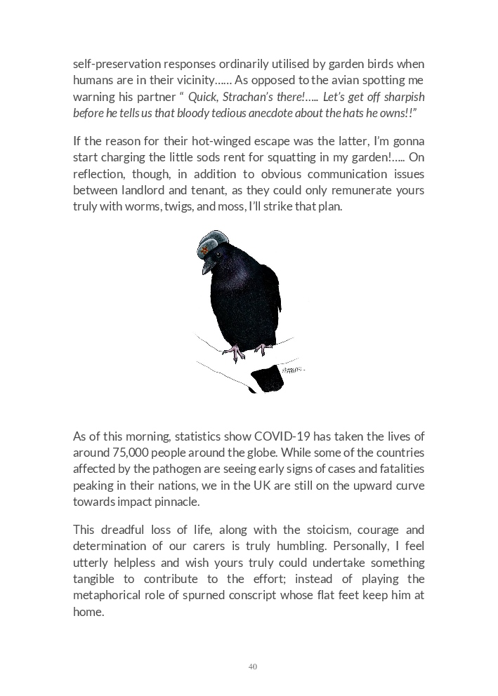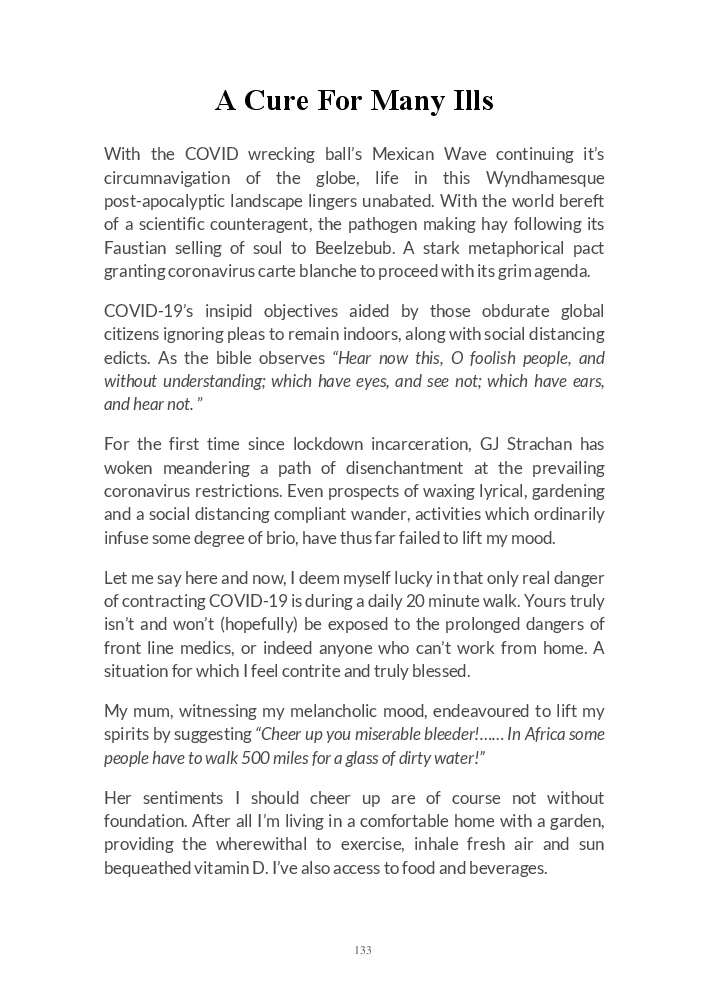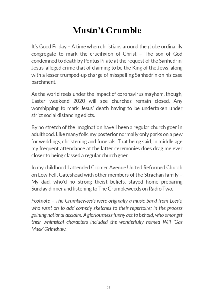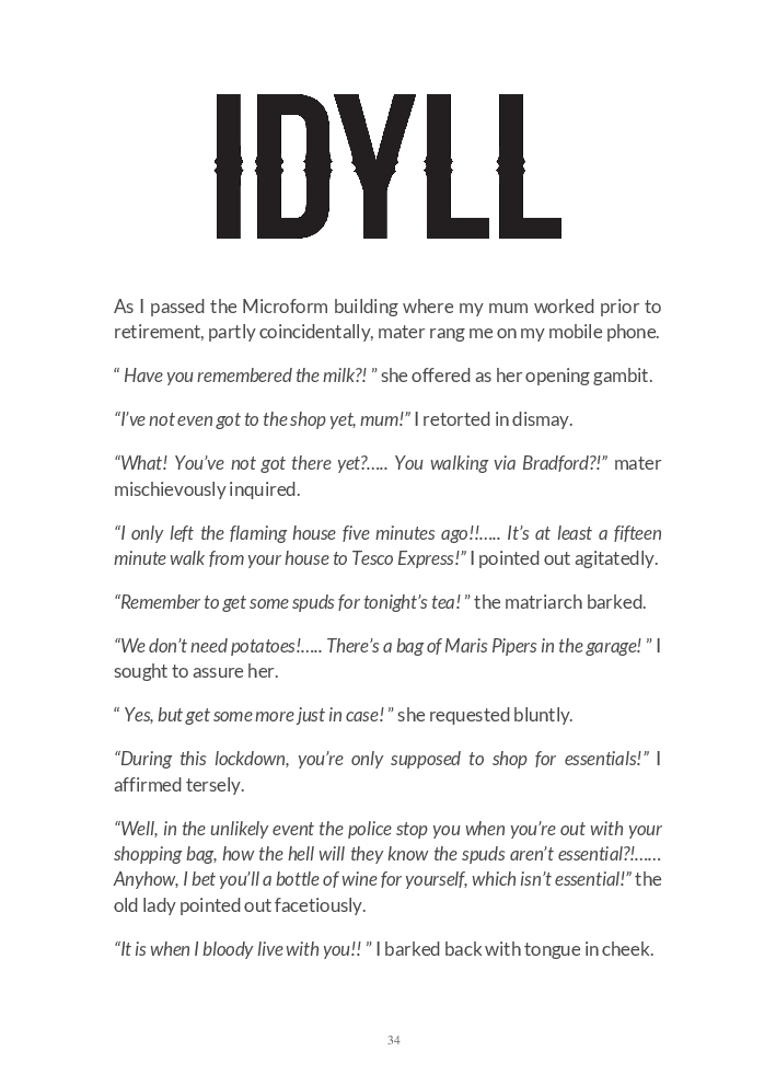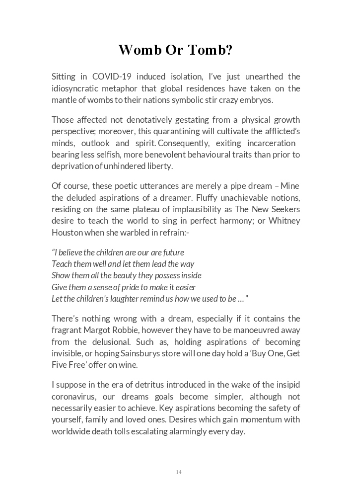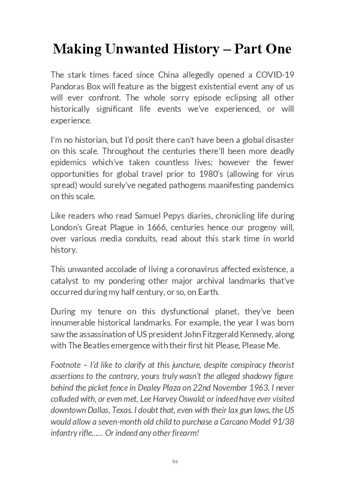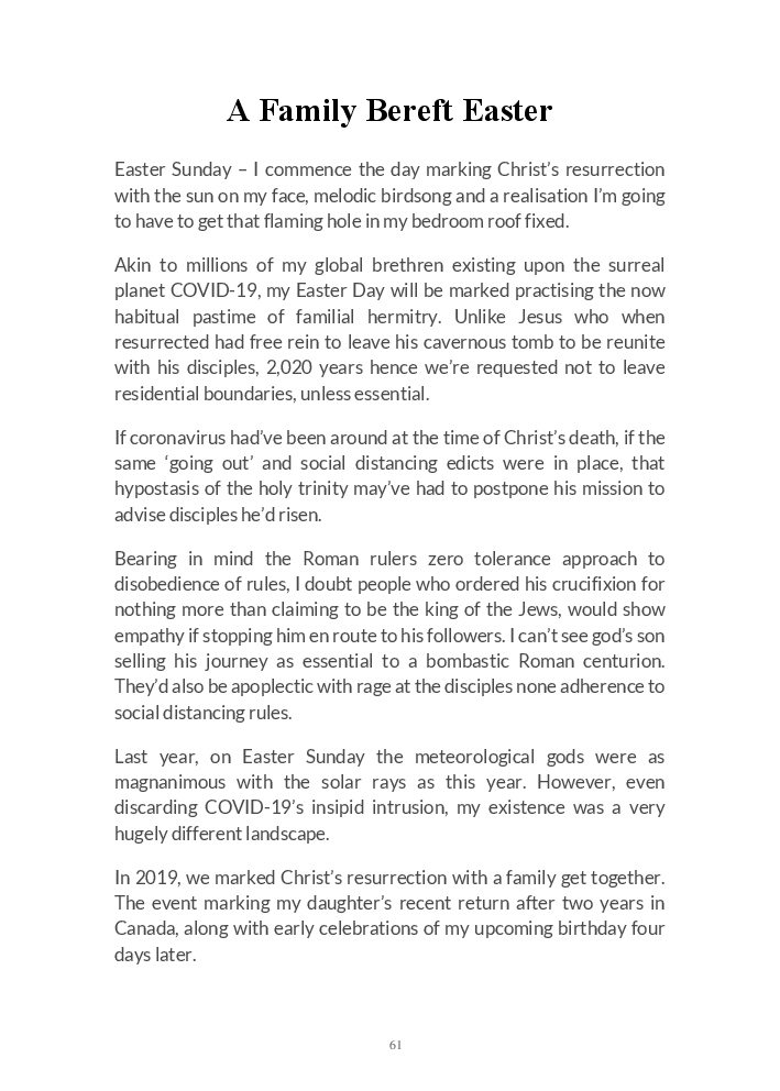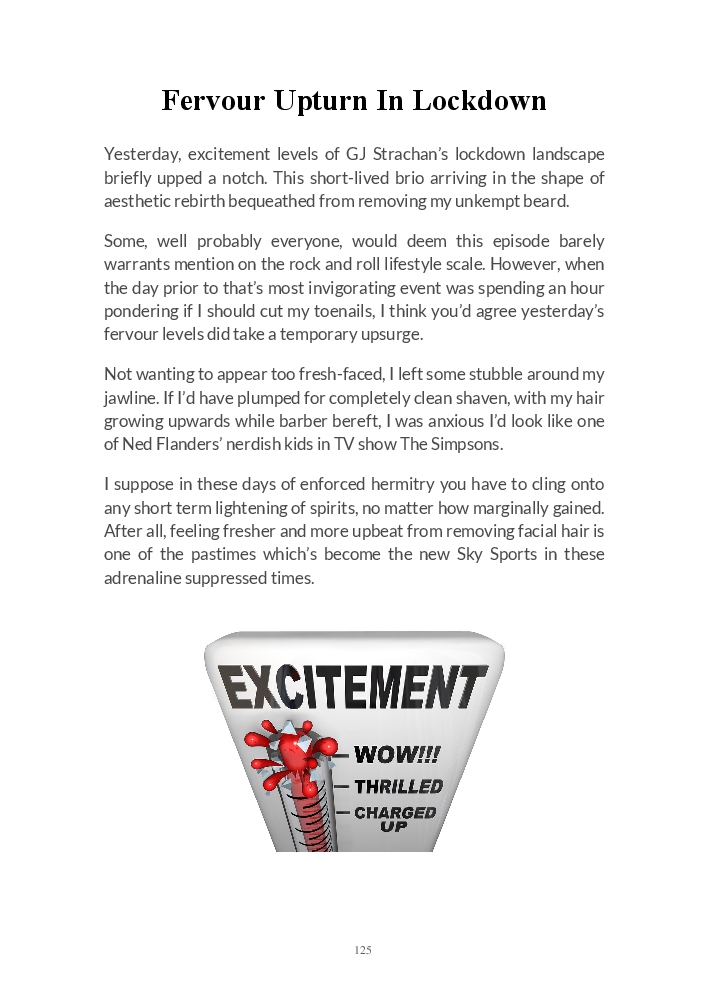 Corona Chronicles. - Vol 2 are the author's journals from April 2020 among a backdrop of COVID-19 induced lockdown. An amalgam of jocular and dark chronicles, they describe living through an era of pandemic, requiring adherence to social distancing edicts, along with governmental advocacies to practise hermitry. These narratives include spending a birthday in quarantine, the sad passing of two of his childhood footballing heroes and the angst from knowing he can't have a haircut for three months. Always endeavouring to take positives from situations, the author reflects on these surreal times by observing "Well at least I didn't have to buy a bloody round for a few months!"