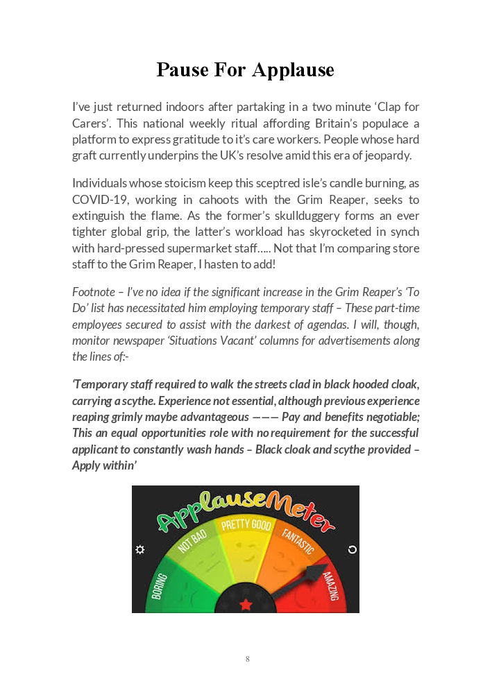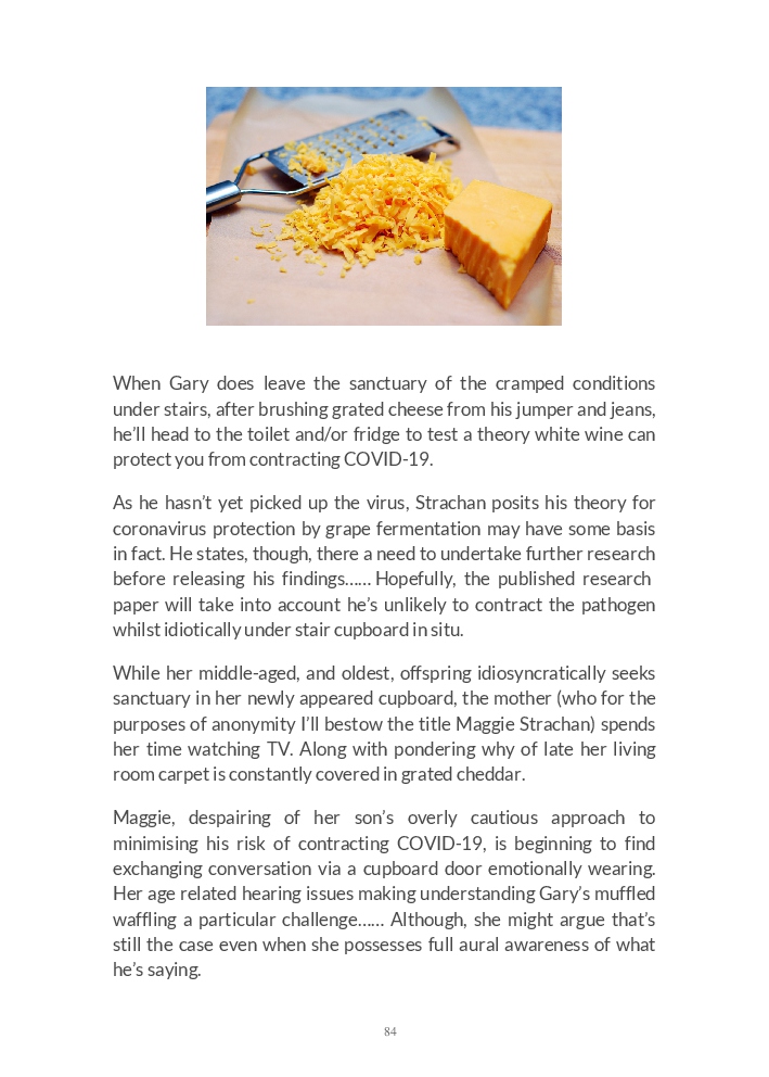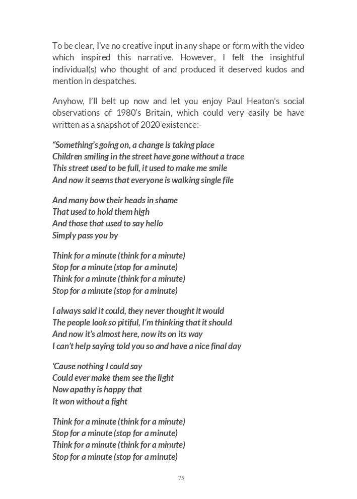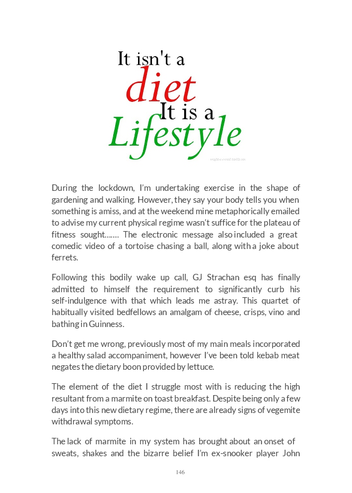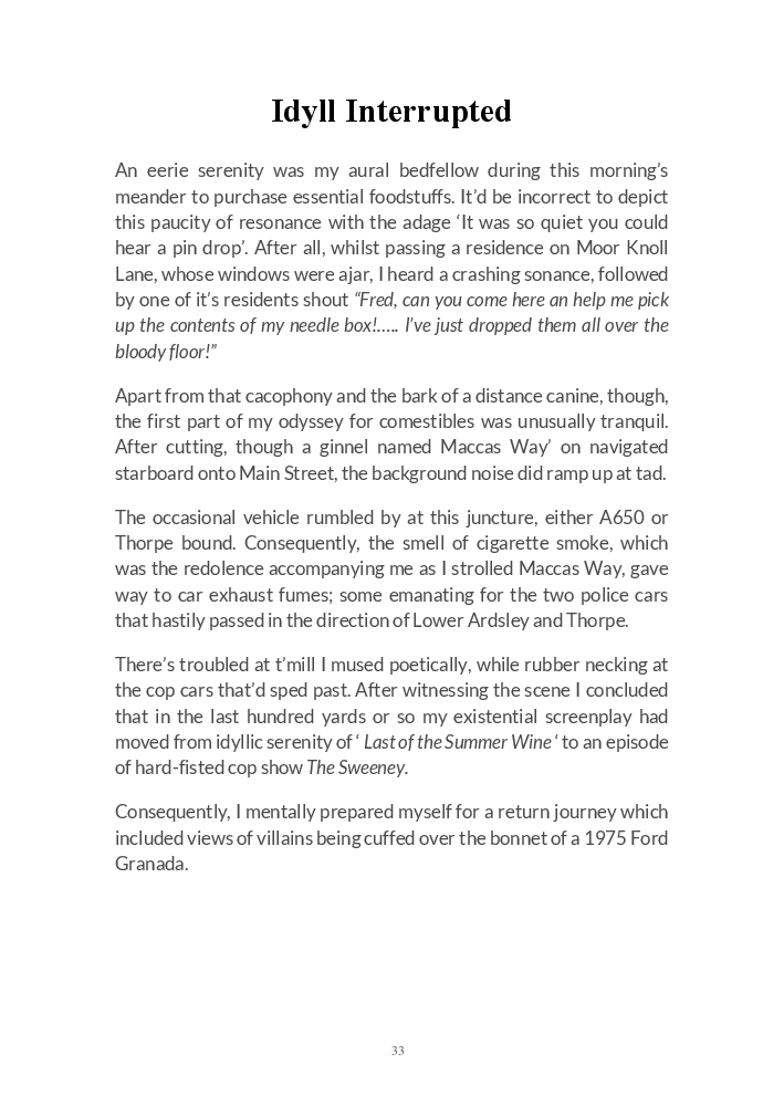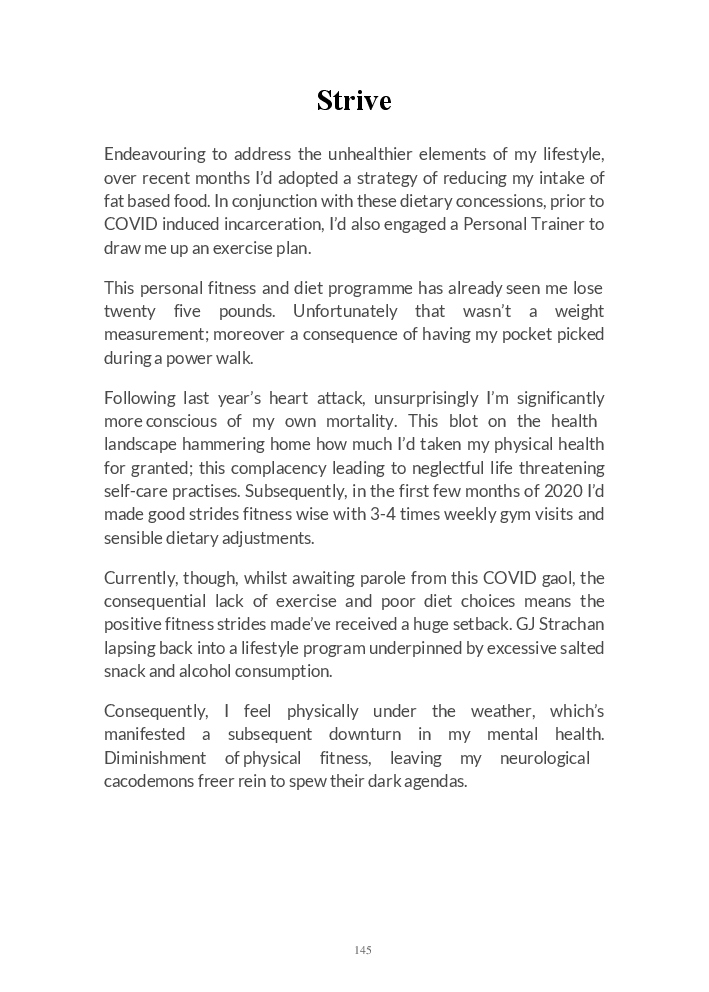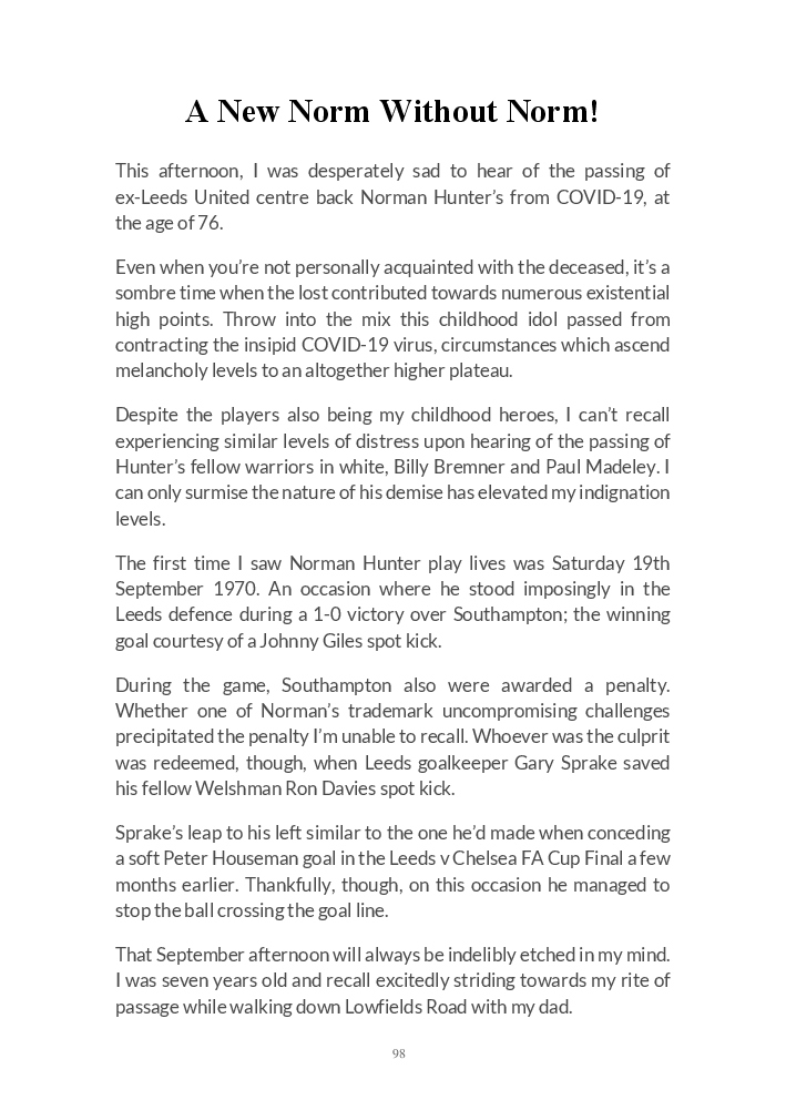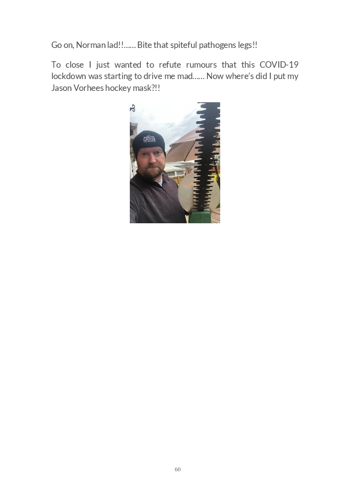 Corona Chronicles. - Vol 2 are the author's journals from April 2020 among a backdrop of COVID-19 induced lockdown. An amalgam of jocular and dark chronicles, they describe living through an era of pandemic, requiring adherence to social distancing edicts, along with governmental advocacies to practise hermitry. These narratives include spending a birthday in quarantine, the sad passing of two of his childhood footballing heroes and the angst from knowing he can't have a haircut for three months. Always endeavouring to take positives from situations, the author reflects on these surreal times by observing "Well at least I didn't have to buy a bloody round for a few months!"