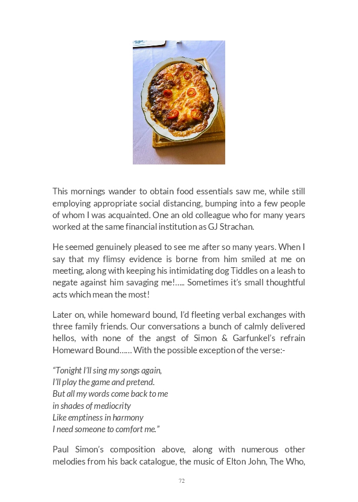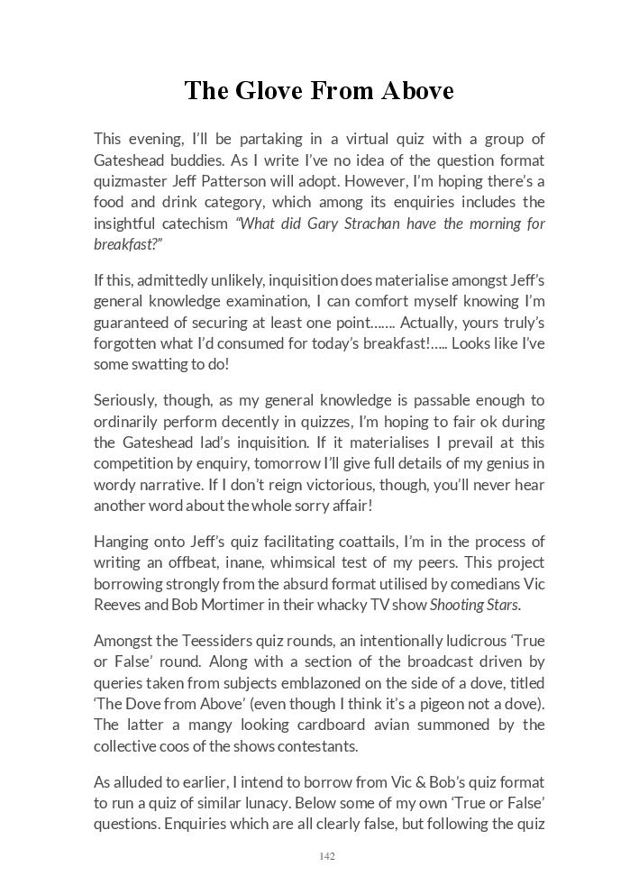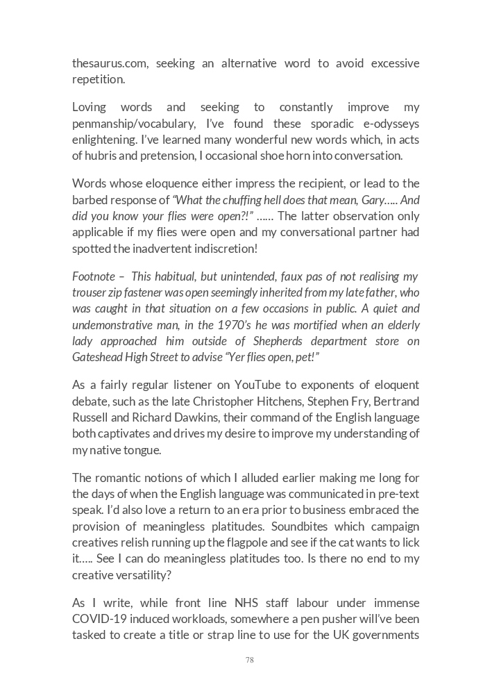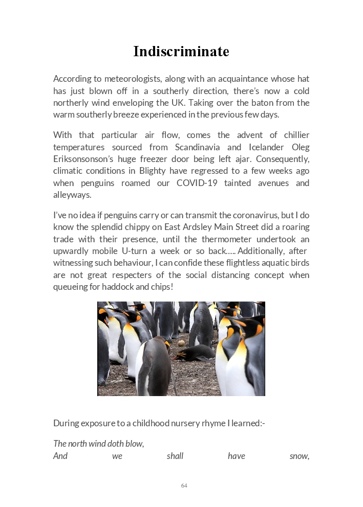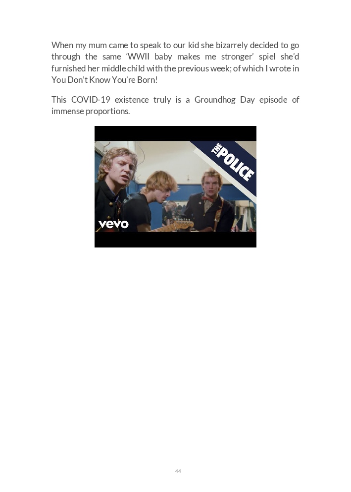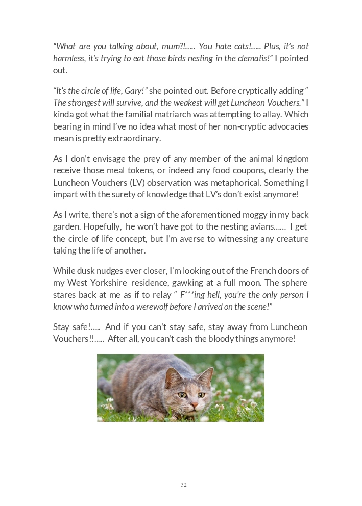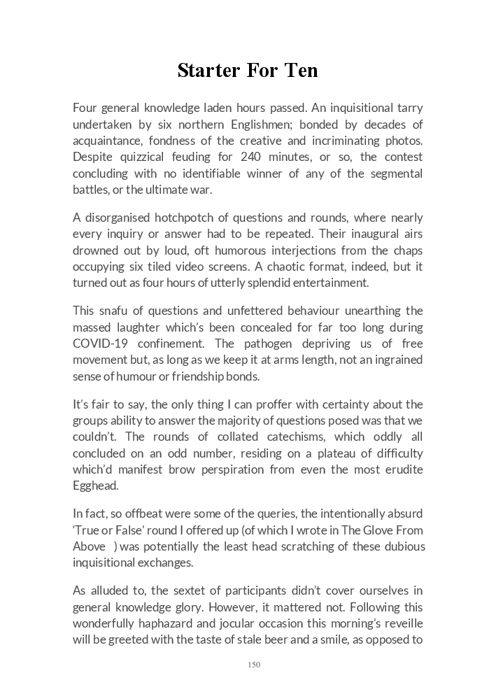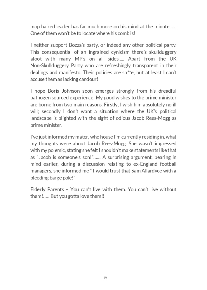 Corona Chronicles. - Vol 2 are the author's journals from April 2020 among a backdrop of COVID-19 induced lockdown. An amalgam of jocular and dark chronicles, they describe living through an era of pandemic, requiring adherence to social distancing edicts, along with governmental advocacies to practise hermitry. These narratives include spending a birthday in quarantine, the sad passing of two of his childhood footballing heroes and the angst from knowing he can't have a haircut for three months. Always endeavouring to take positives from situations, the author reflects on these surreal times by observing "Well at least I didn't have to buy a bloody round for a few months!"