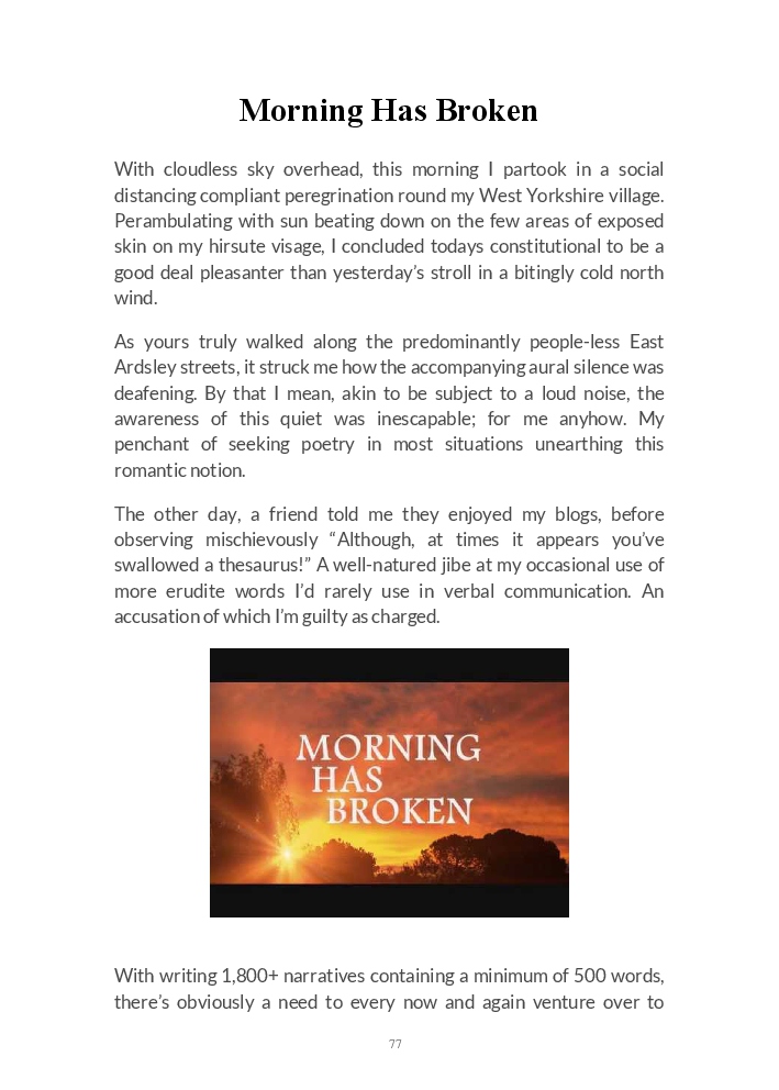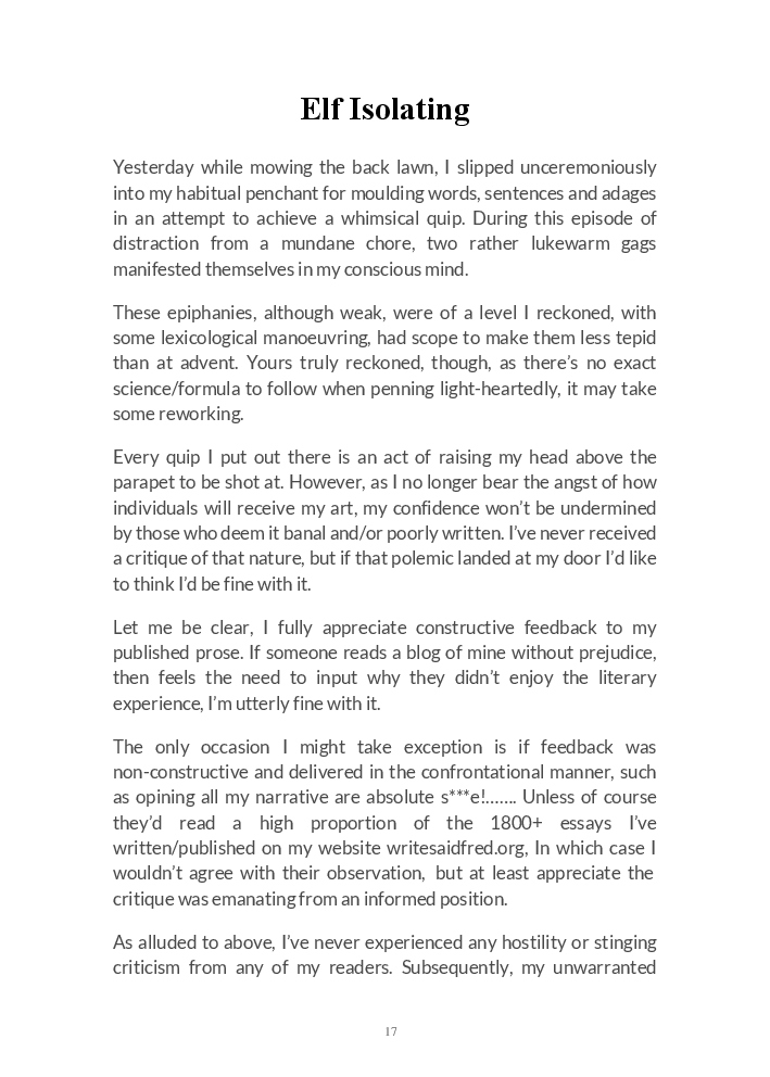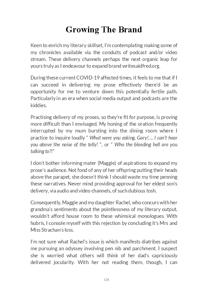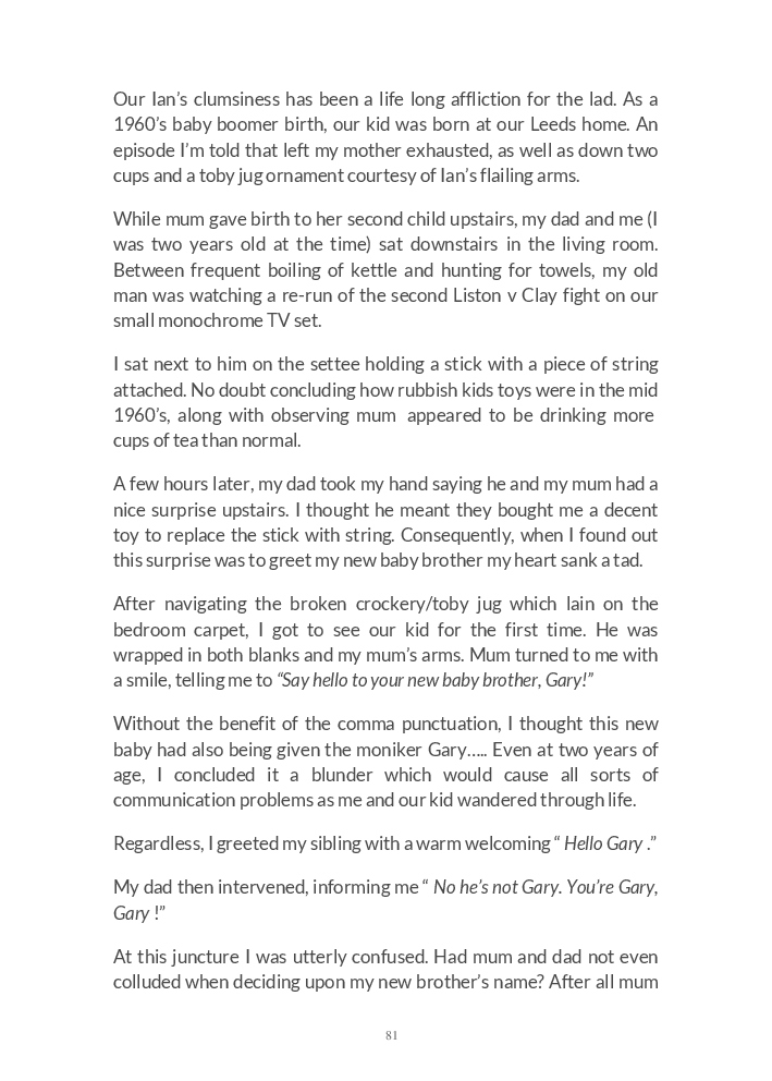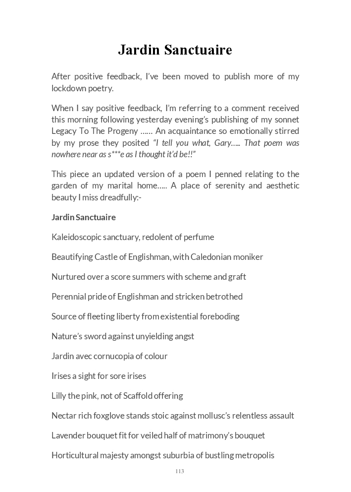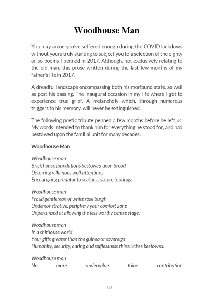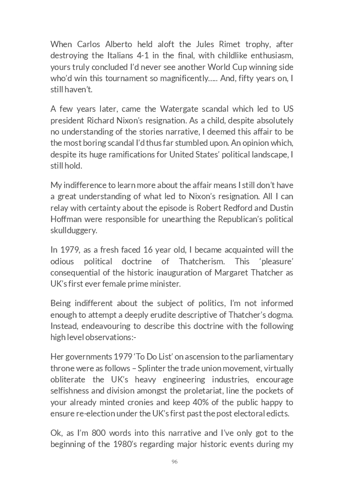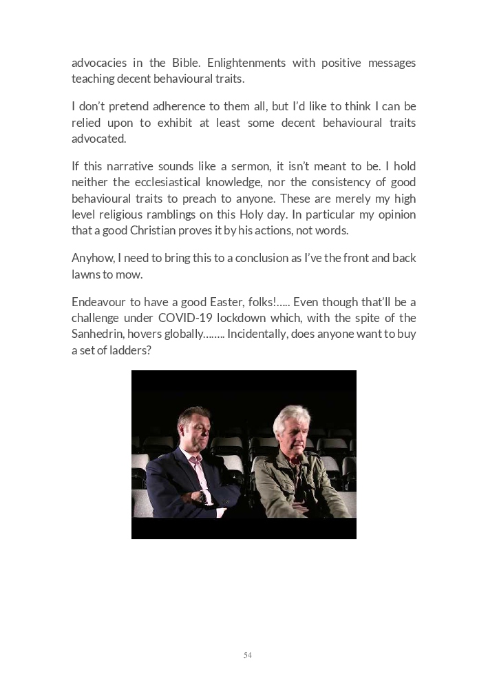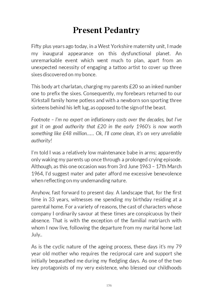 Corona Chronicles. - Vol 2 are the author's journals from April 2020 among a backdrop of COVID-19 induced lockdown. An amalgam of jocular and dark chronicles, they describe living through an era of pandemic, requiring adherence to social distancing edicts, along with governmental advocacies to practise hermitry. These narratives include spending a birthday in quarantine, the sad passing of two of his childhood footballing heroes and the angst from knowing he can't have a haircut for three months. Always endeavouring to take positives from situations, the author reflects on these surreal times by observing "Well at least I didn't have to buy a bloody round for a few months!"