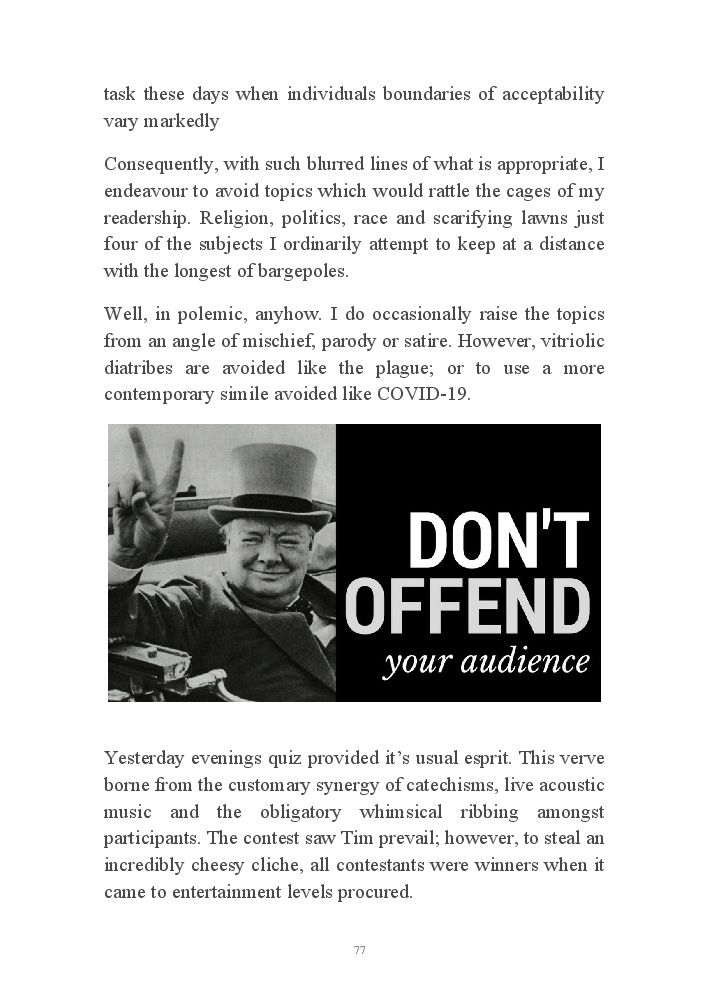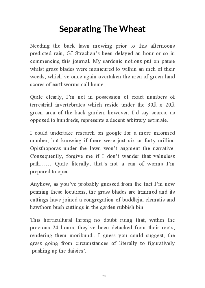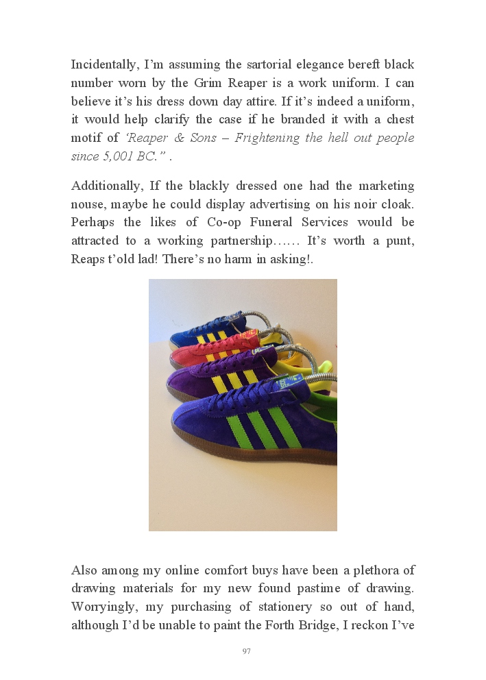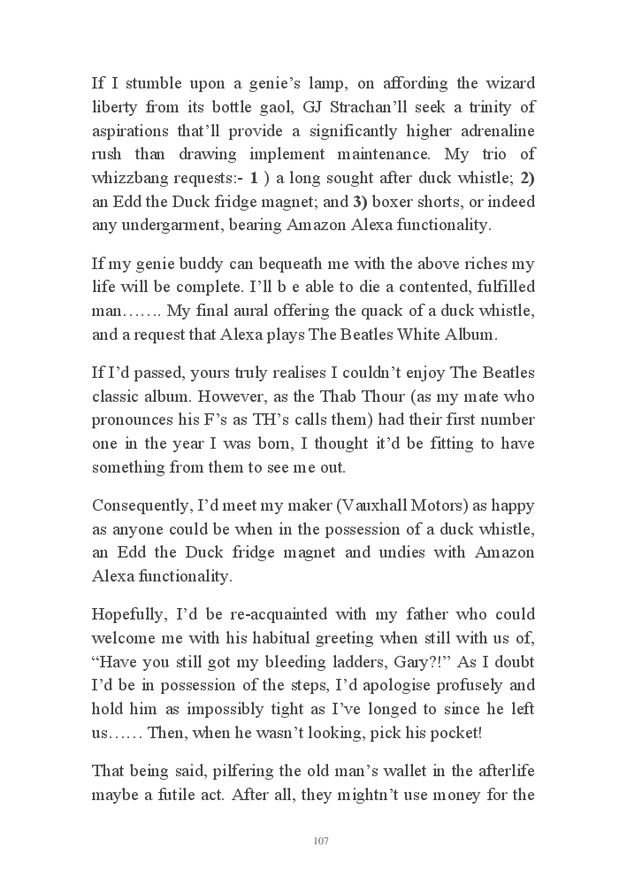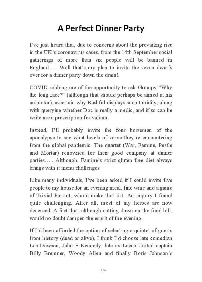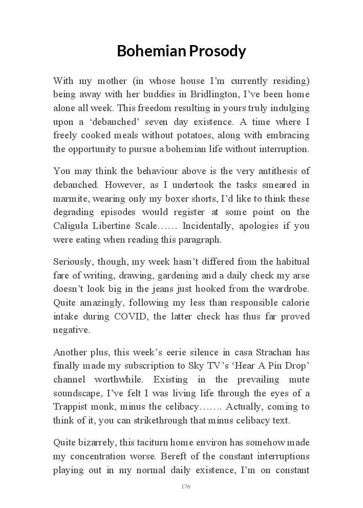 Summer's Dusk 2020 does exactly what it says on the tin...... Well the book cover, anyhow!. Within it's once chaste leaves, further tales of the authors existence in 2020 played out. This time as summer's watch hurtles to it's conclusion here on Planet COVID. The whimsical, partly fictional yarns cover a multitude of topics, such as snooker, the poet Keats, Oscar Wilde, along with tales of quiz nights. The tome also includes a selection of caricatures drawn by Gary Strachan during this period.