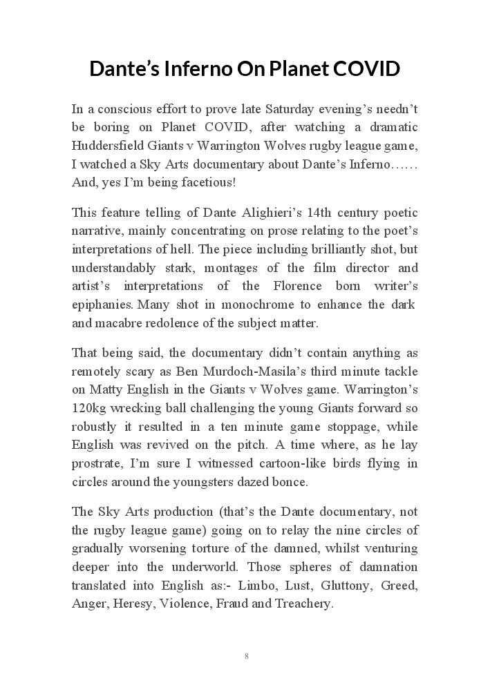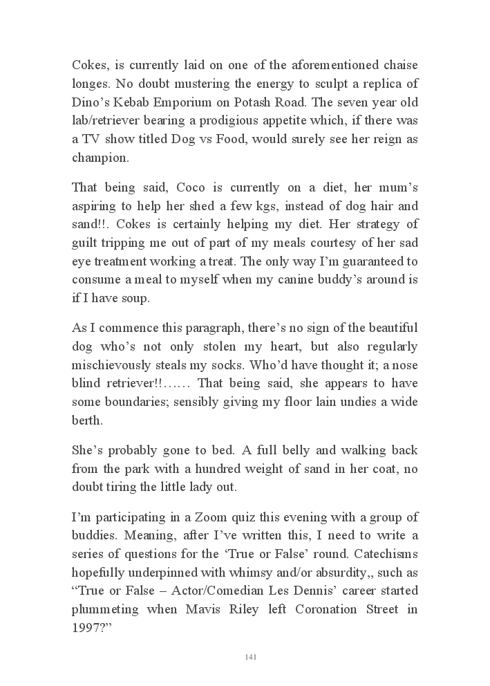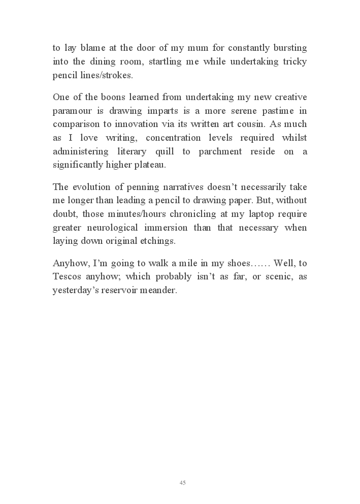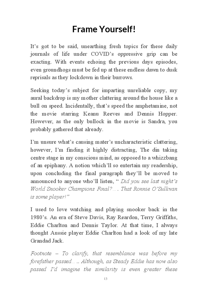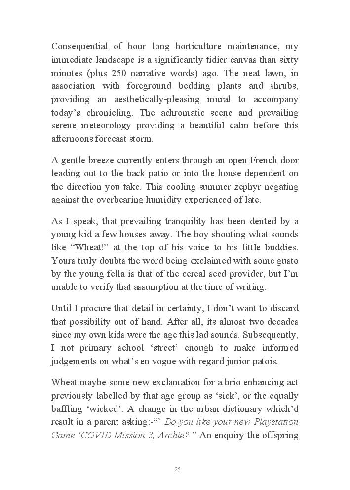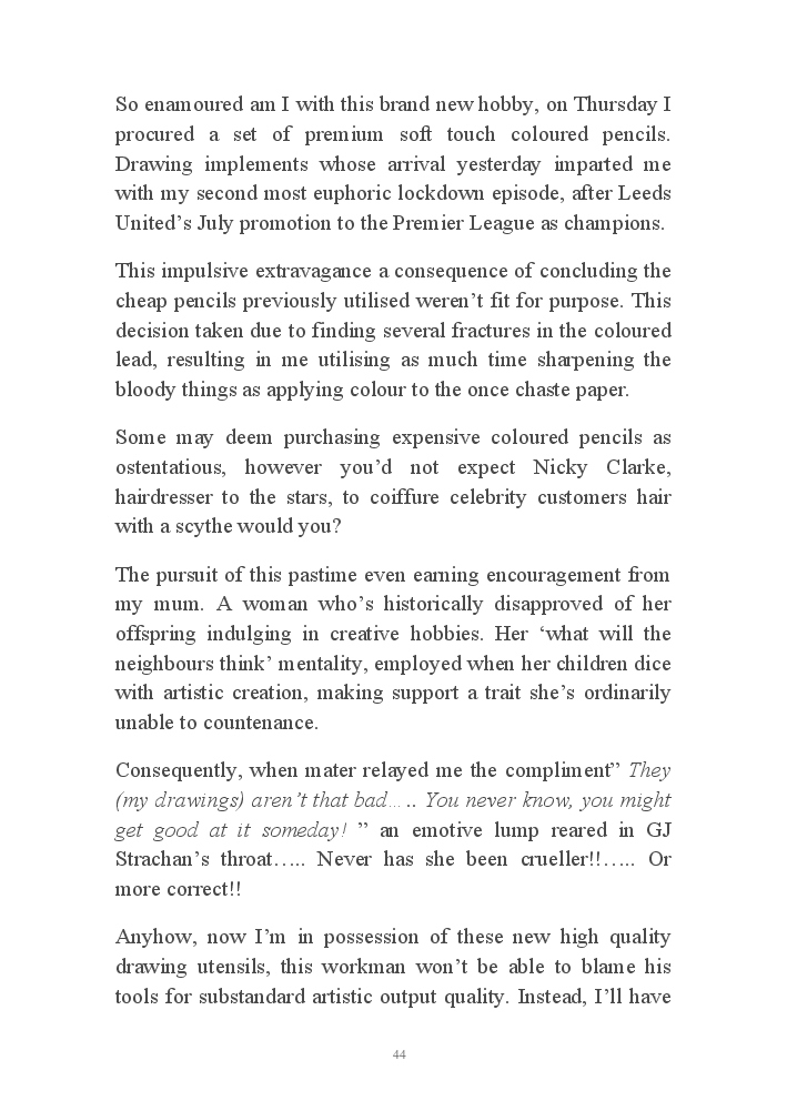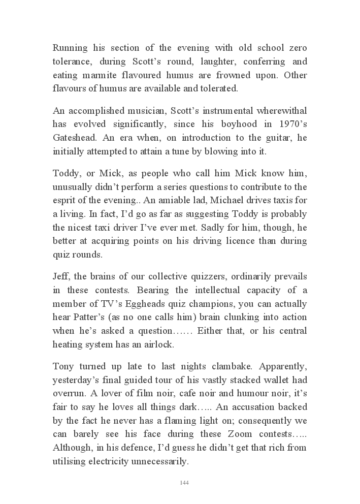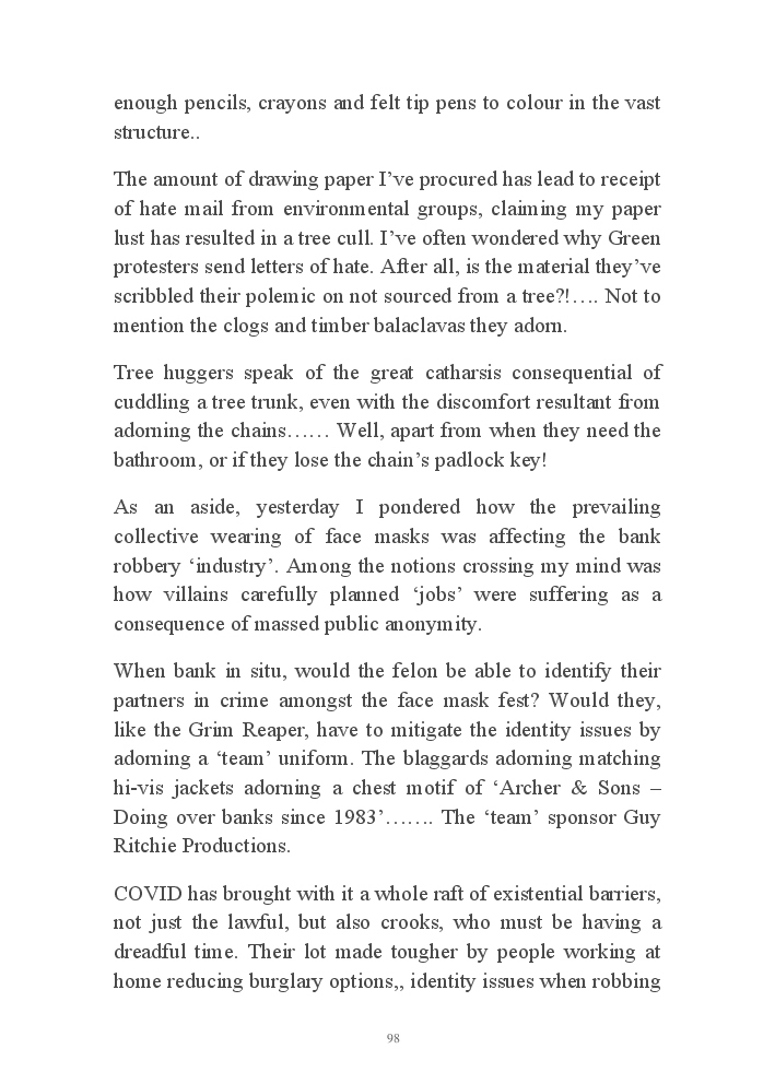 Summer's Dusk 2020 does exactly what it says on the tin...... Well the book cover, anyhow!. Within it's once chaste leaves, further tales of the authors existence in 2020 played out. This time as summer's watch hurtles to it's conclusion here on Planet COVID. The whimsical, partly fictional yarns cover a multitude of topics, such as snooker, the poet Keats, Oscar Wilde, along with tales of quiz nights. The tome also includes a selection of caricatures drawn by Gary Strachan during this period.