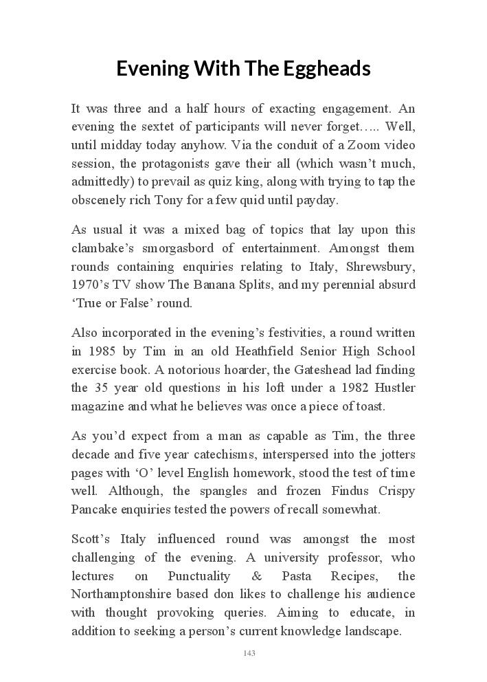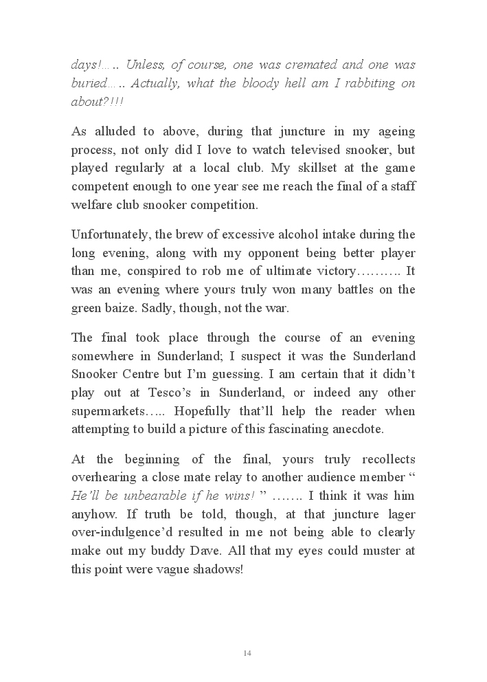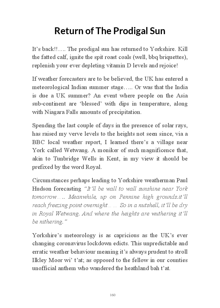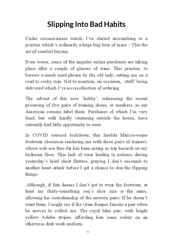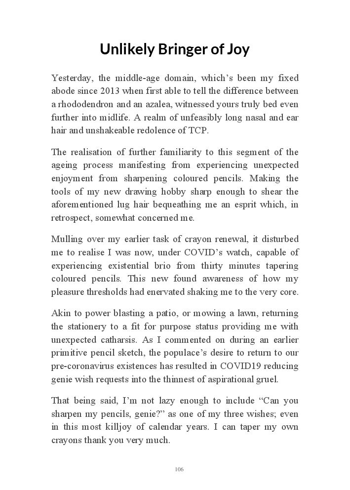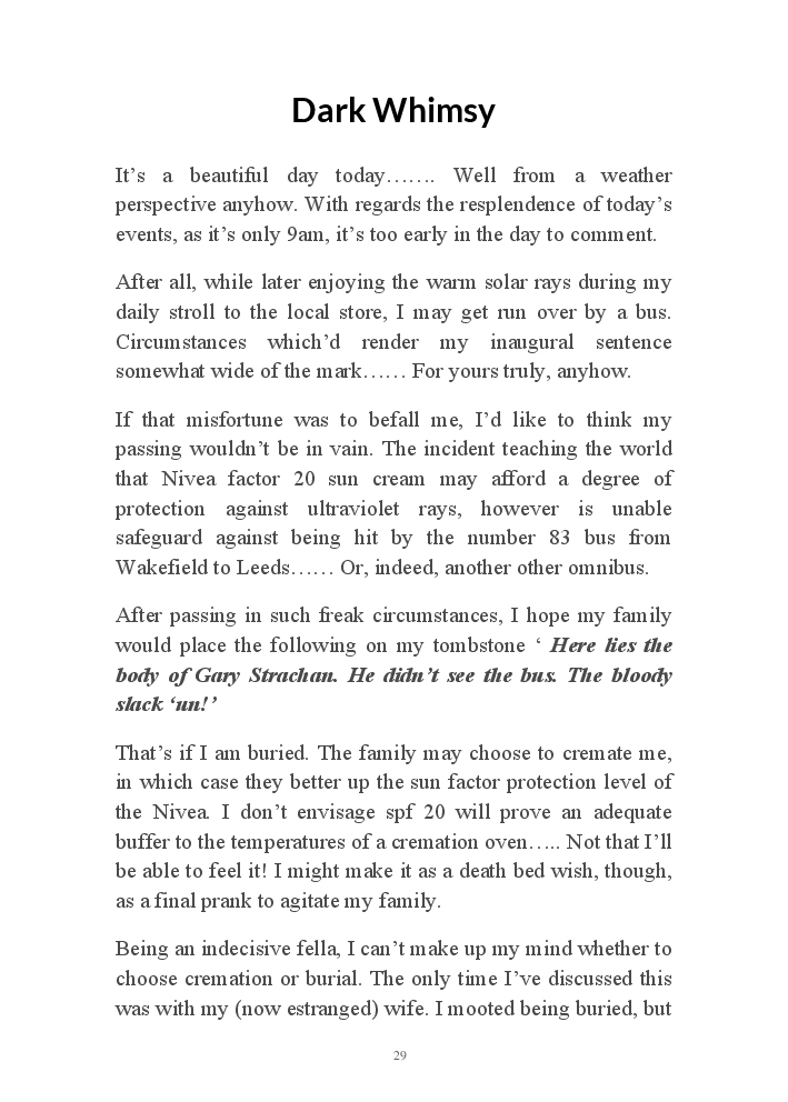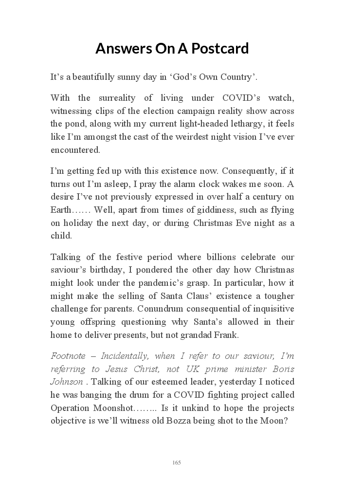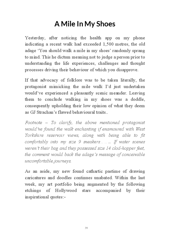 Summer's Dusk 2020 does exactly what it says on the tin...... Well the book cover, anyhow!. Within it's once chaste leaves, further tales of the authors existence in 2020 played out. This time as summer's watch hurtles to it's conclusion here on Planet COVID. The whimsical, partly fictional yarns cover a multitude of topics, such as snooker, the poet Keats, Oscar Wilde, along with tales of quiz nights. The tome also includes a selection of caricatures drawn by Gary Strachan during this period.
