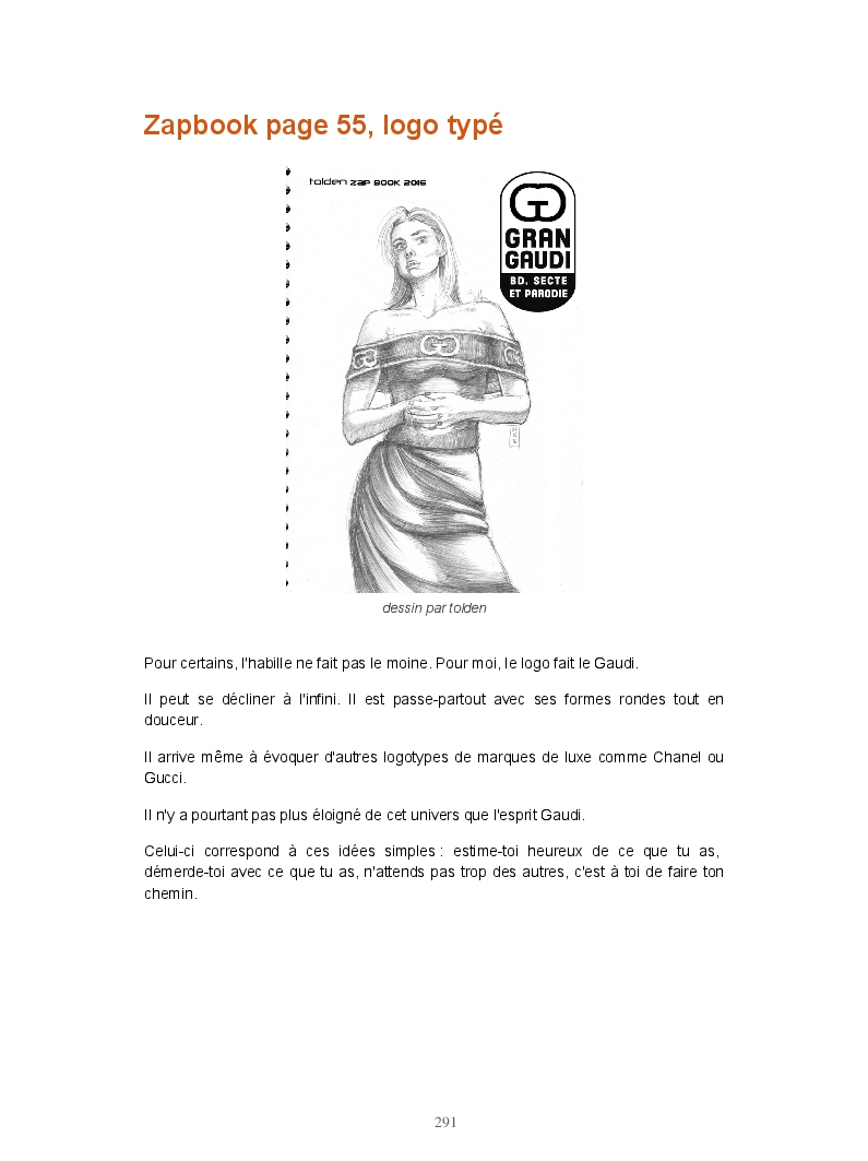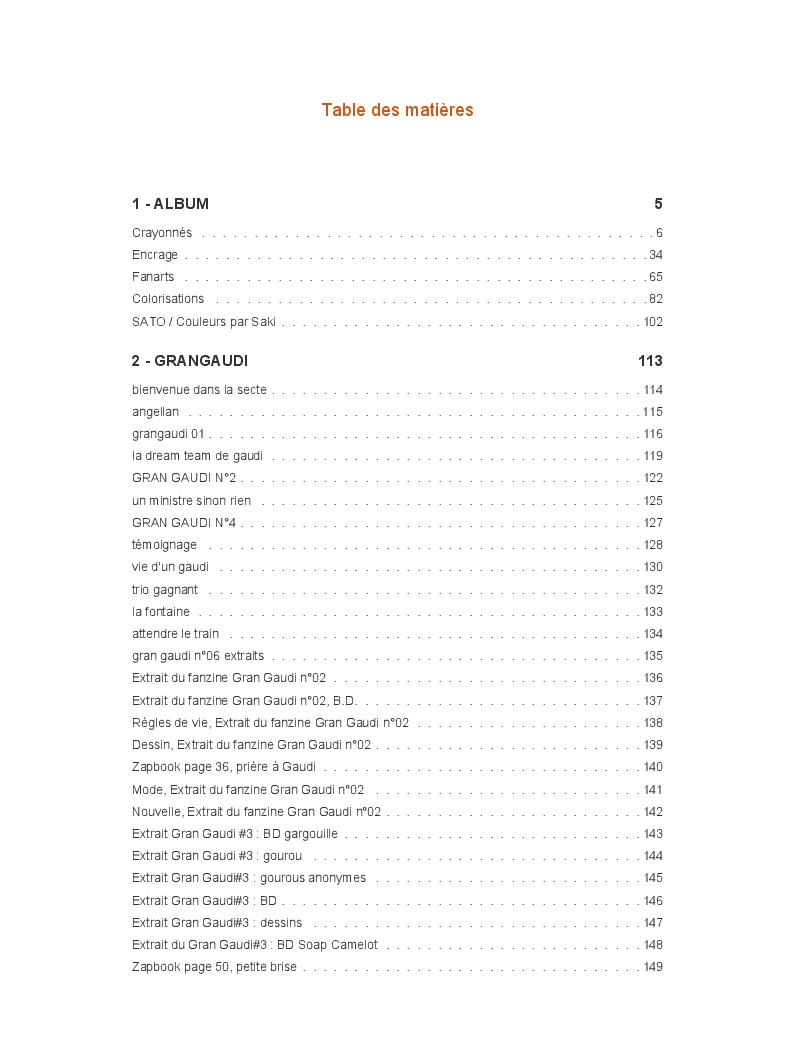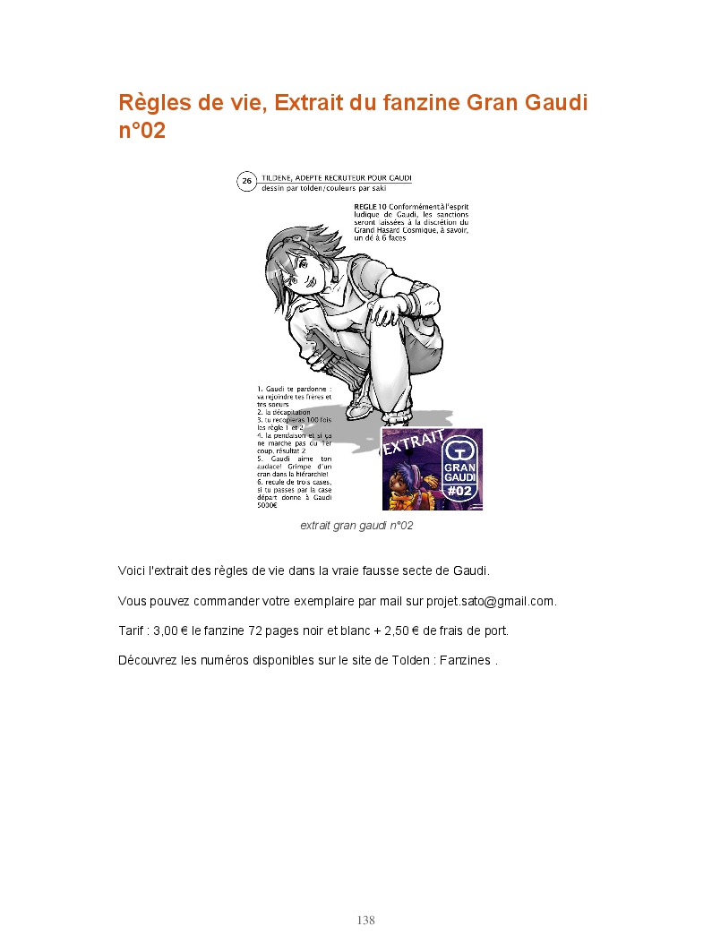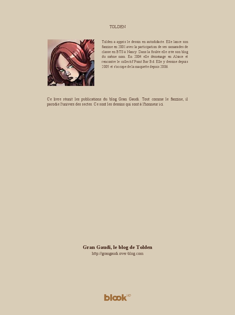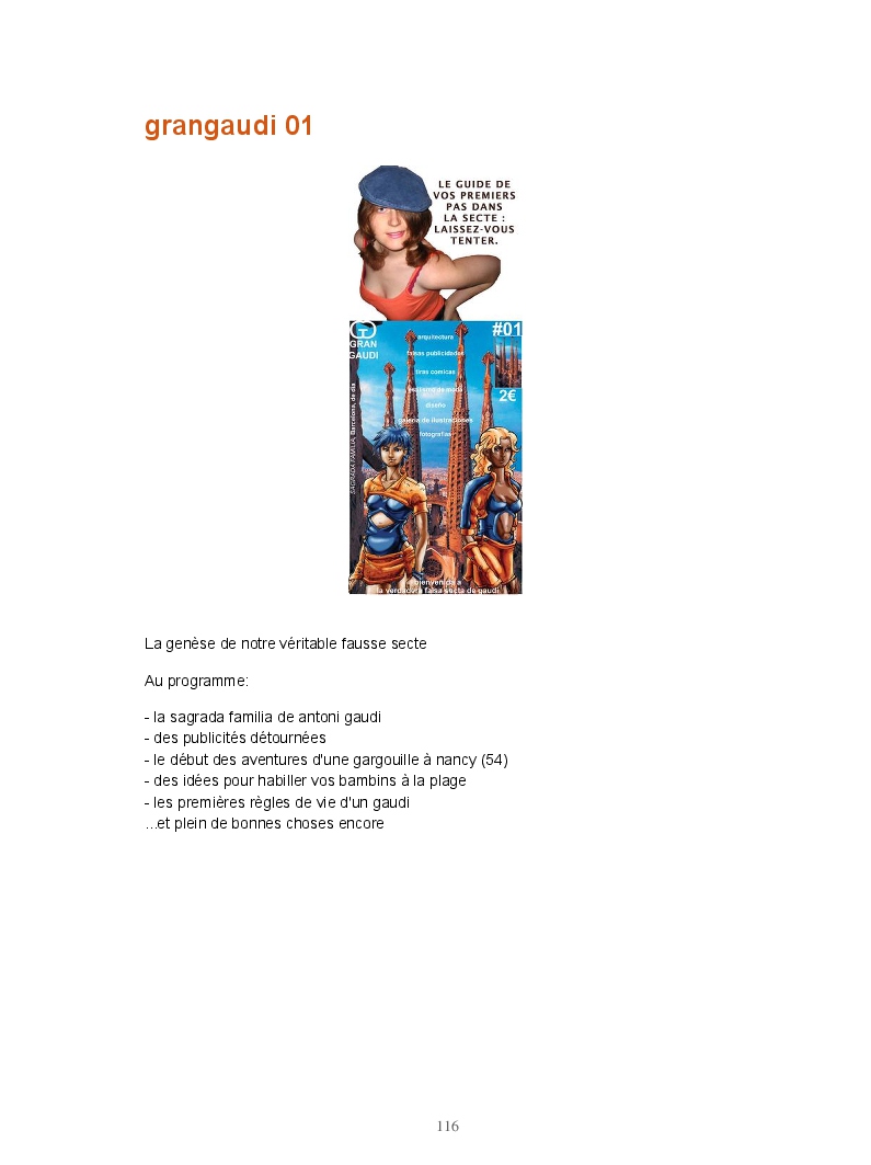 Ce livre réunit les publications du blog Gran Gaudi. Tout comme le fanzine, il parodie l'univers des sectes. Ce sont les dessins qui sont à l'honneur ici.
