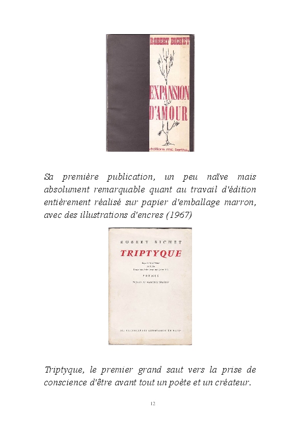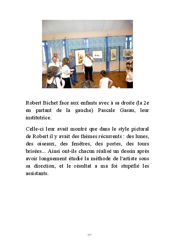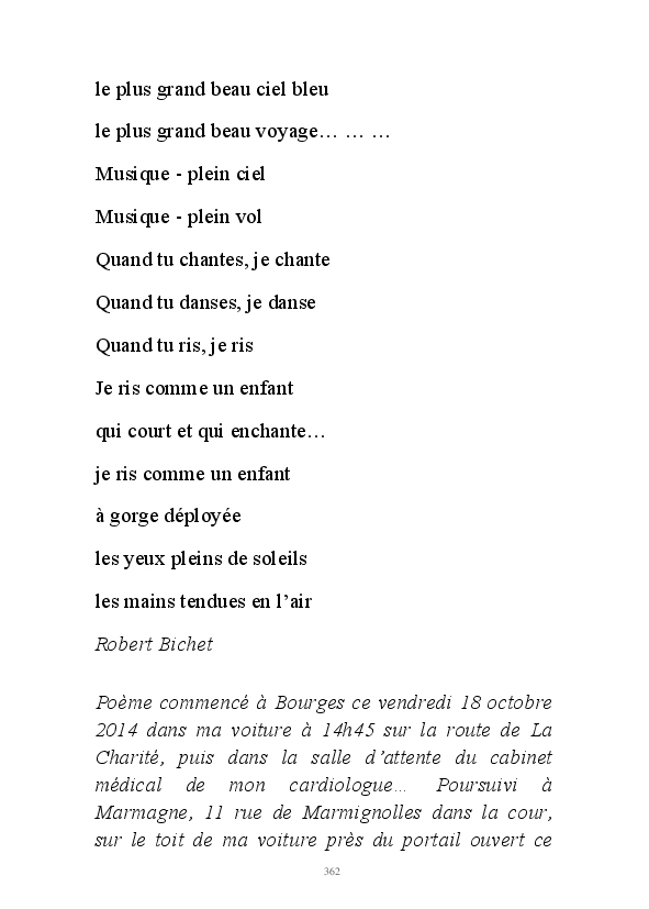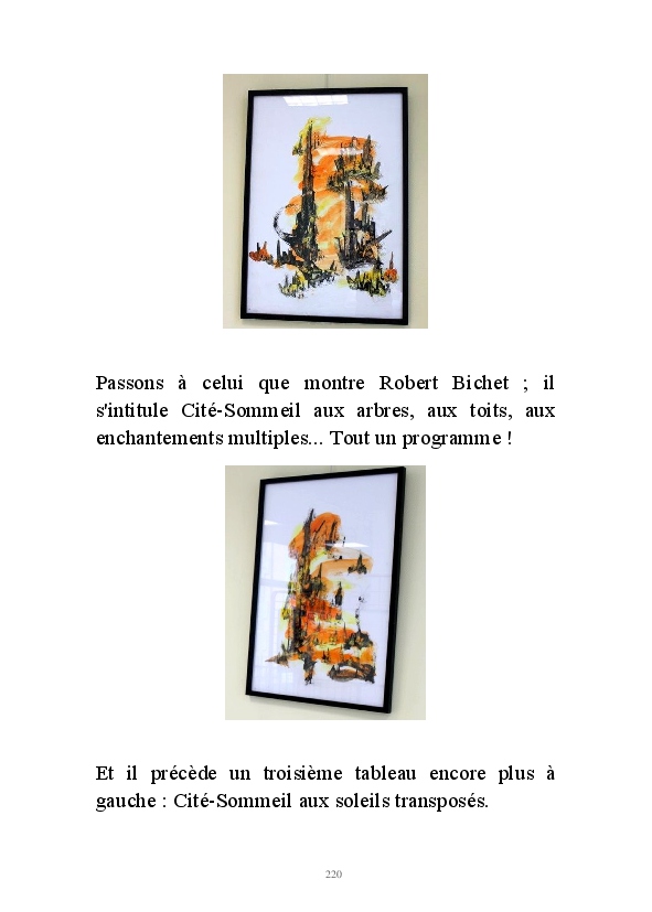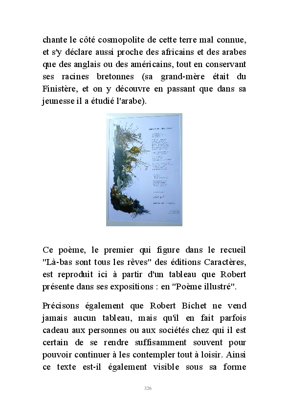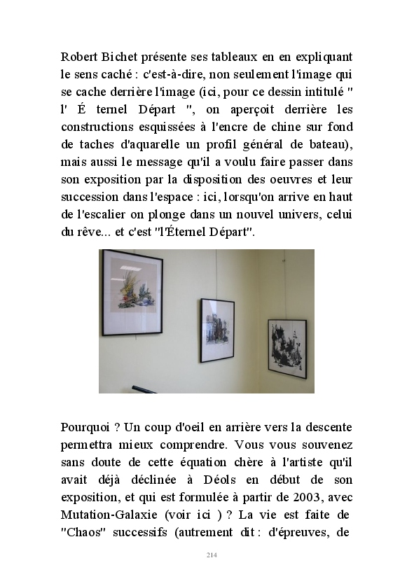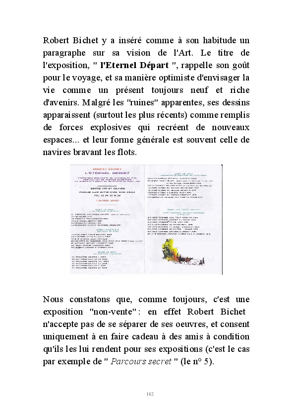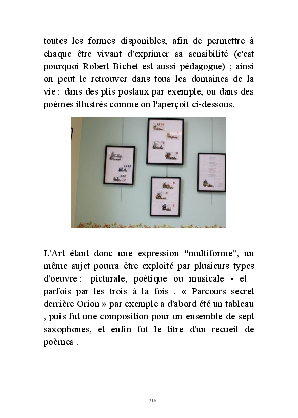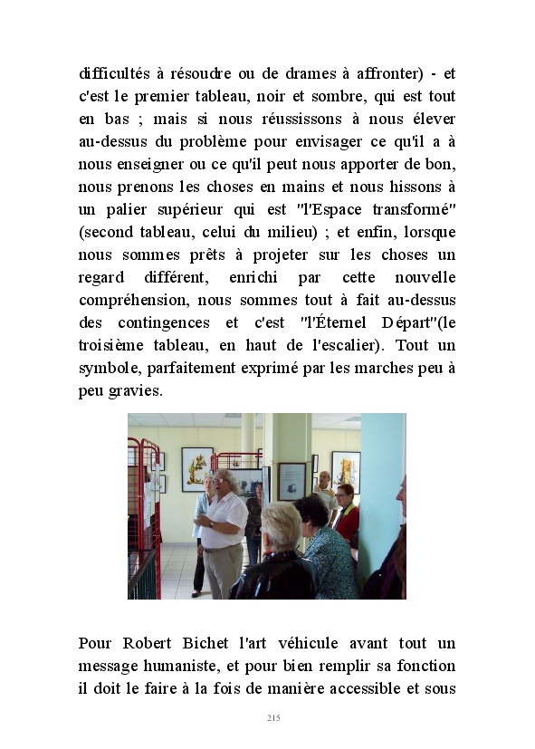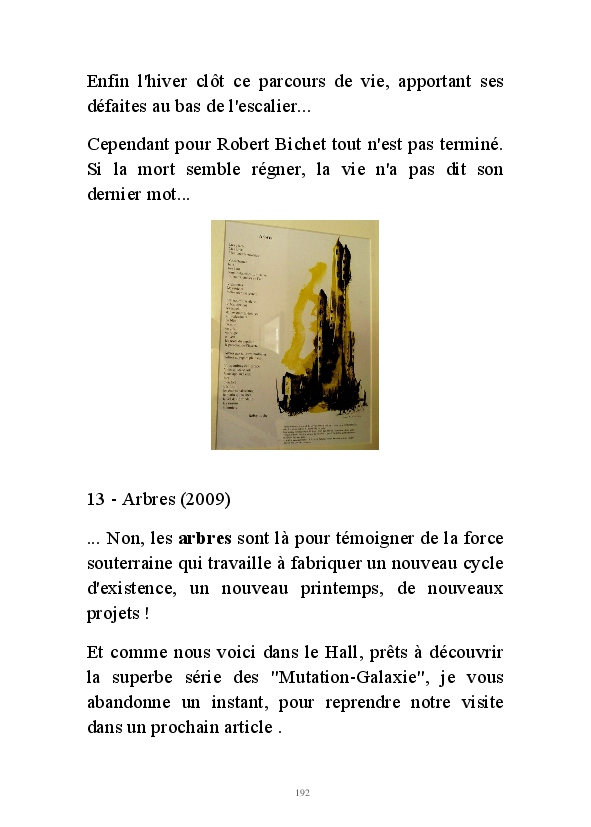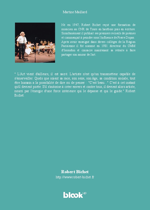 " L'Art vient d'ailleurs, il est sacré. L'artiste n'est qu'un transmetteur capable de s'émerveiller. Quels que soient sa race, son sexe, son âge, sa condition sociale, tout être humain a la possibilité de dire ou de penser : "C'est beau..." C'est à cet instant qu'il devient poète. S'il s'autorise à créer envers et contre tous, il devient alors artiste, nourri par l'énergie d'une force intérieure qui le dépasse et qui le guide." Robert Bichet.