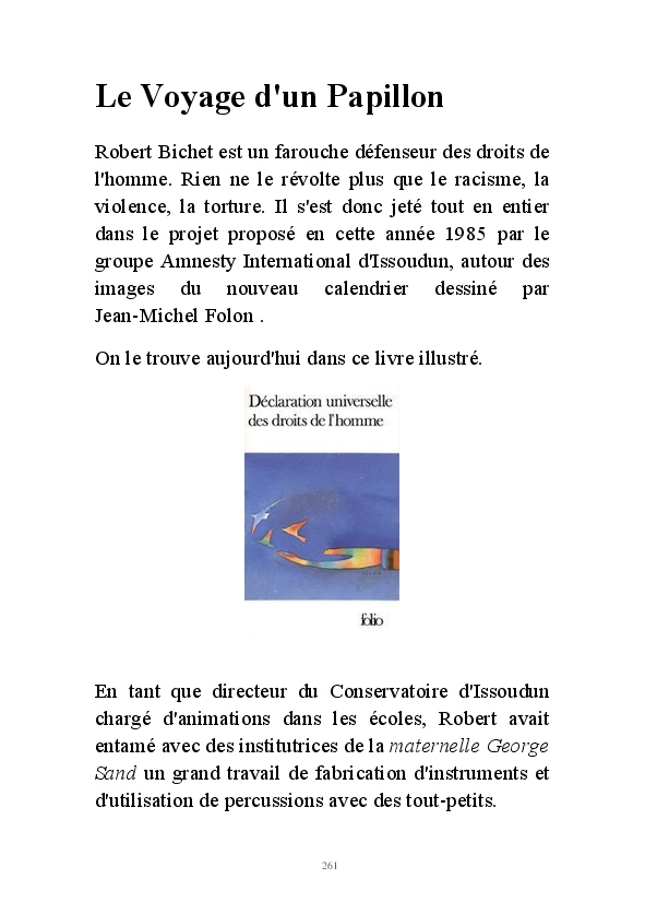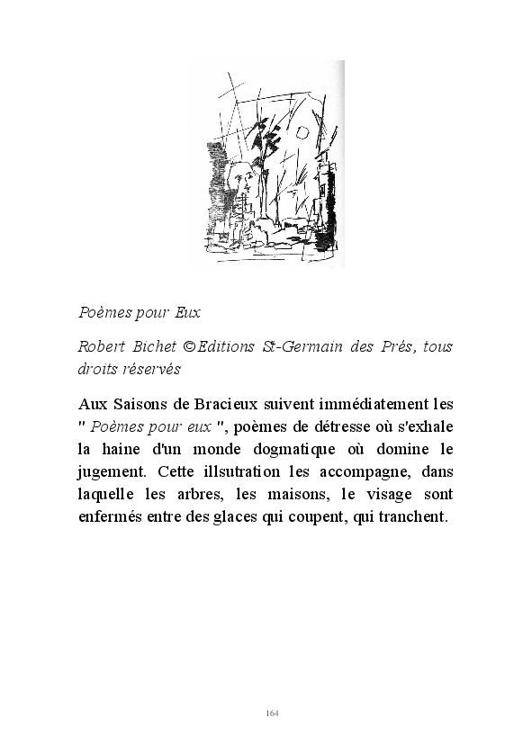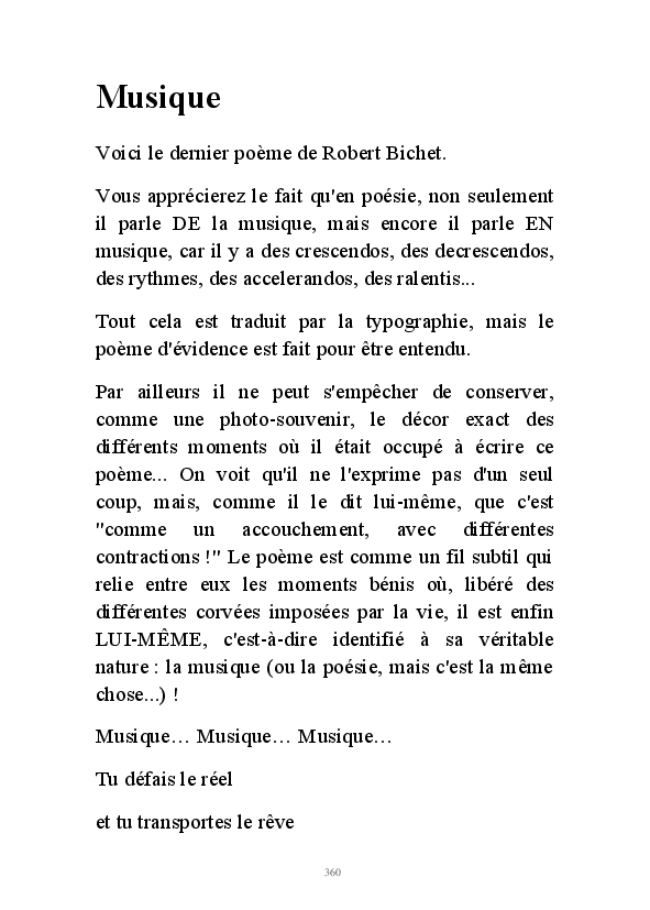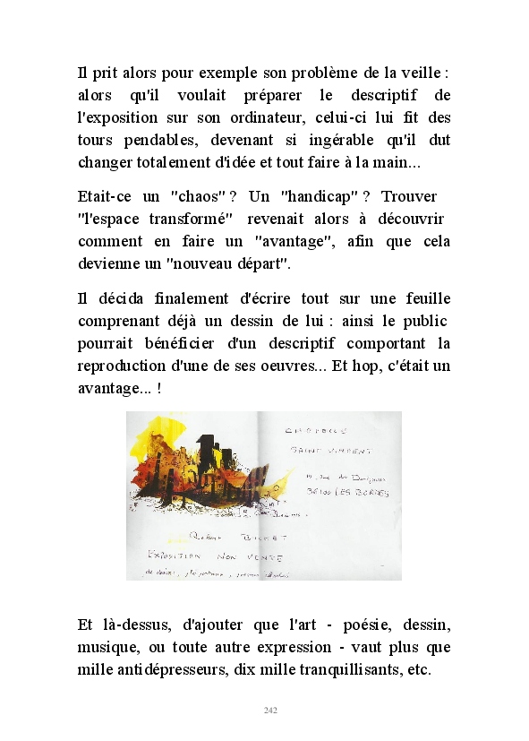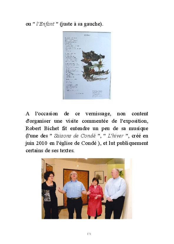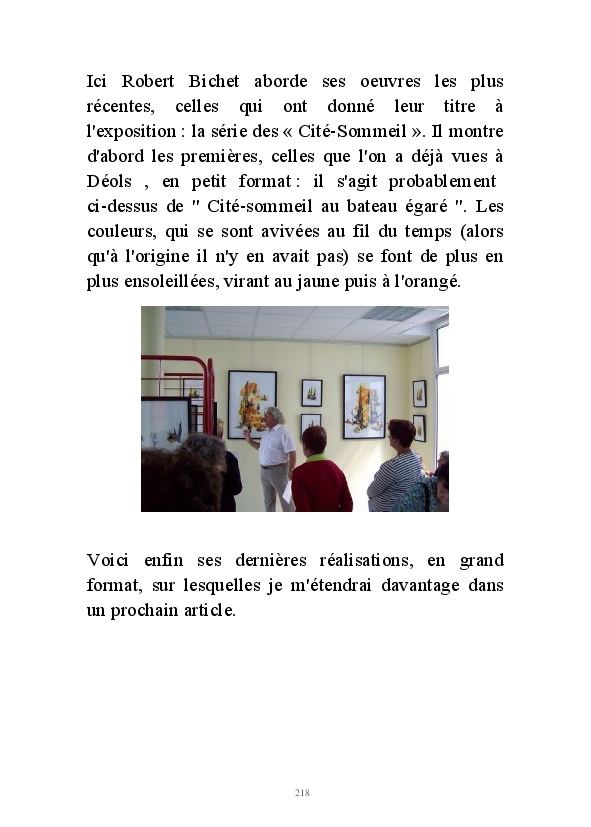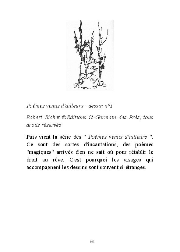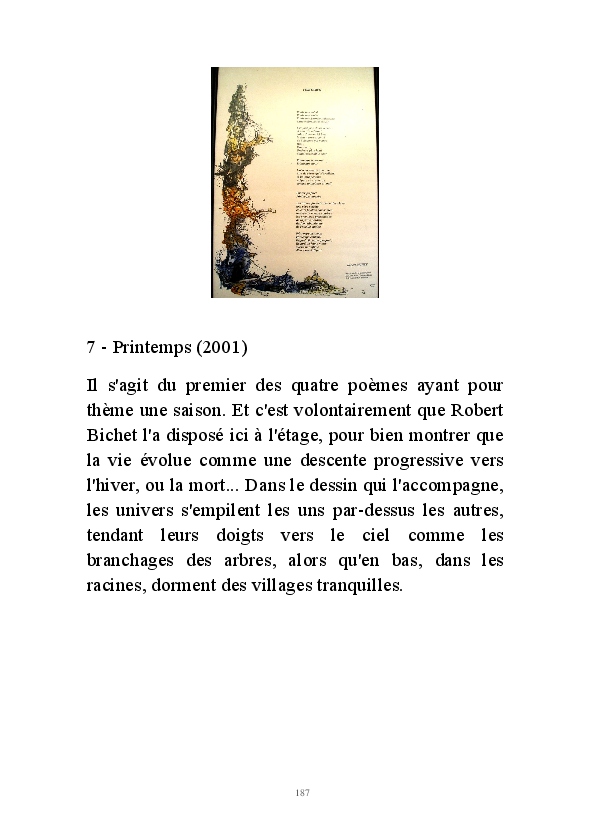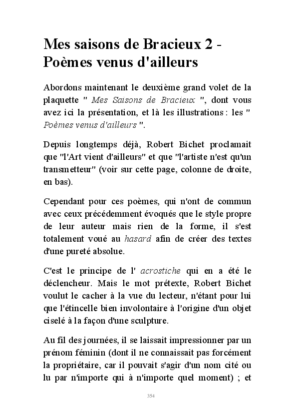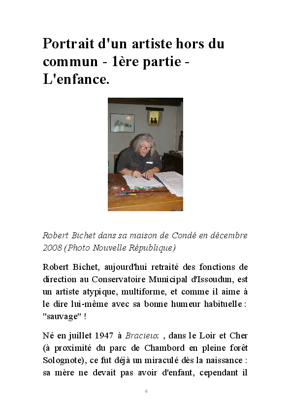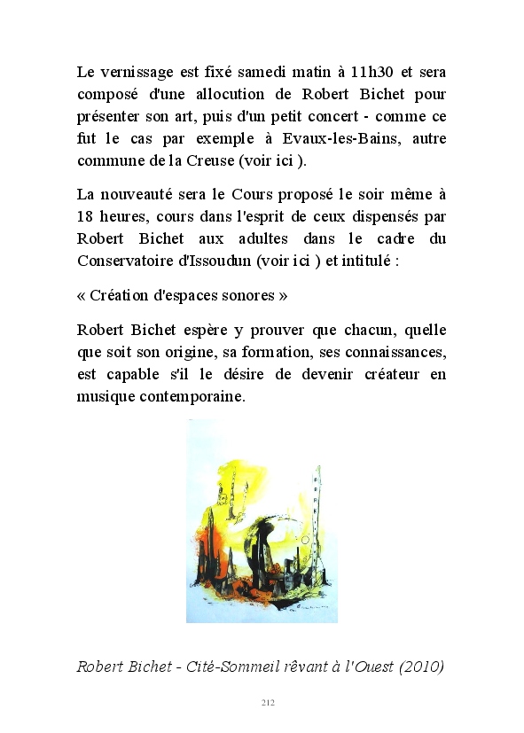 " L'Art vient d'ailleurs, il est sacré. L'artiste n'est qu'un transmetteur capable de s'émerveiller. Quels que soient sa race, son sexe, son âge, sa condition sociale, tout être humain a la possibilité de dire ou de penser : "C'est beau..." C'est à cet instant qu'il devient poète. S'il s'autorise à créer envers et contre tous, il devient alors artiste, nourri par l'énergie d'une force intérieure qui le dépasse et qui le guide." Robert Bichet.