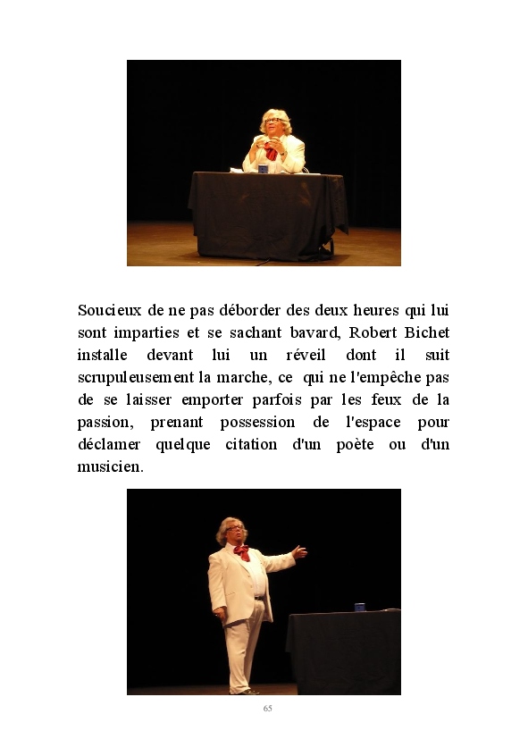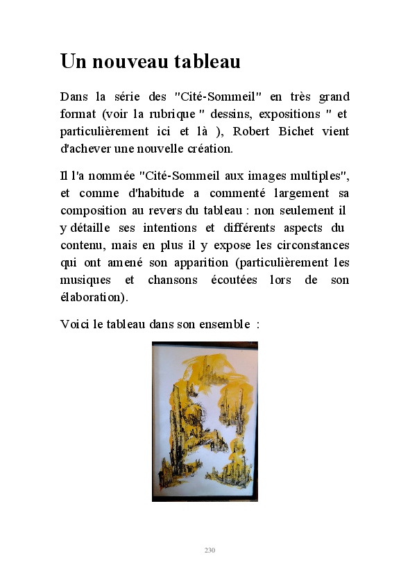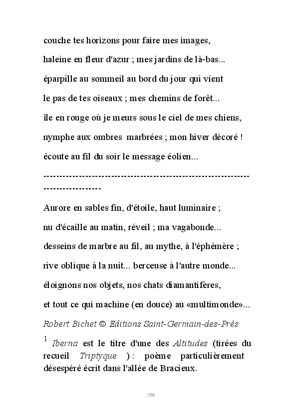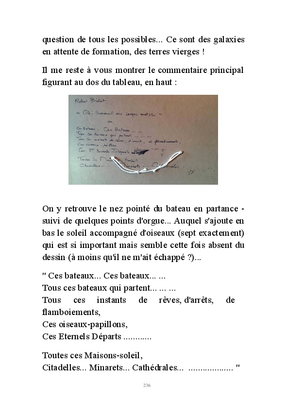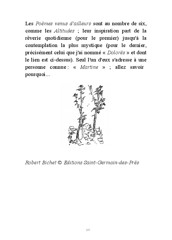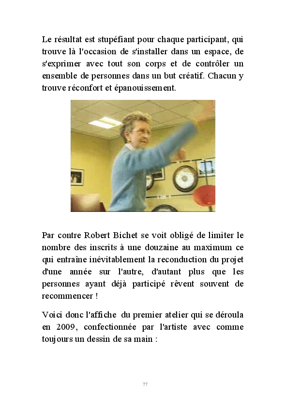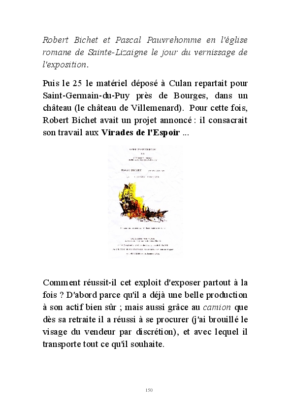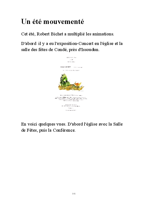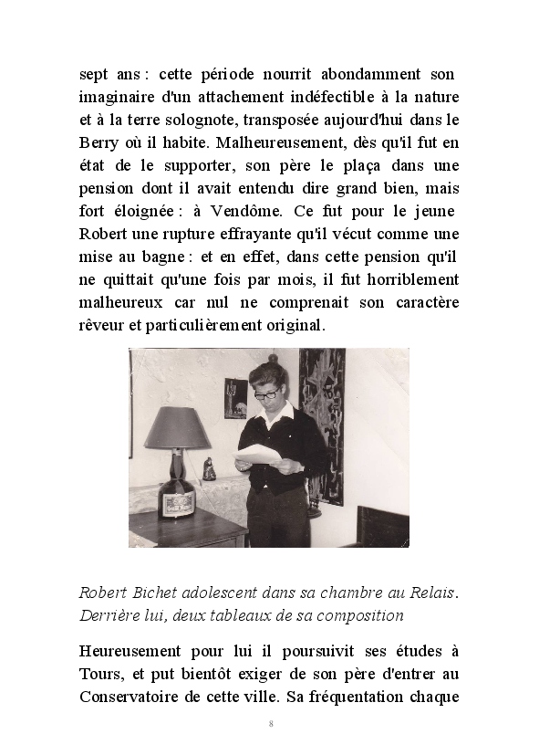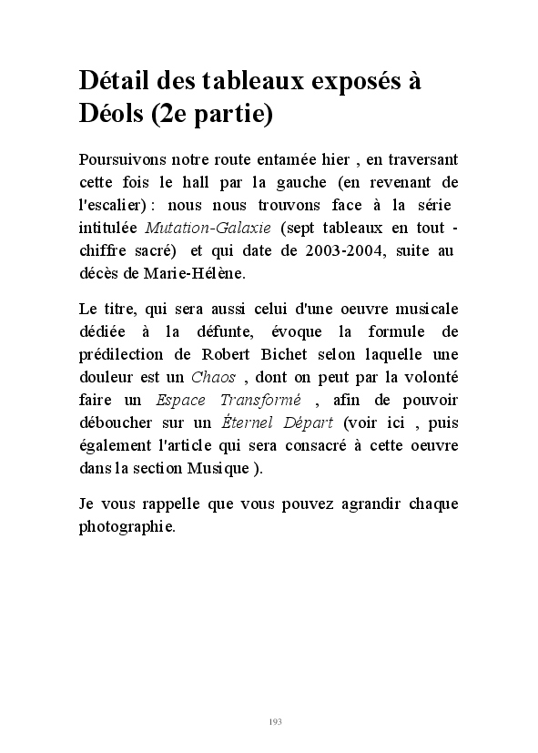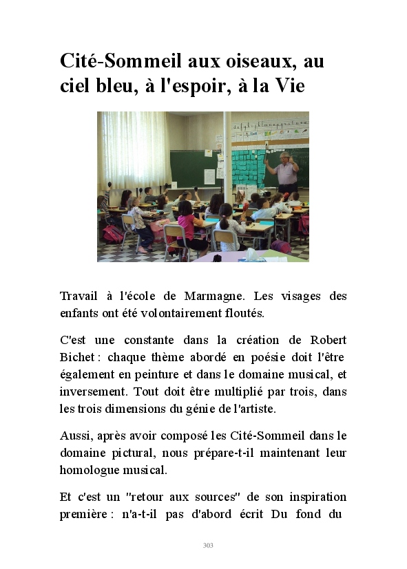 " L'Art vient d'ailleurs, il est sacré. L'artiste n'est qu'un transmetteur capable de s'émerveiller. Quels que soient sa race, son sexe, son âge, sa condition sociale, tout être humain a la possibilité de dire ou de penser : "C'est beau..." C'est à cet instant qu'il devient poète. S'il s'autorise à créer envers et contre tous, il devient alors artiste, nourri par l'énergie d'une force intérieure qui le dépasse et qui le guide." Robert Bichet.