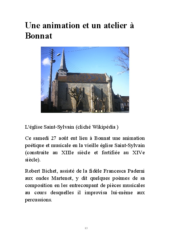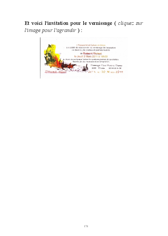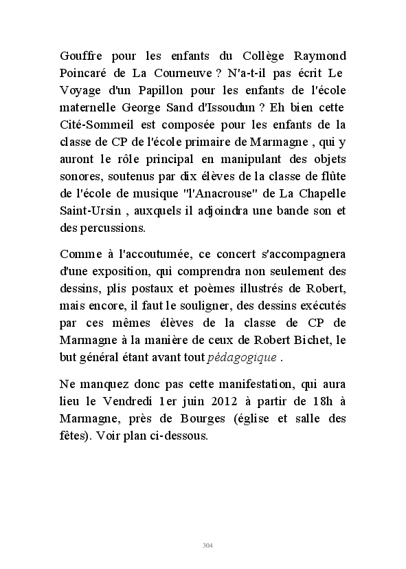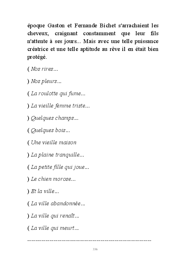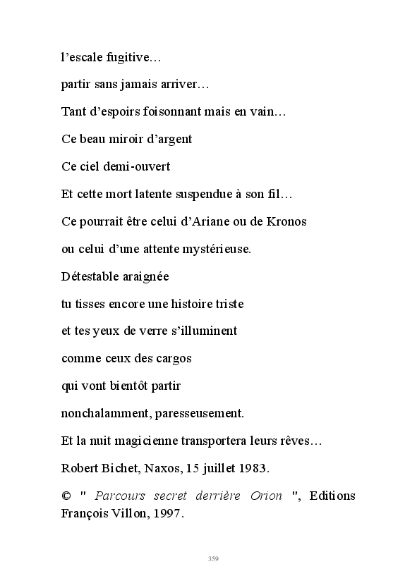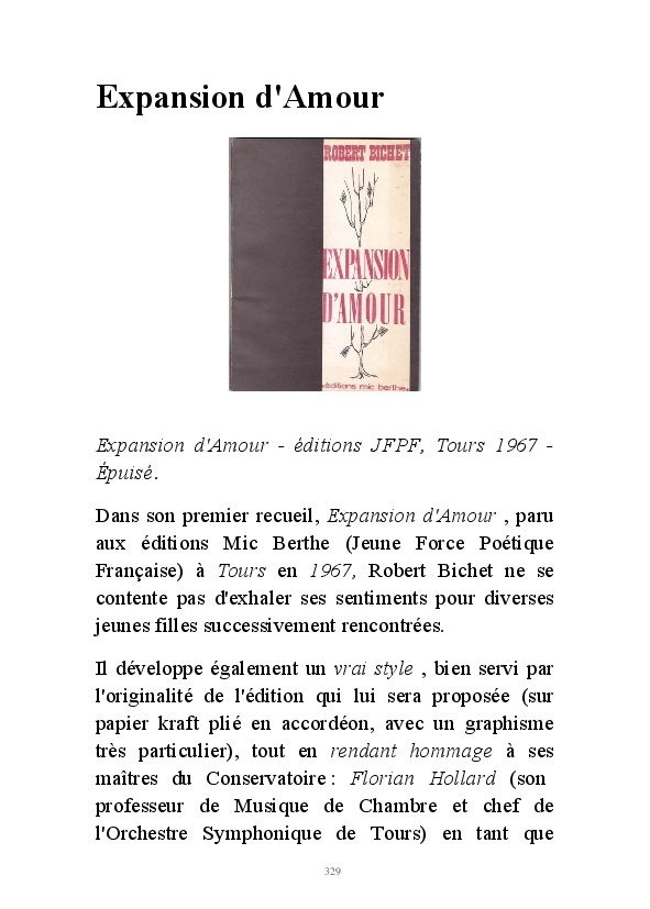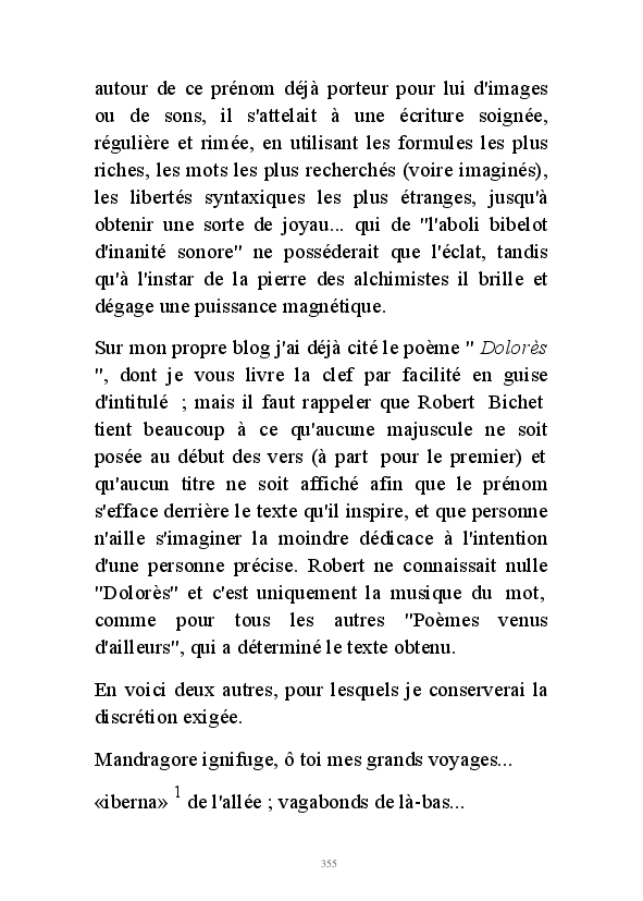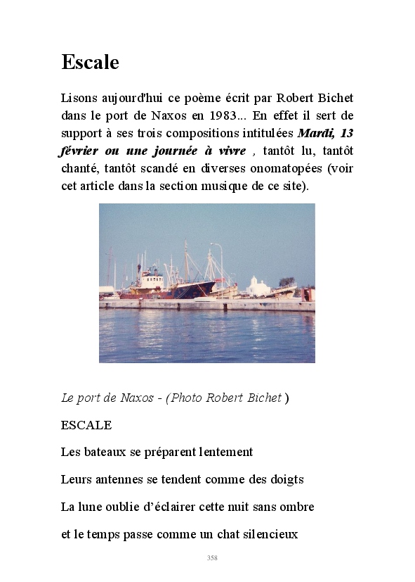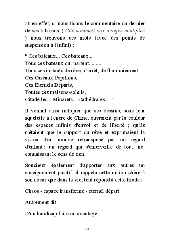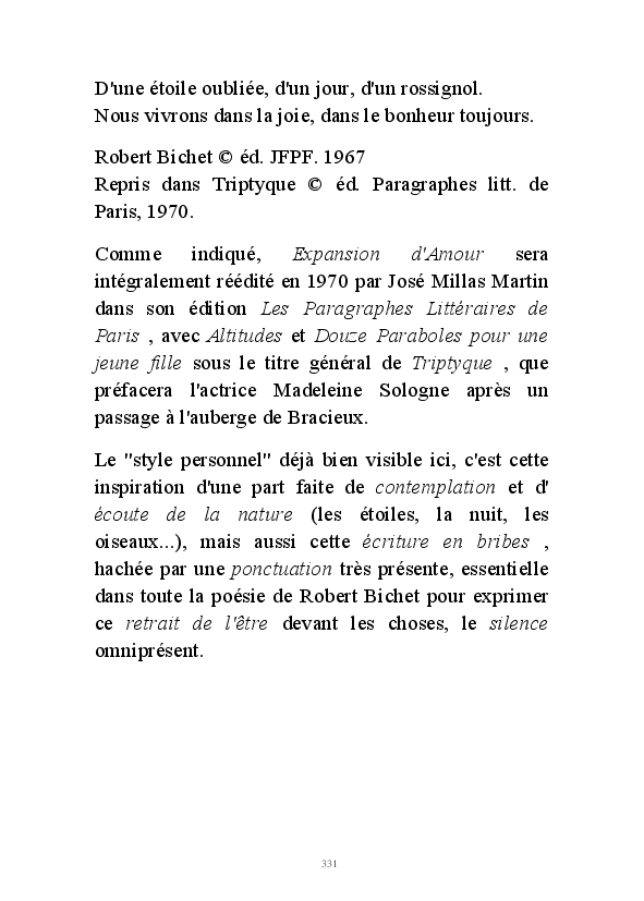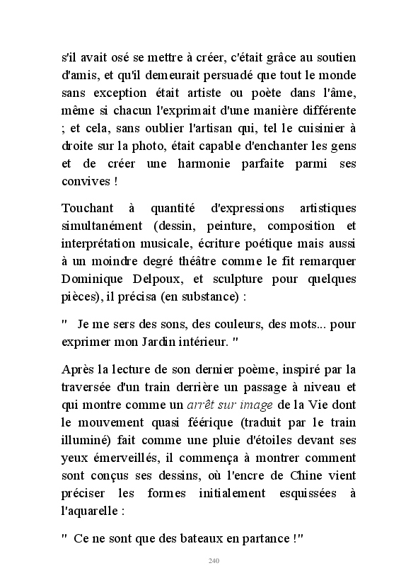 " L'Art vient d'ailleurs, il est sacré. L'artiste n'est qu'un transmetteur capable de s'émerveiller. Quels que soient sa race, son sexe, son âge, sa condition sociale, tout être humain a la possibilité de dire ou de penser : "C'est beau..." C'est à cet instant qu'il devient poète. S'il s'autorise à créer envers et contre tous, il devient alors artiste, nourri par l'énergie d'une force intérieure qui le dépasse et qui le guide." Robert Bichet.