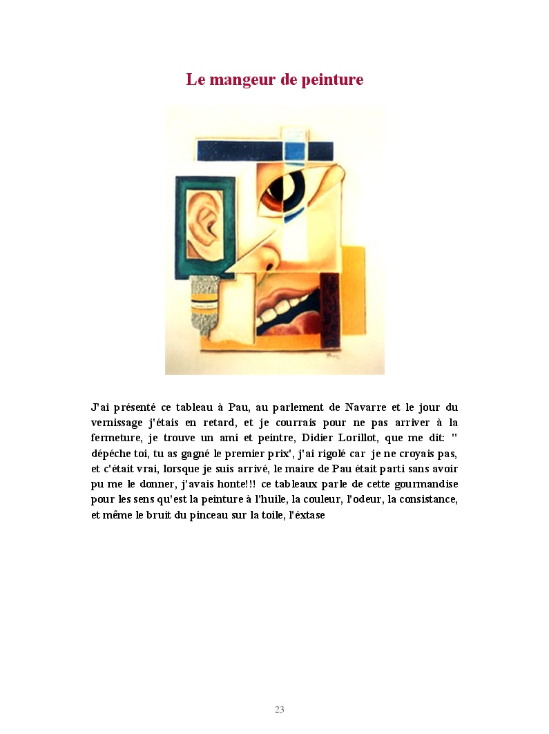 Quelques centaines de dessins et toiles ont été distribuées ici et là, en France, au Chili, aux Etats Unis, des moments de vie, parfois de la joie d'autres de la tristesse, de l'émotion et de la révolte, de l'amour ou de la colère,imprimés par ma main, sur un morceau de papier, une serviette, un morceau de cuir.