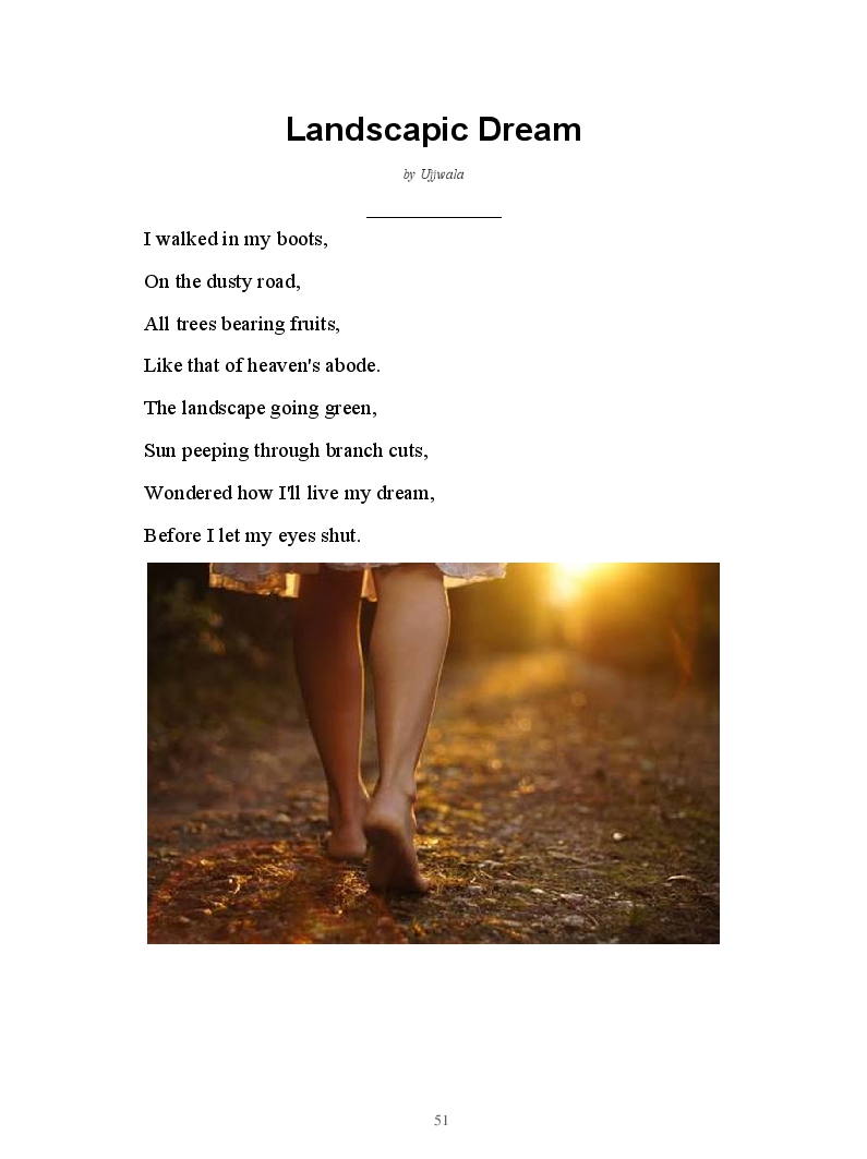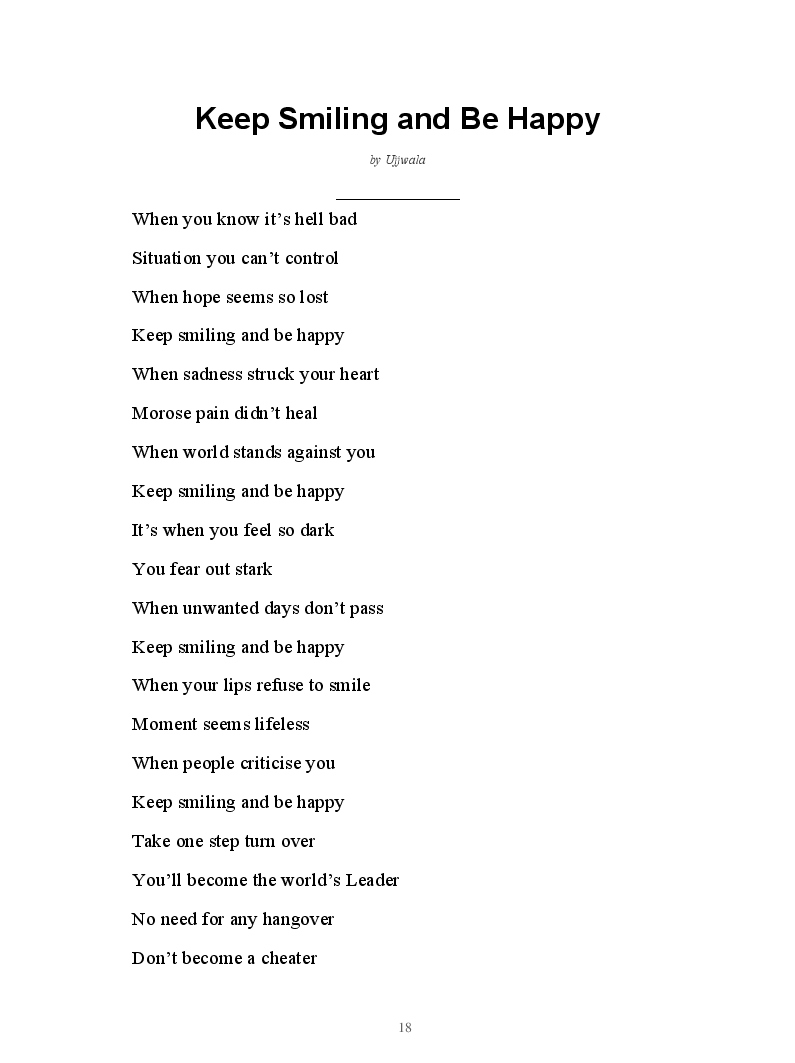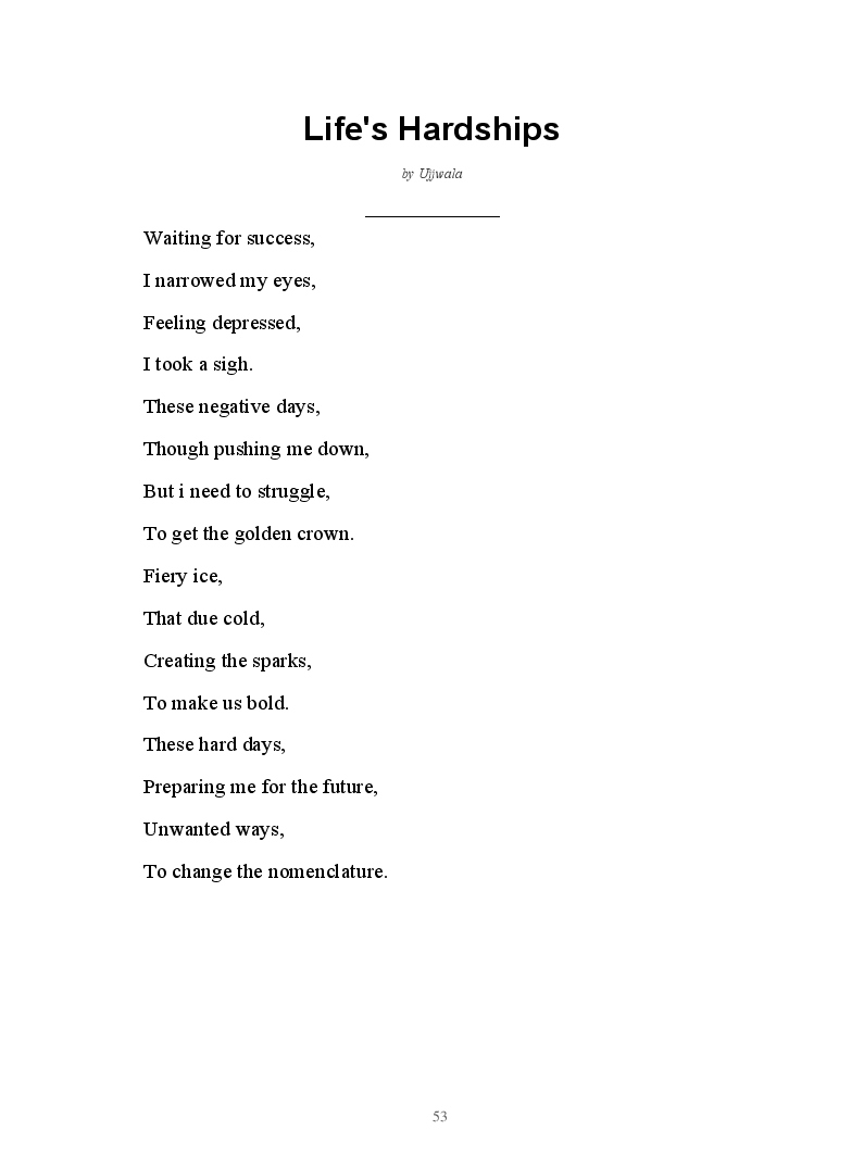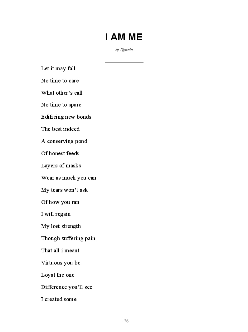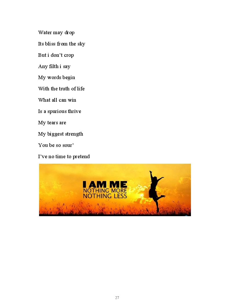Poetry is one's feelings in a few lines. Some of the poetries in this book depict a normal person's feeling. One can find themselves in such situations and they can feel what goes on in the poem is a real life deal.