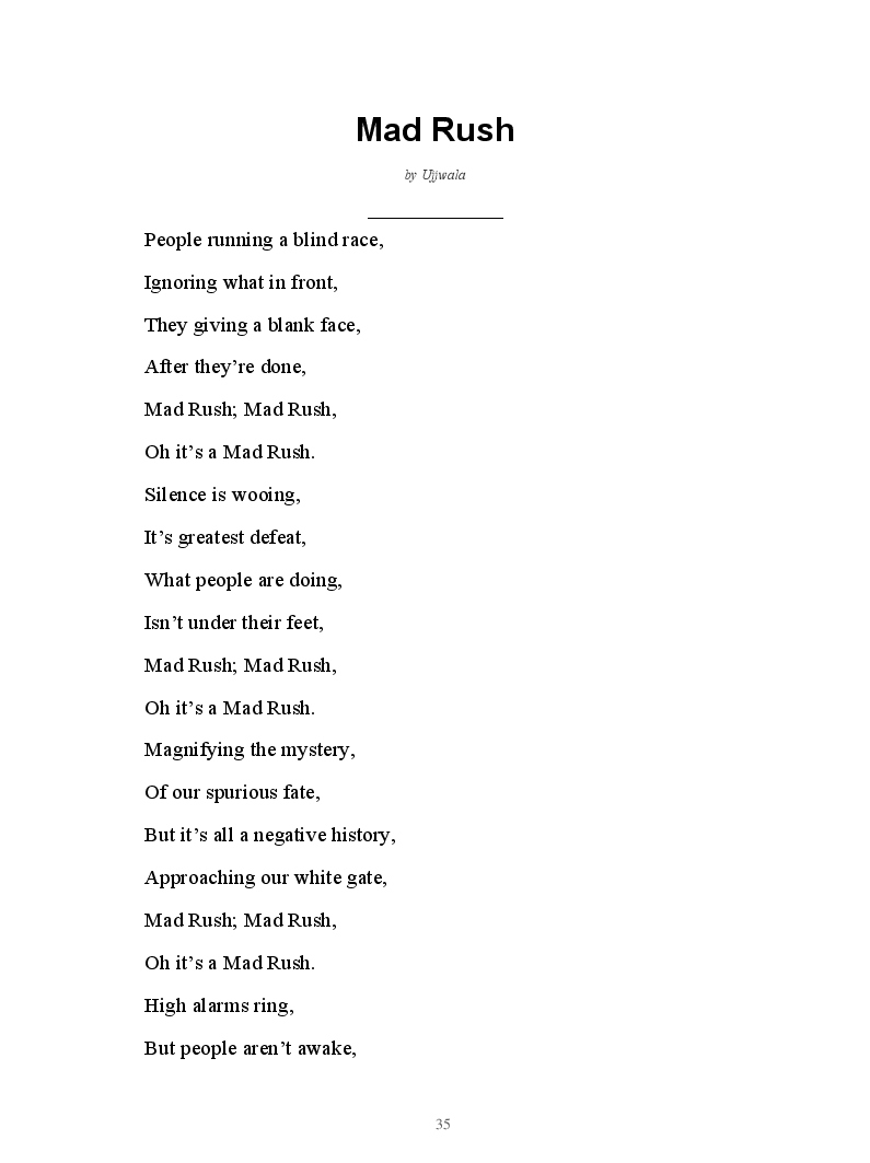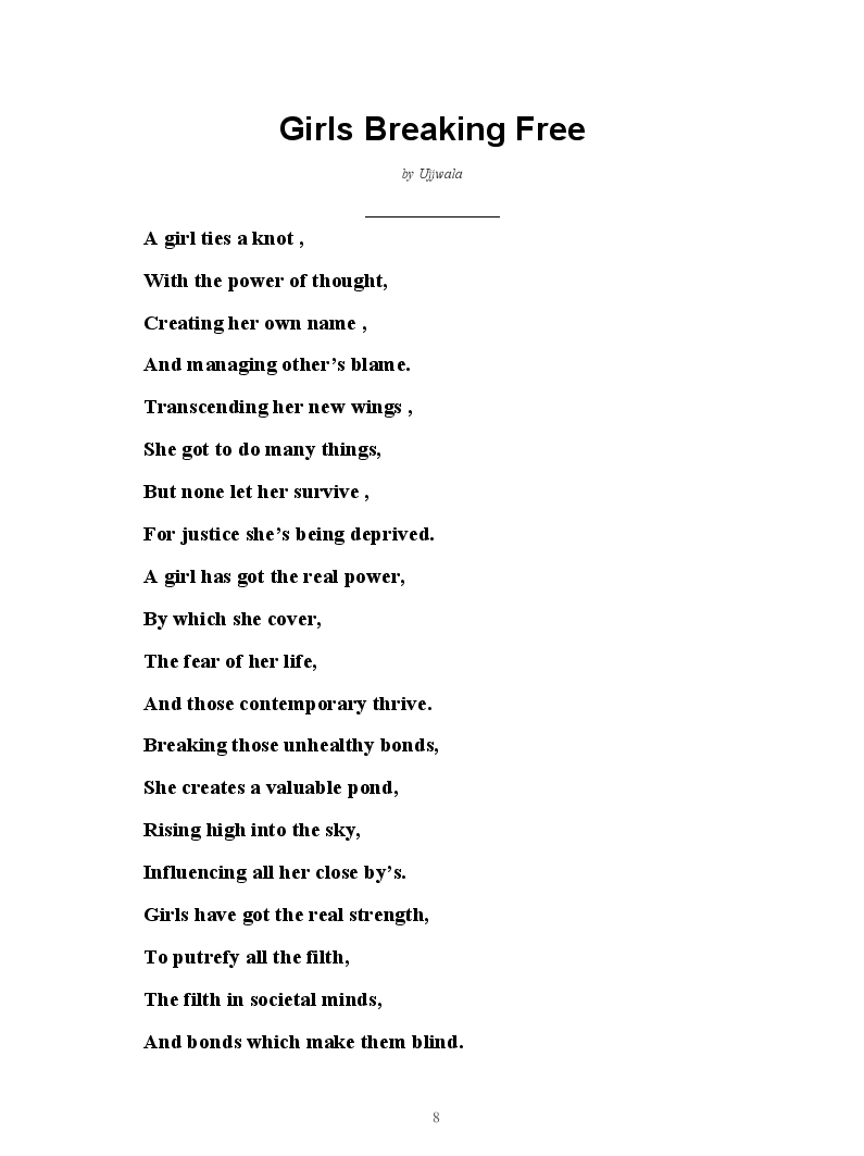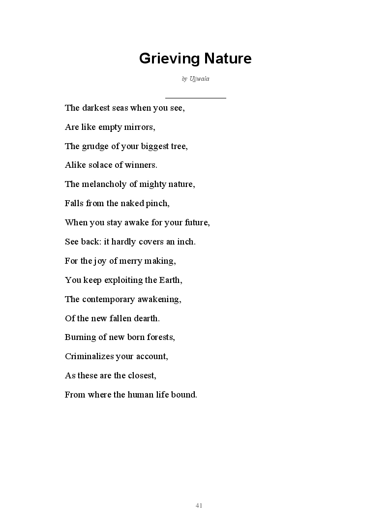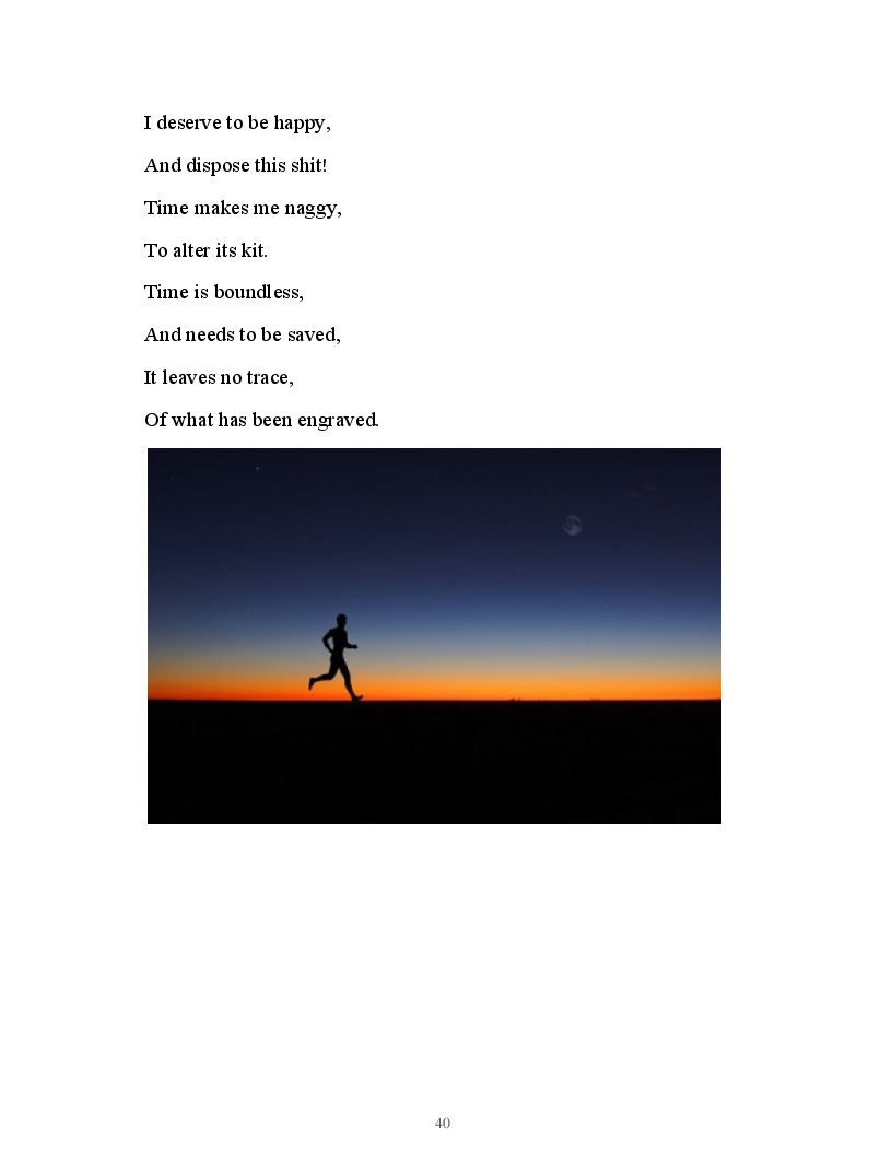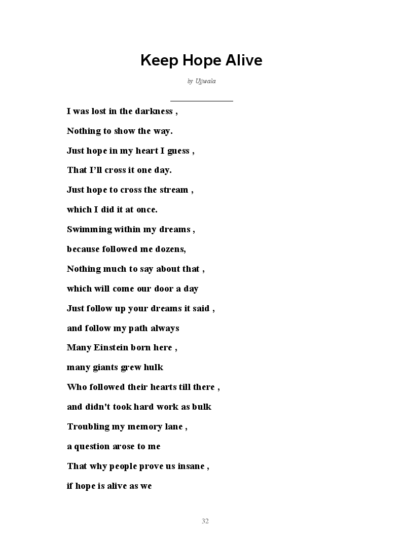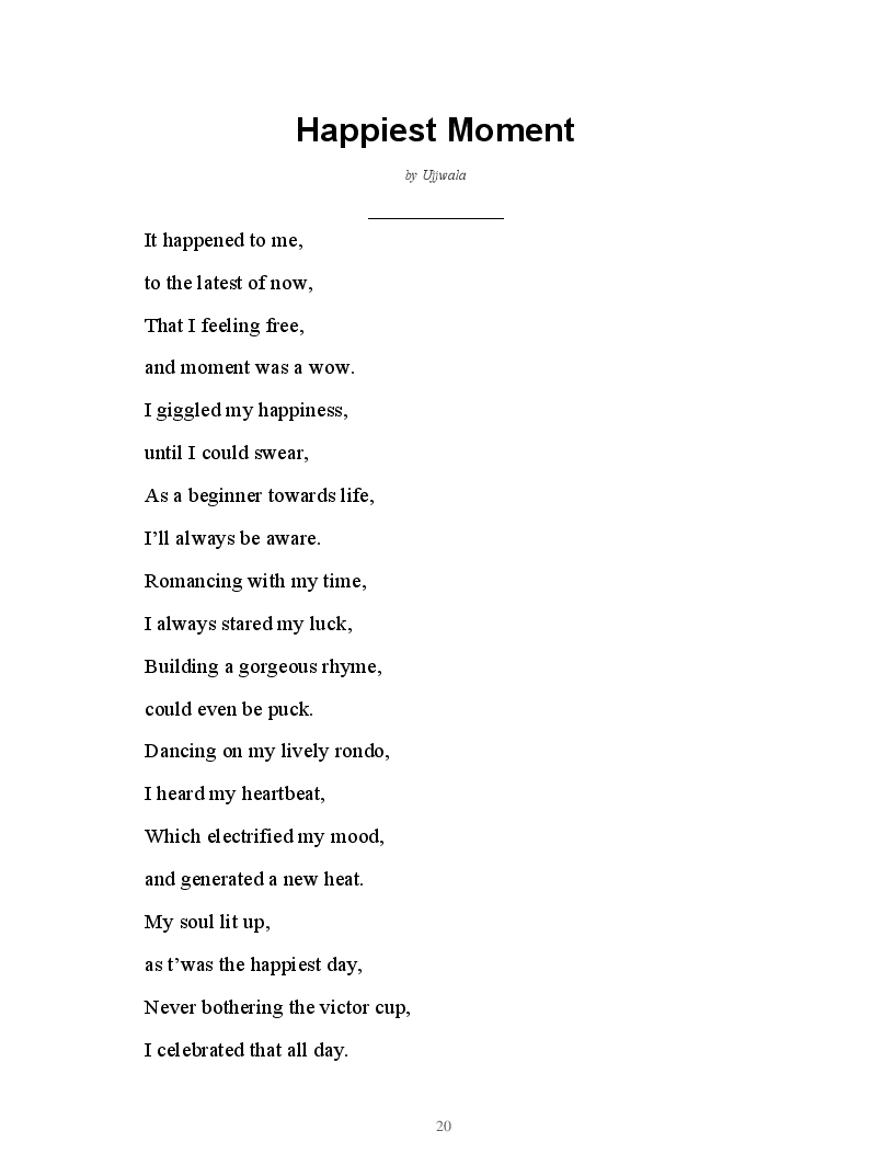 Poetry is one's feelings in a few lines. Some of the poetries in this book depict a normal person's feeling. One can find themselves in such situations and they can feel what goes on in the poem is a real life deal.