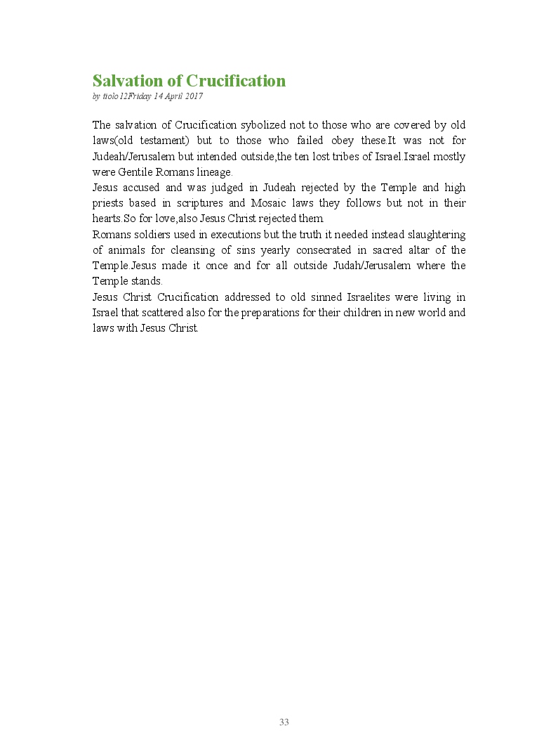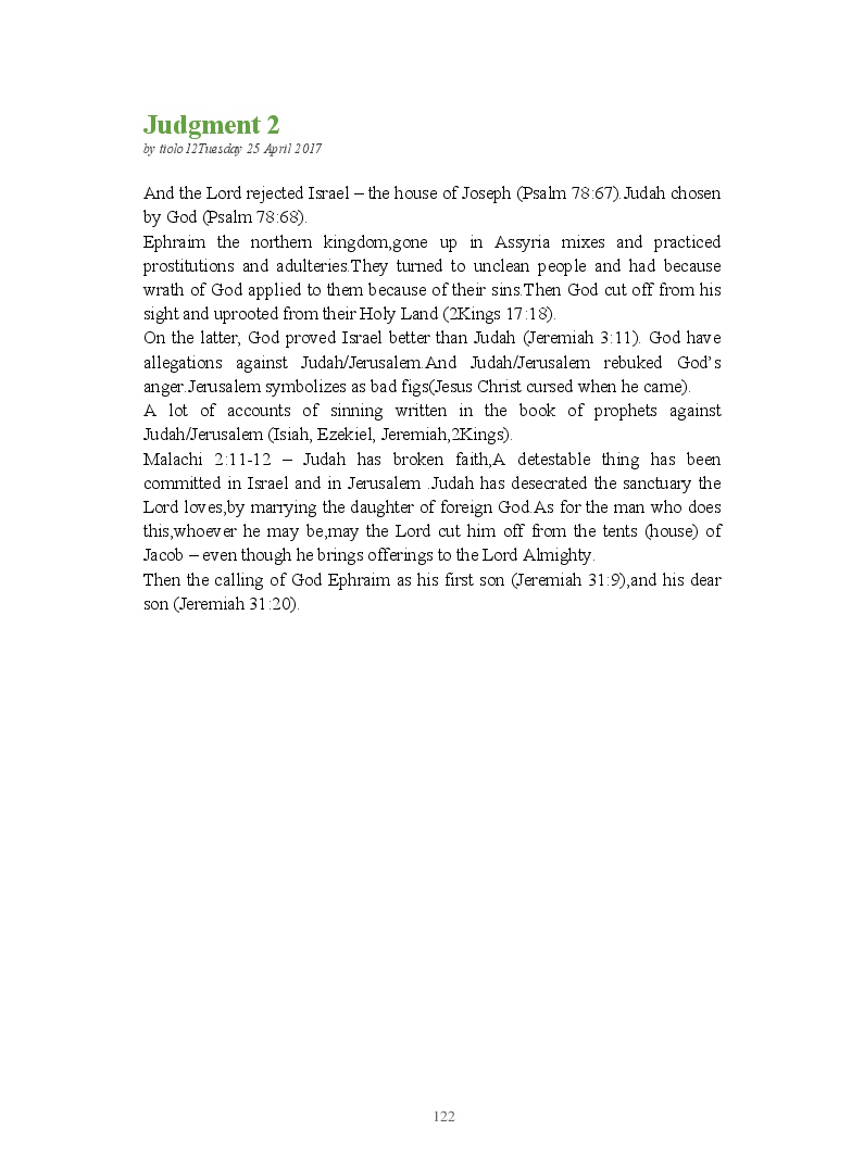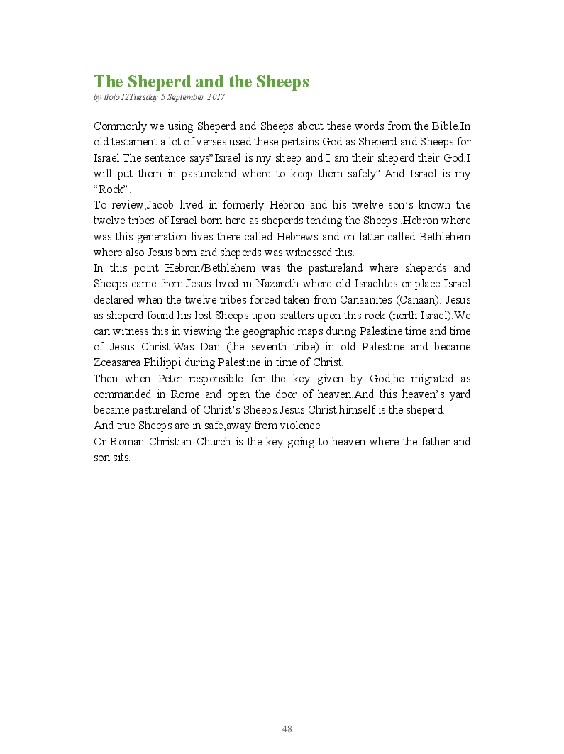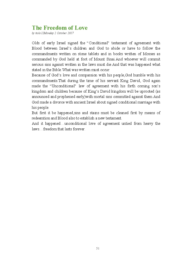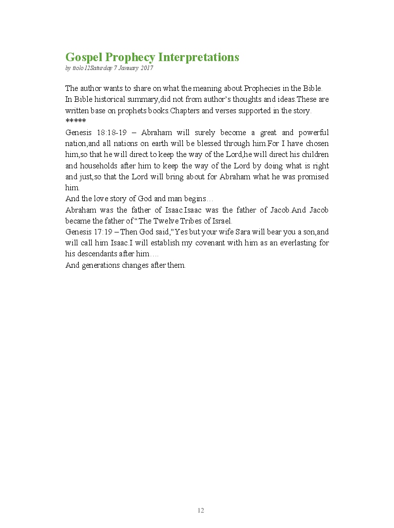 Bible Prophecy Interpretation- about the love story between God and his people.How they separated from God.First commandments made broken because of serious sins committed against God But because of God love and compassion for his children,he find his losts which scatters among nations through out the world and created the new commandments slightly for new people.