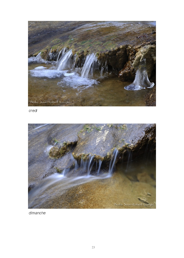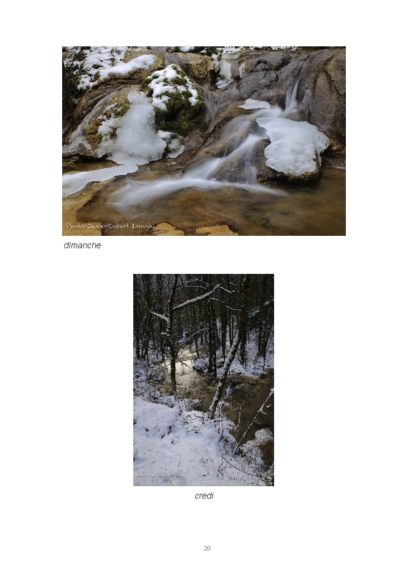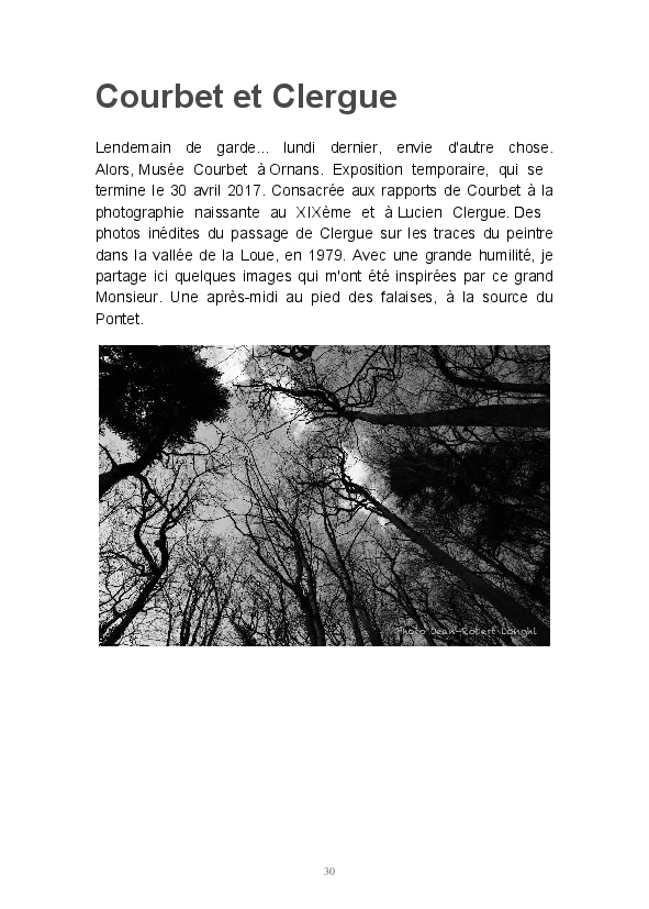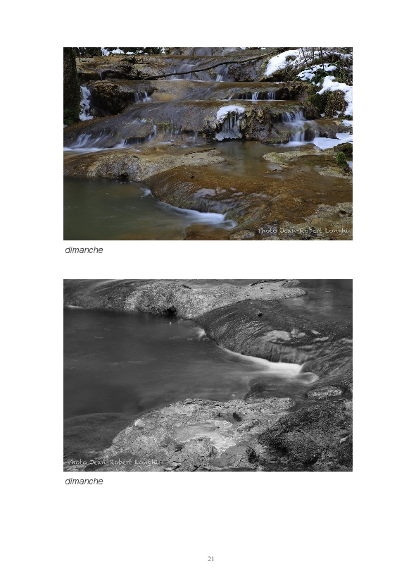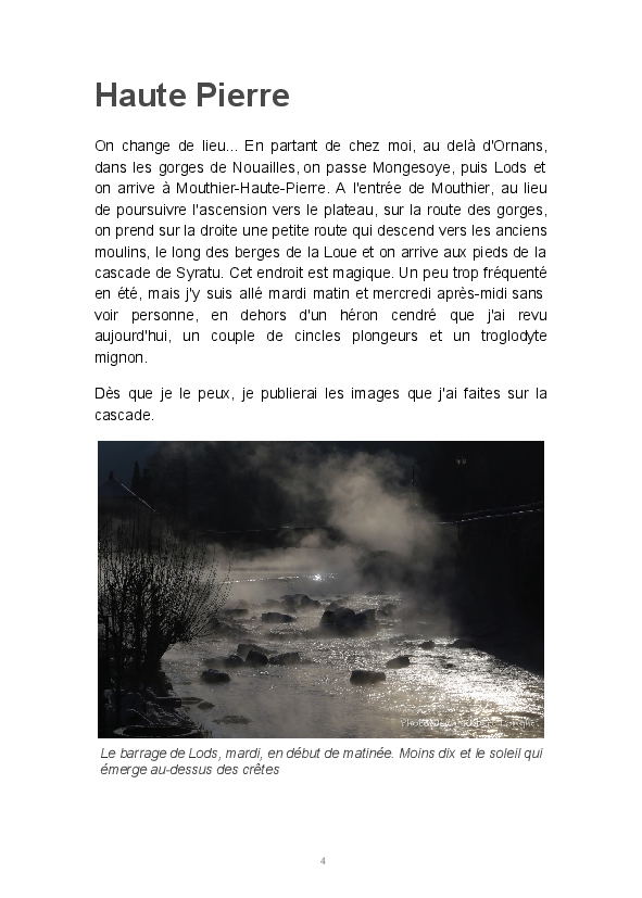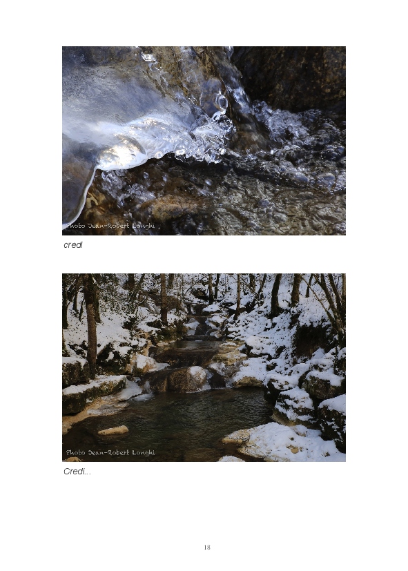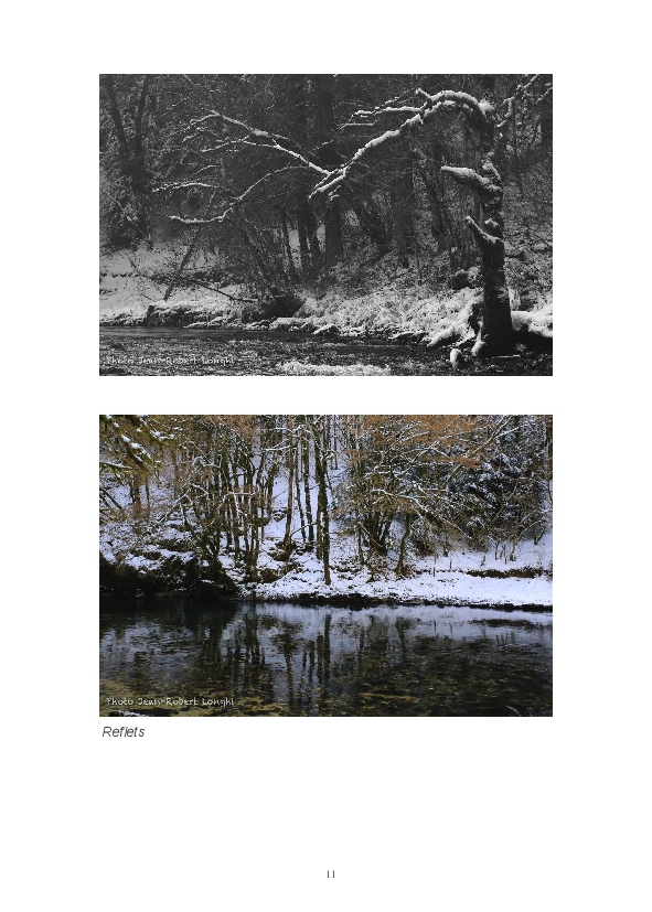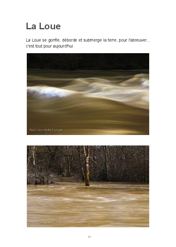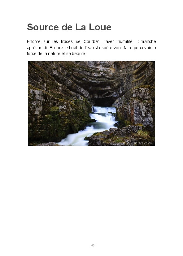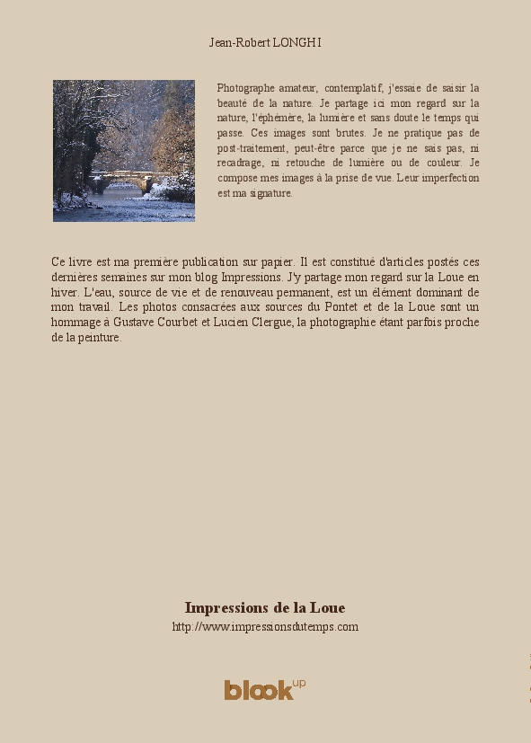 Ce livre est ma première publication sur papier. Il est constitué d'articles postés ces dernières semaines sur mon blog Impressions. J'y partage mon regard sur la Loue en hiver. L'eau, source de vie et de renouveau permanent, est un élément dominant de mon travail. Les photos consacrées aux sources du Pontet et de la Loue sont un hommage à Gustave Courbet et Lucien Clergue, la photographie étant parfois proche de la peinture.