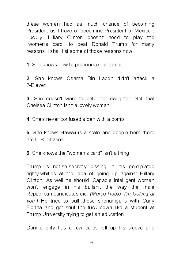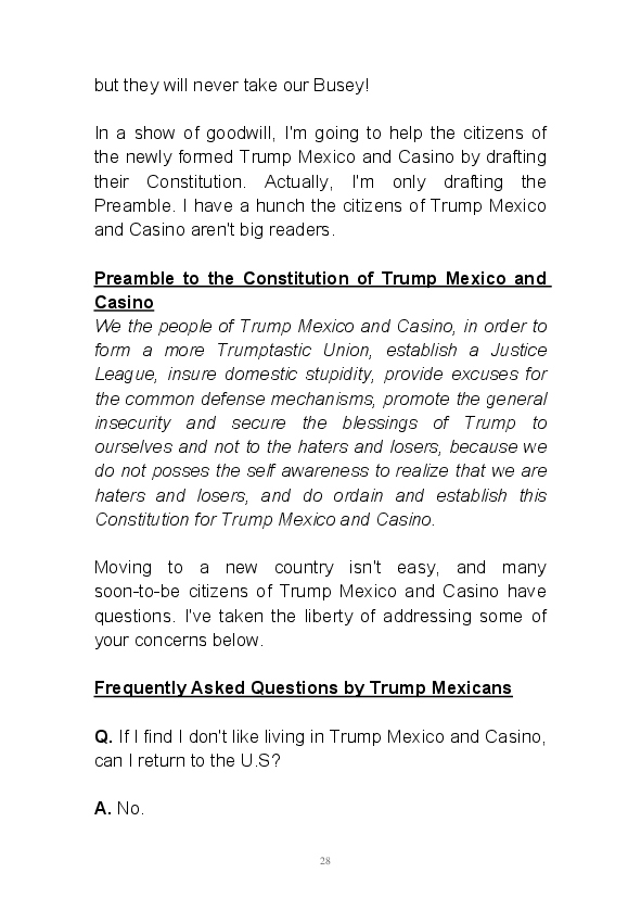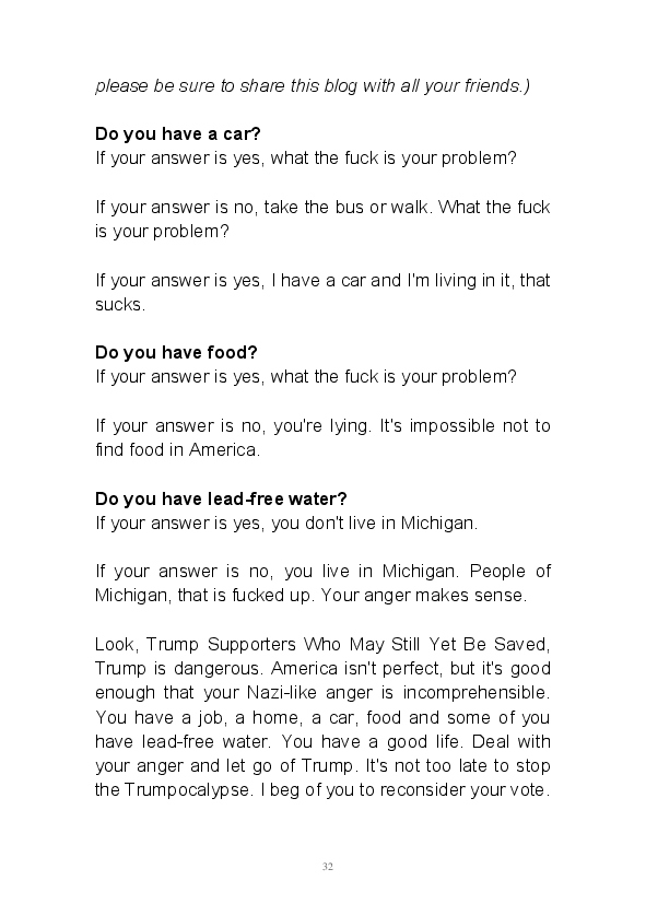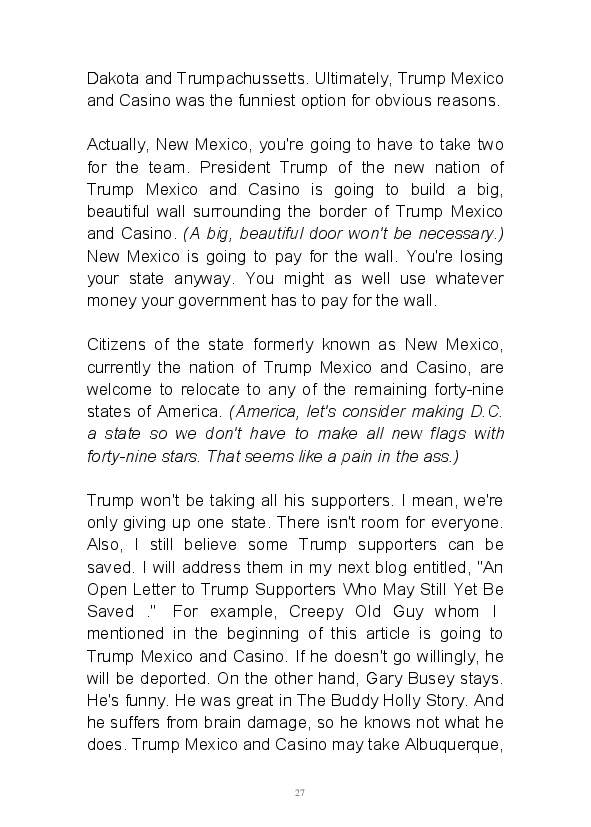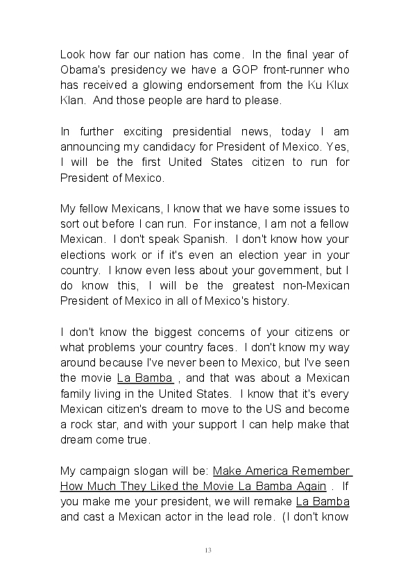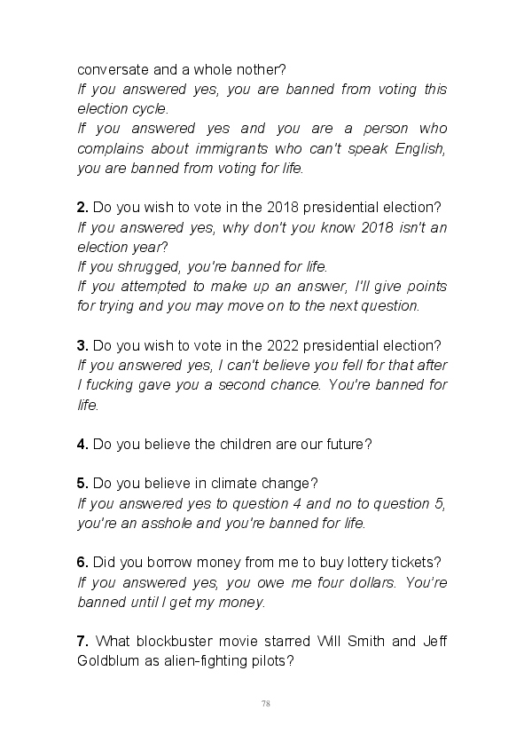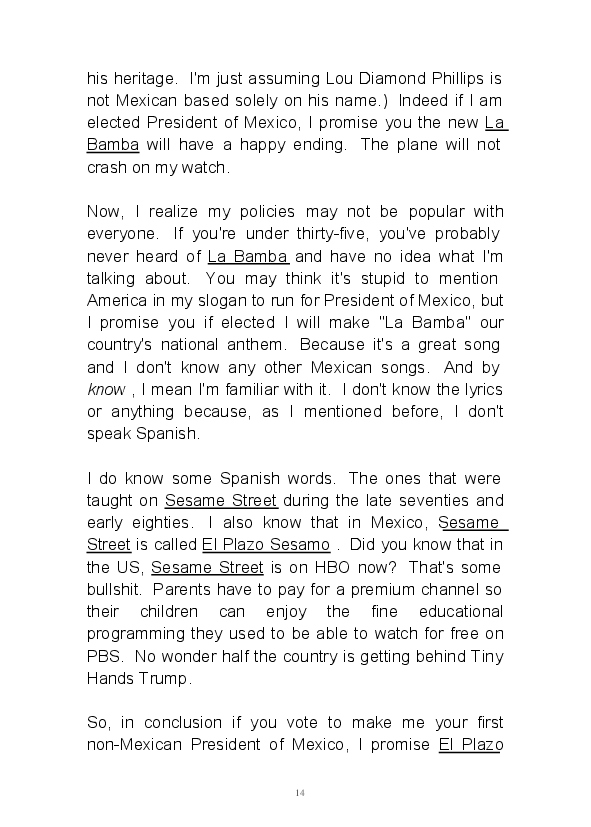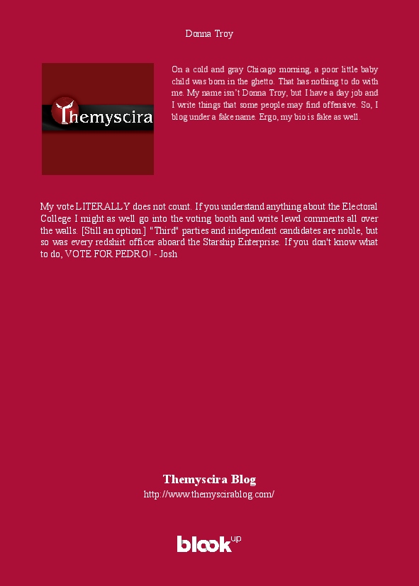 My vote LITERALLY does not count. If you understand anything about the Electoral College I might as well go into the voting booth and write lewd comments all over the walls. [Still an option.] "Third" parties and independent candidates are noble, but so was every redshirt officer aboard the Starship Enterprise. If you don't know what to do, VOTE FOR PEDRO! - Josh