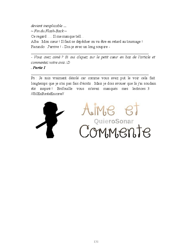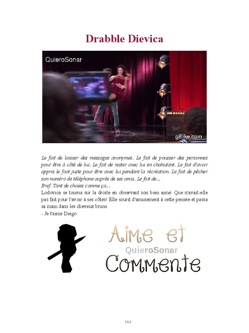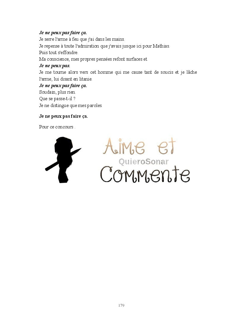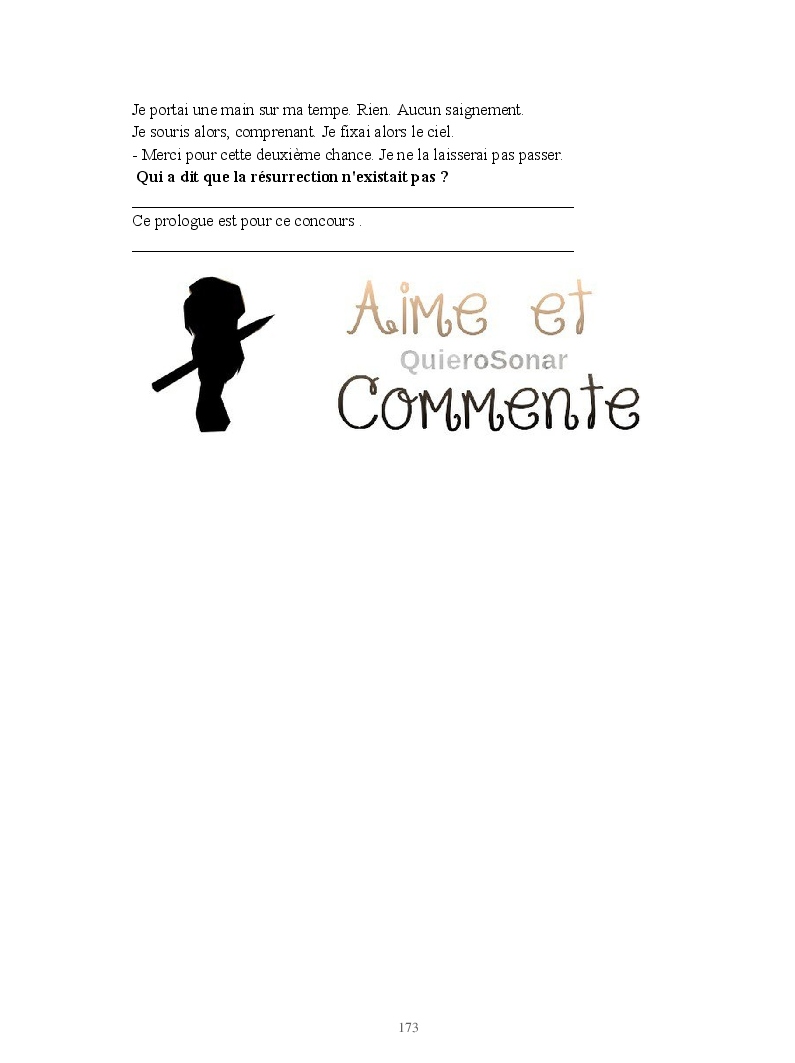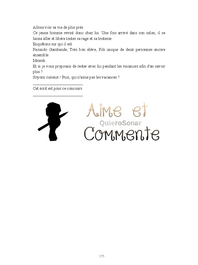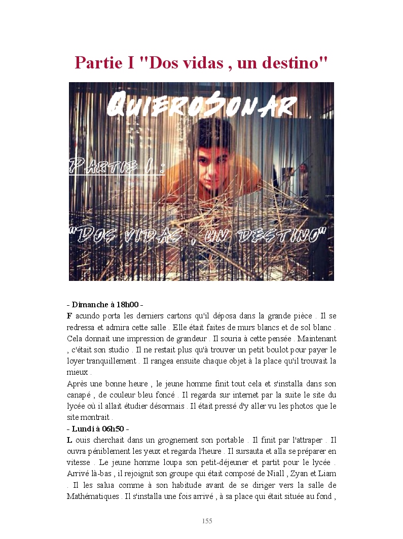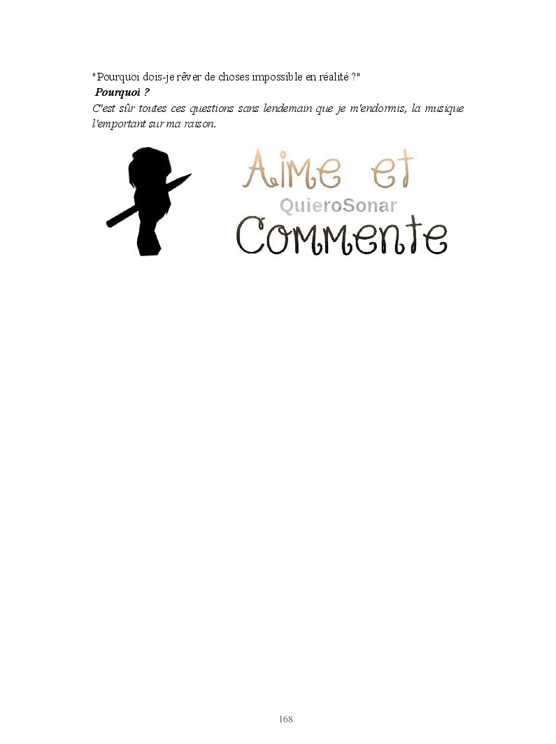 Dans ce blook, je montre mon blog QuieroSonar, qui retrace au final toute ma vie collégienne. Grâce à ce blook, vous pouvez suivre mon parcours et mes passages. Dès fois heureuses, dès fois en détresse, mes histoires montrent le passage dans lequel j'étais au moment de l'écriture. Ce rêve d'écrire un livre en tout cas, prendra peut-être forme en relisant cela. :)
