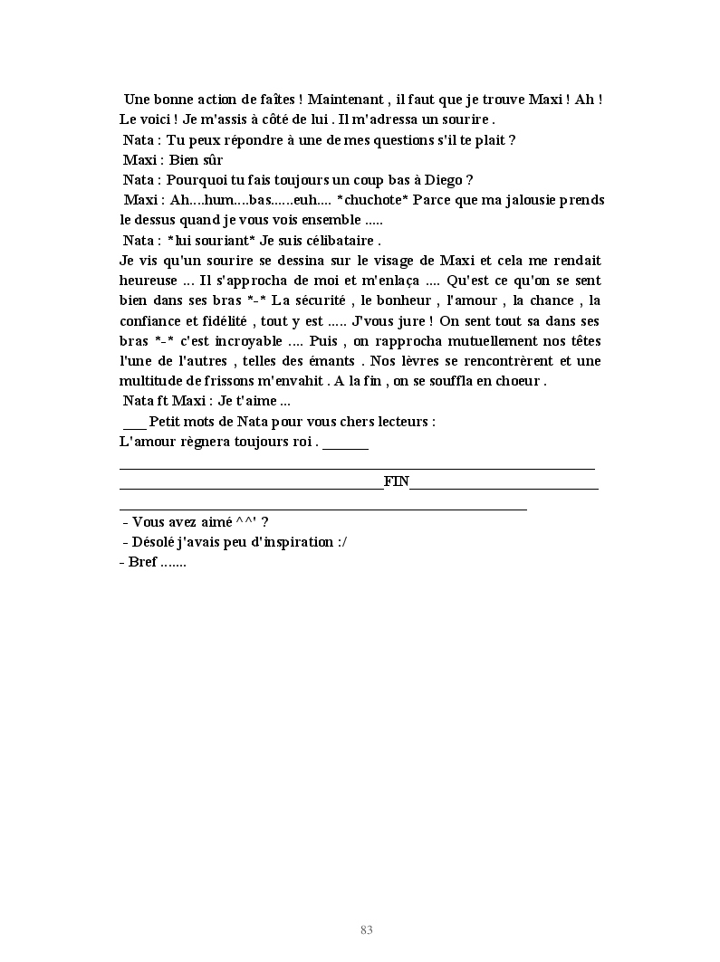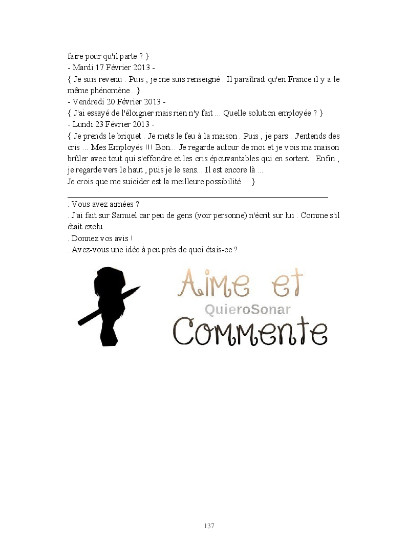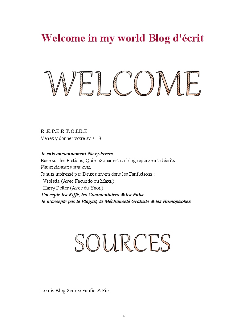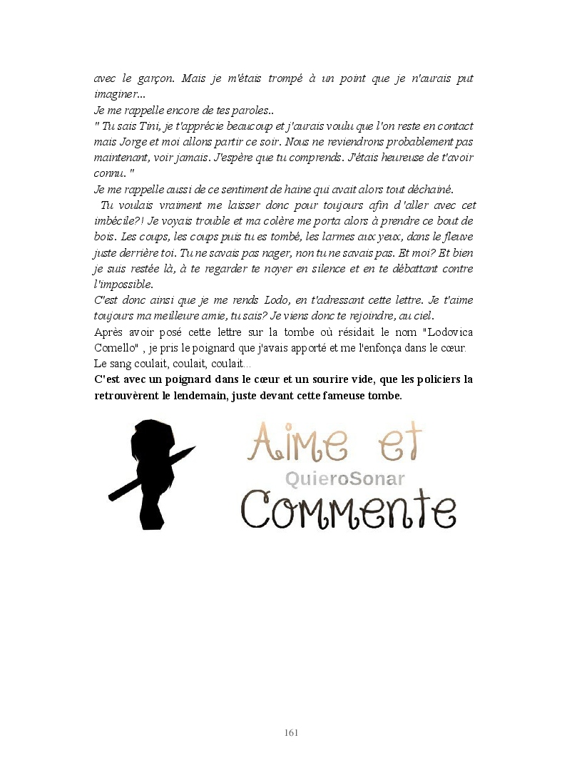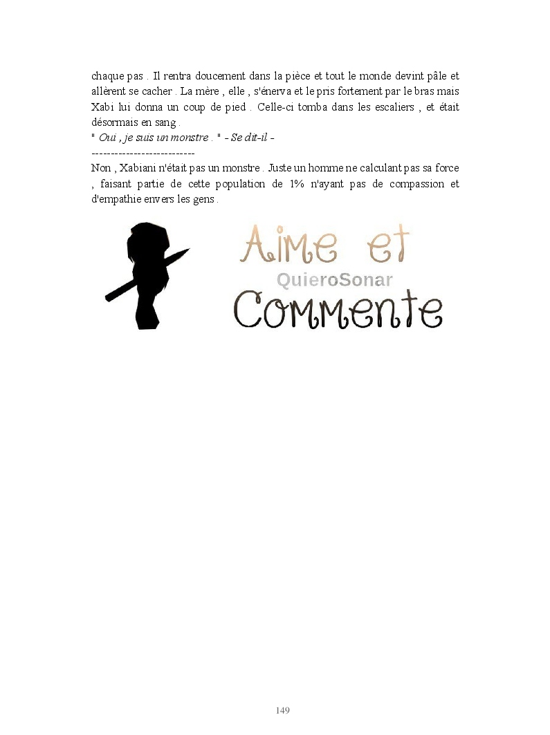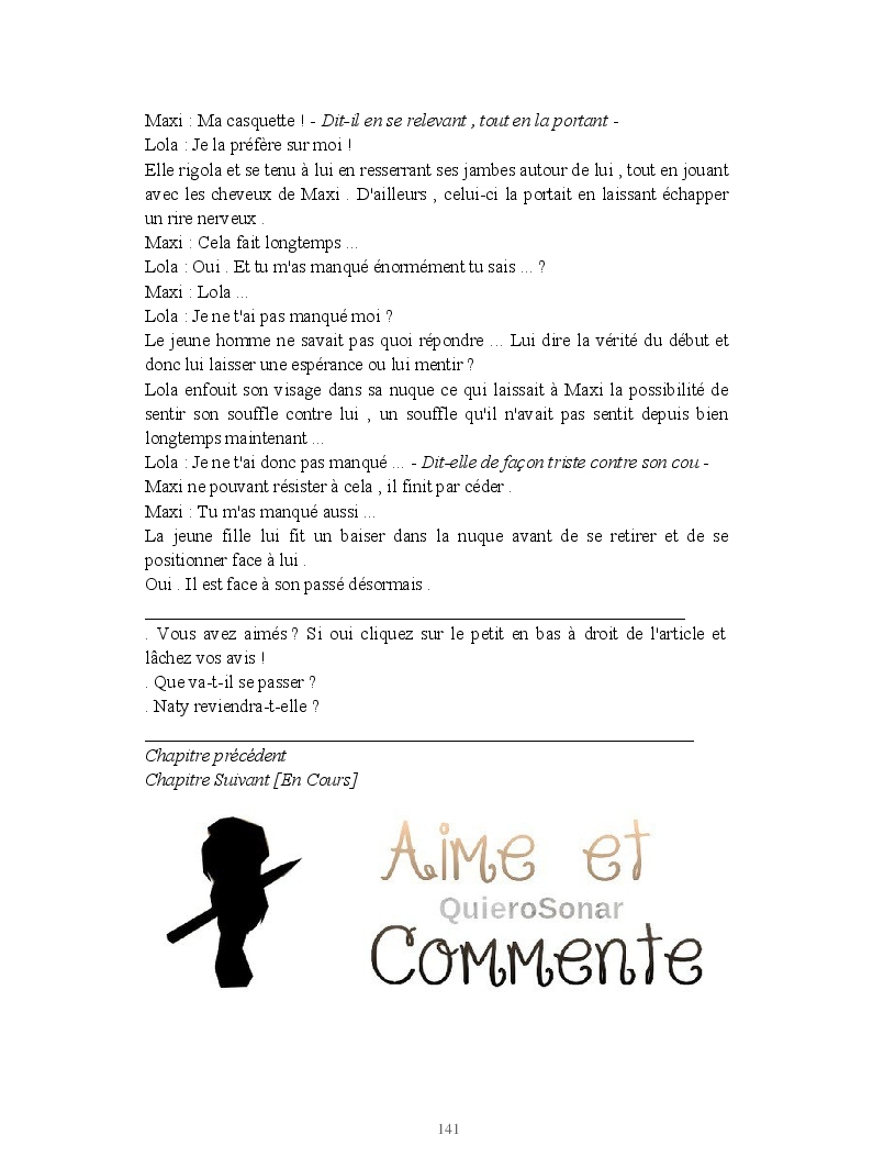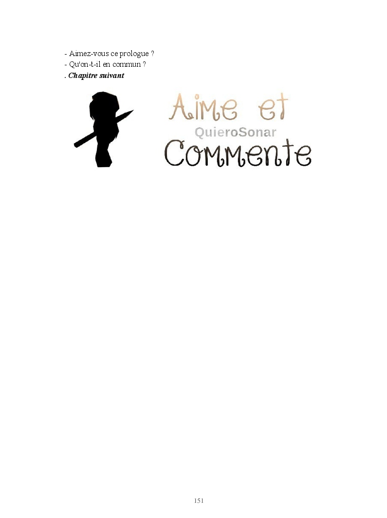 Dans ce blook, je montre mon blog QuieroSonar, qui retrace au final toute ma vie collégienne. Grâce à ce blook, vous pouvez suivre mon parcours et mes passages. Dès fois heureuses, dès fois en détresse, mes histoires montrent le passage dans lequel j'étais au moment de l'écriture. Ce rêve d'écrire un livre en tout cas, prendra peut-être forme en relisant cela. :)
