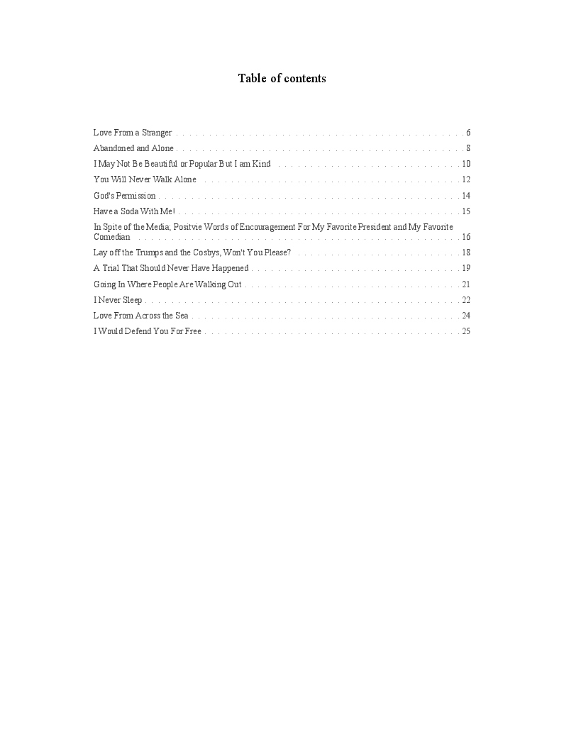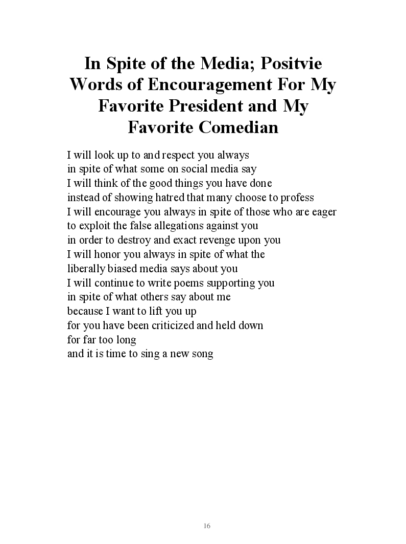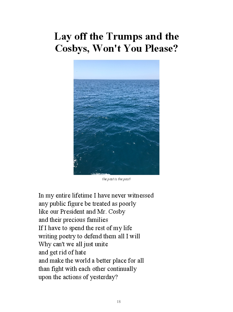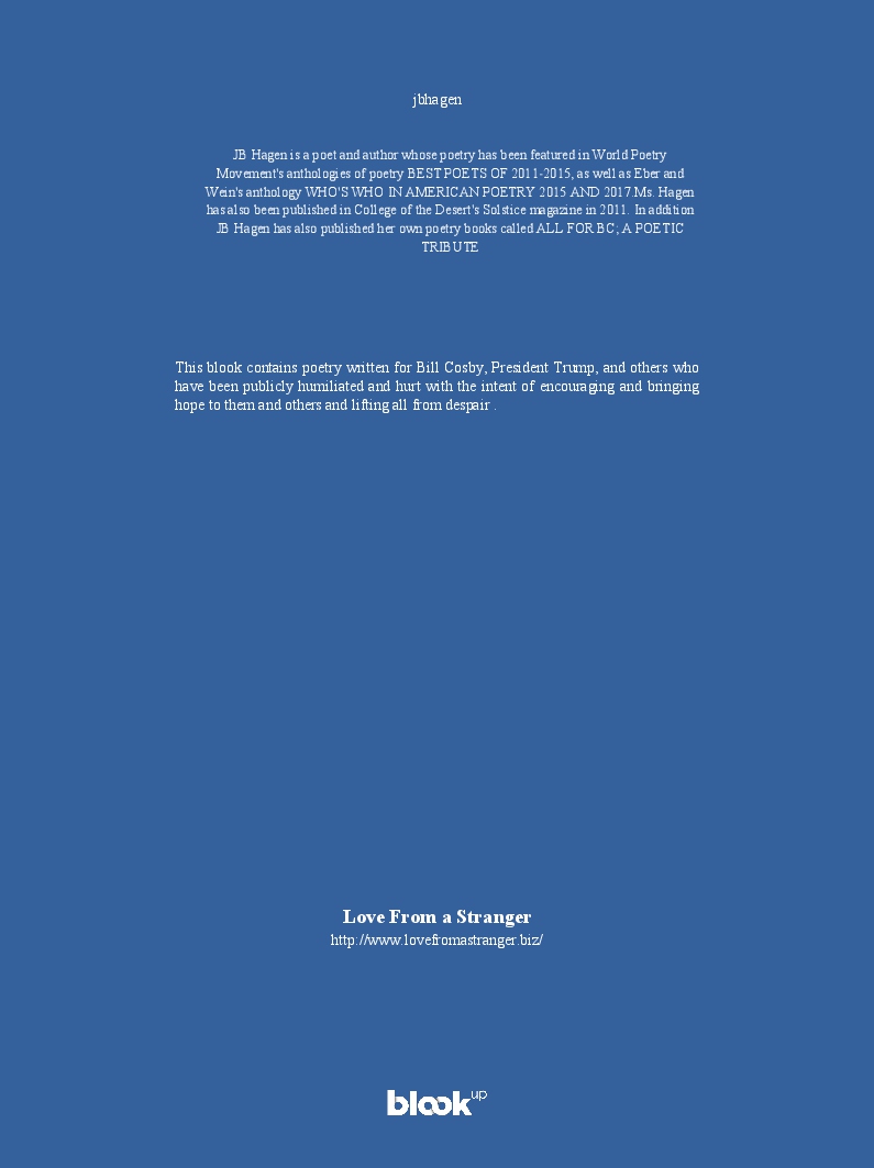 This blook contains poetry written for Bill Cosby, President Trump, and others who have been publicly humiliated and hurt with the intent of encouraging and bringing hope to them and others and lifting all from despair .