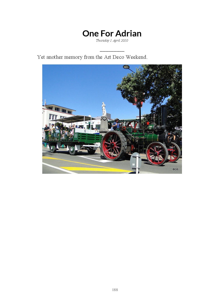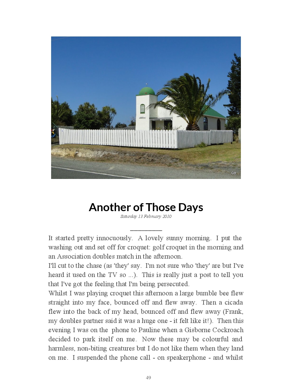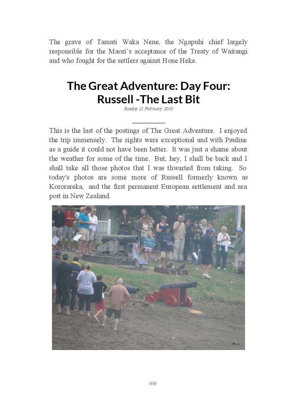 My fourth visit to New Zealand (despite the volumes for the last visit making the same claim). Another visit to Northland cementing a long and valued friendship with Pauline. The Napier Art Deco Weekend and plenty of croquet.