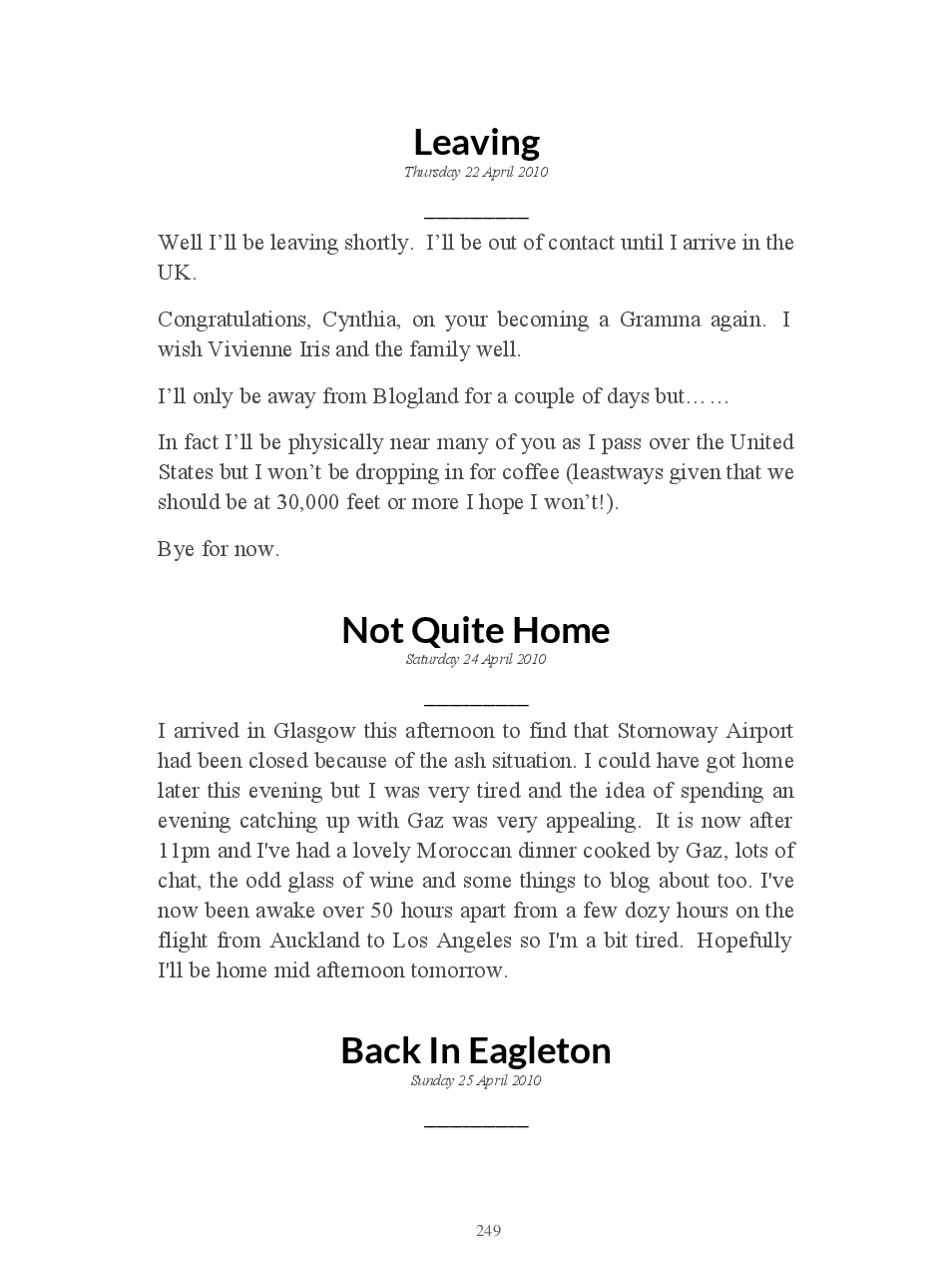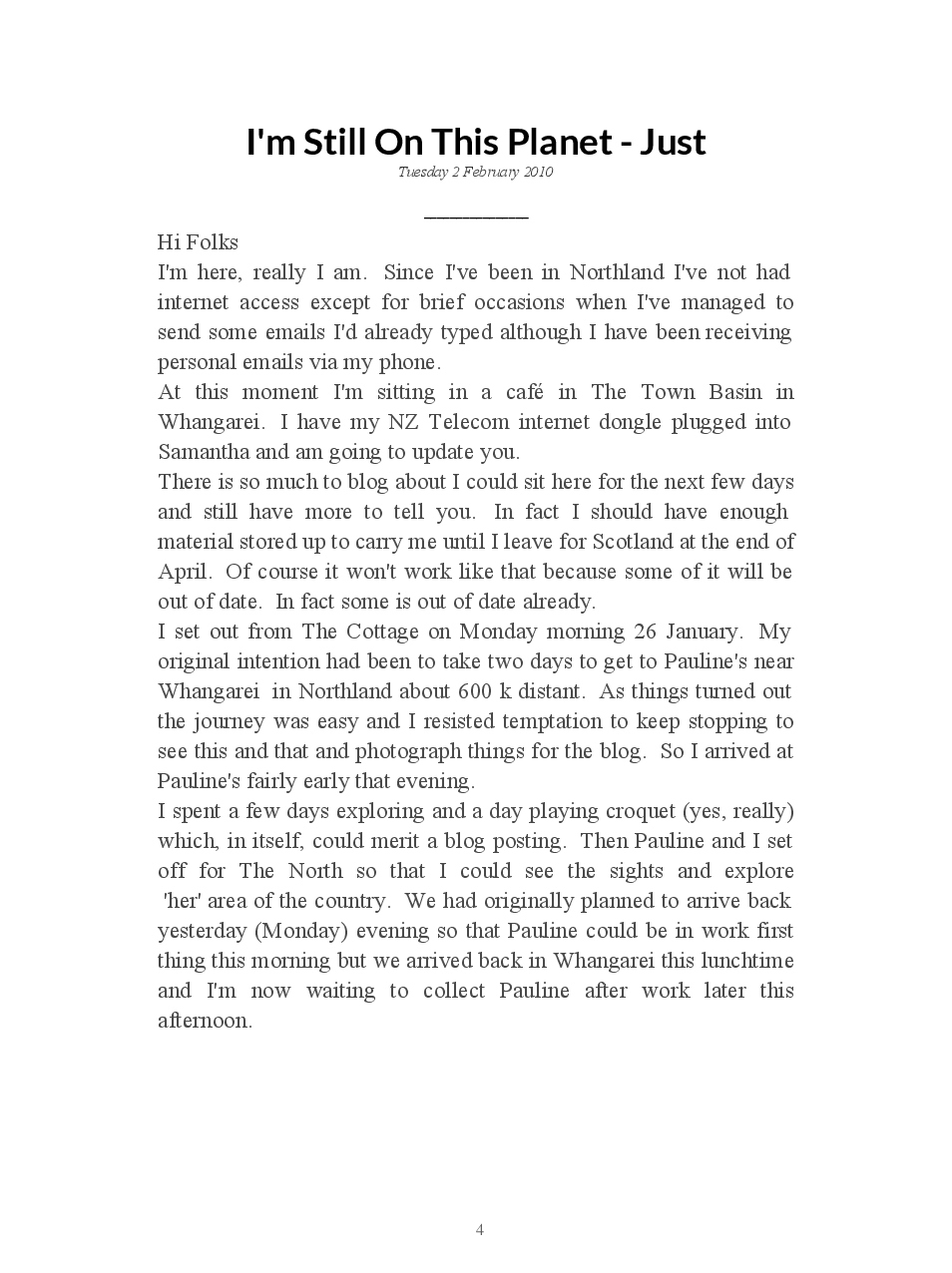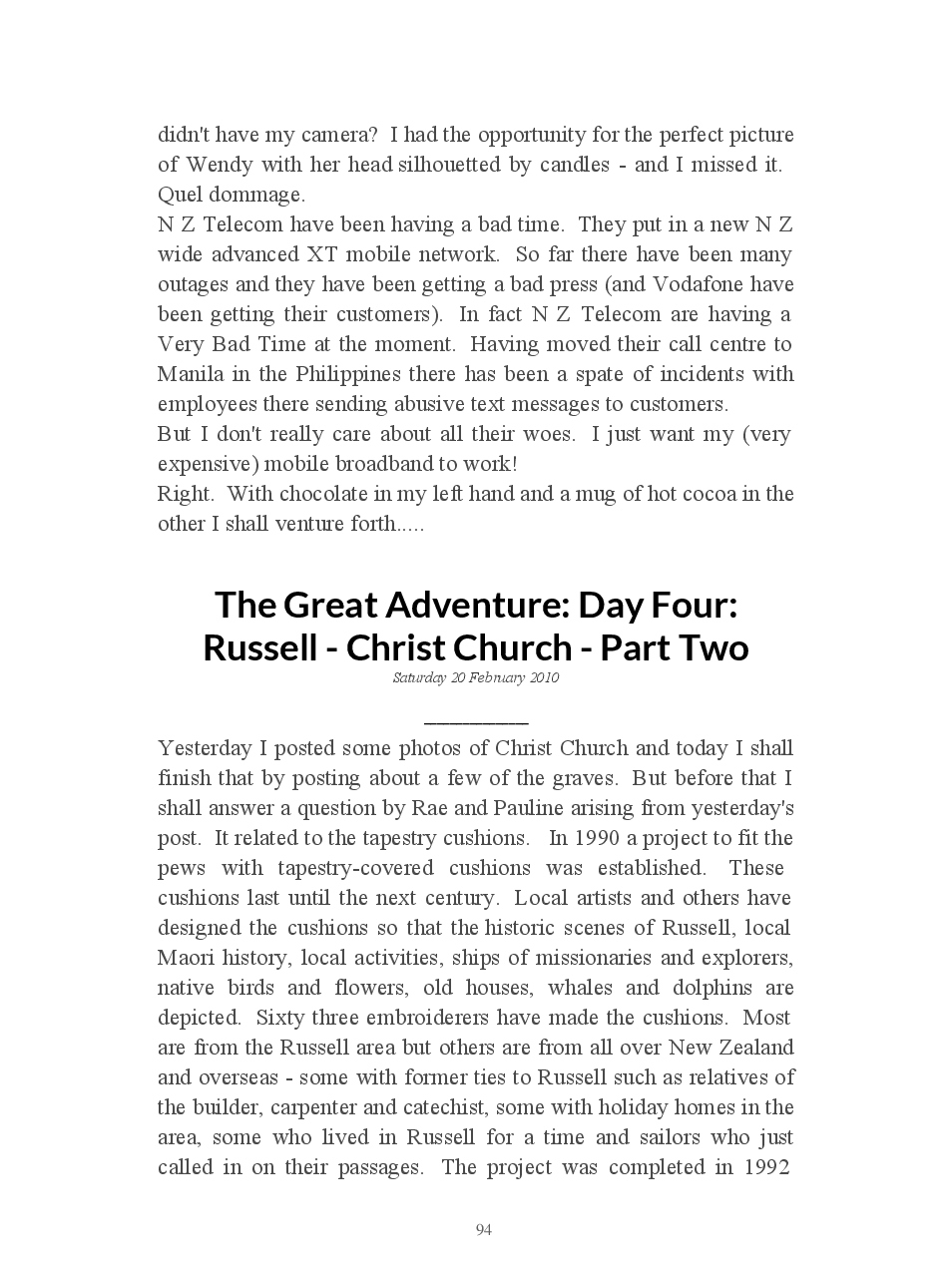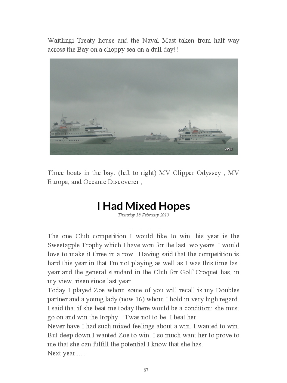 My fourth visit to New Zealand (despite the volumes for the last visit making the same claim). Another visit to Northland cementing a long and valued friendship with Pauline. The Napier Art Deco Weekend and plenty of croquet.