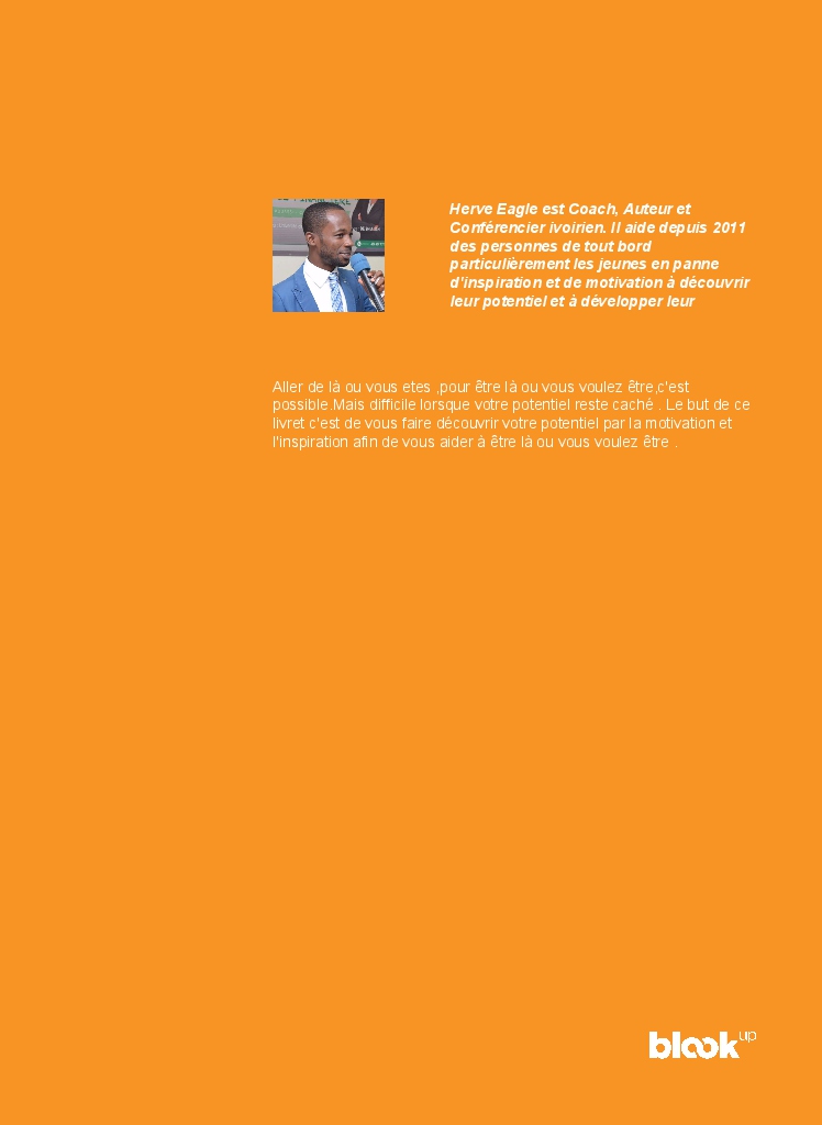 Aller de là ou vous etes ,pour être là ou vous voulez être,c'est possible.Mais difficile lorsque votre potentiel reste caché . Le but de ce livret c'est de vous faire découvrir votre potentiel par la motivation et l'inspiration afin de vous aider à être là ou vous voulez être .