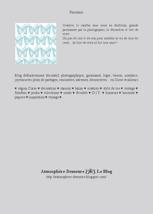 Blog définitivement décoratif, photographique, gourmand, léger, terrien, insulaire, joyeux avec plein de partages, rencontres, adresses, découvertes... en Corse et ailleurs