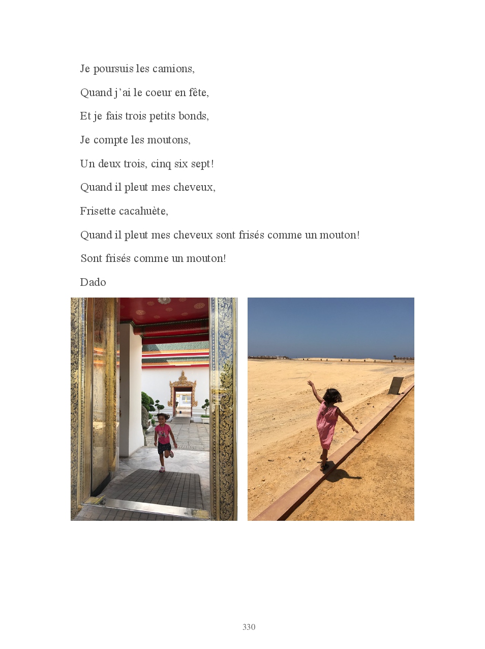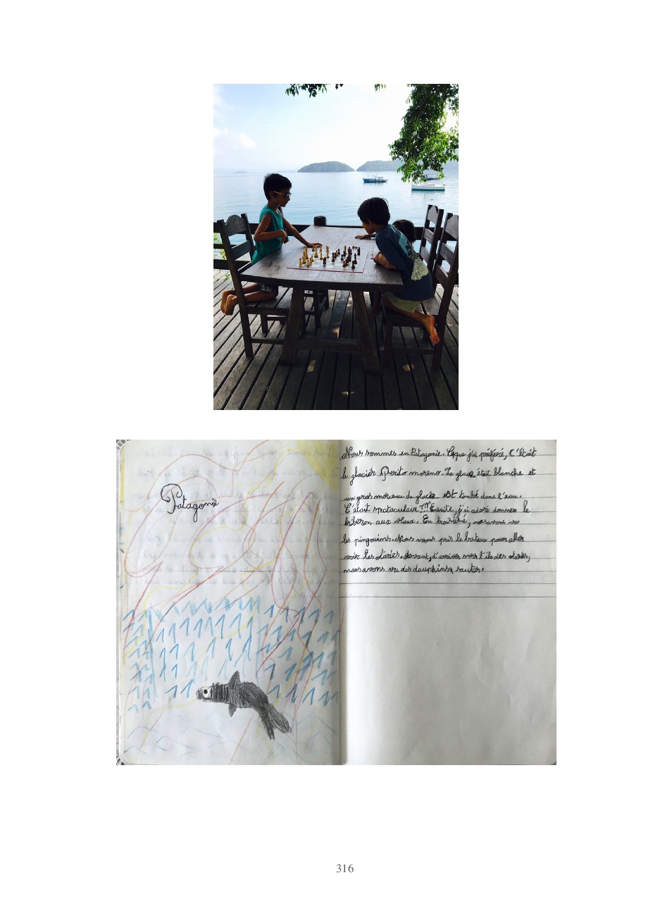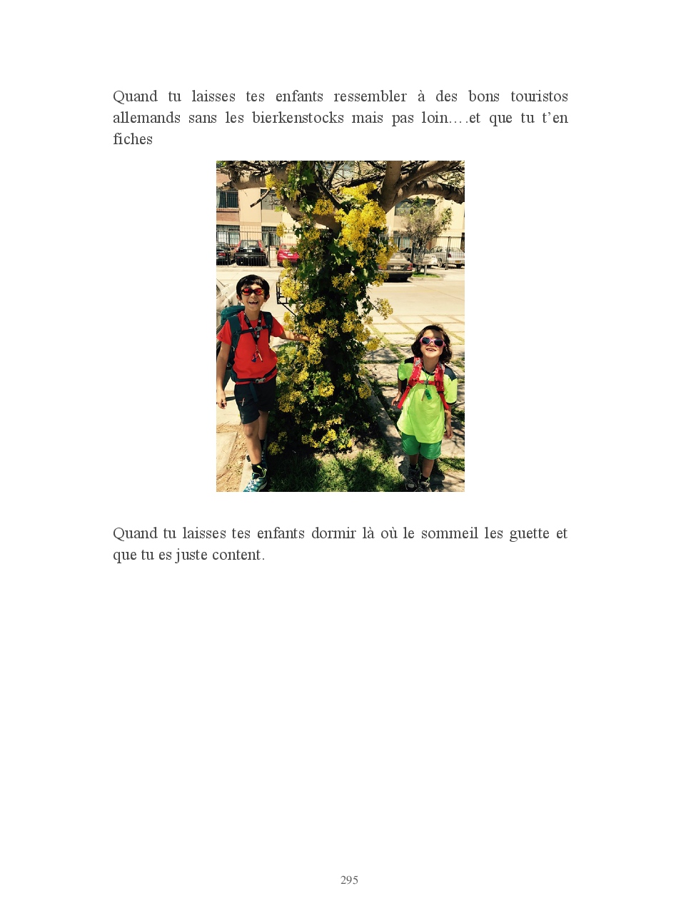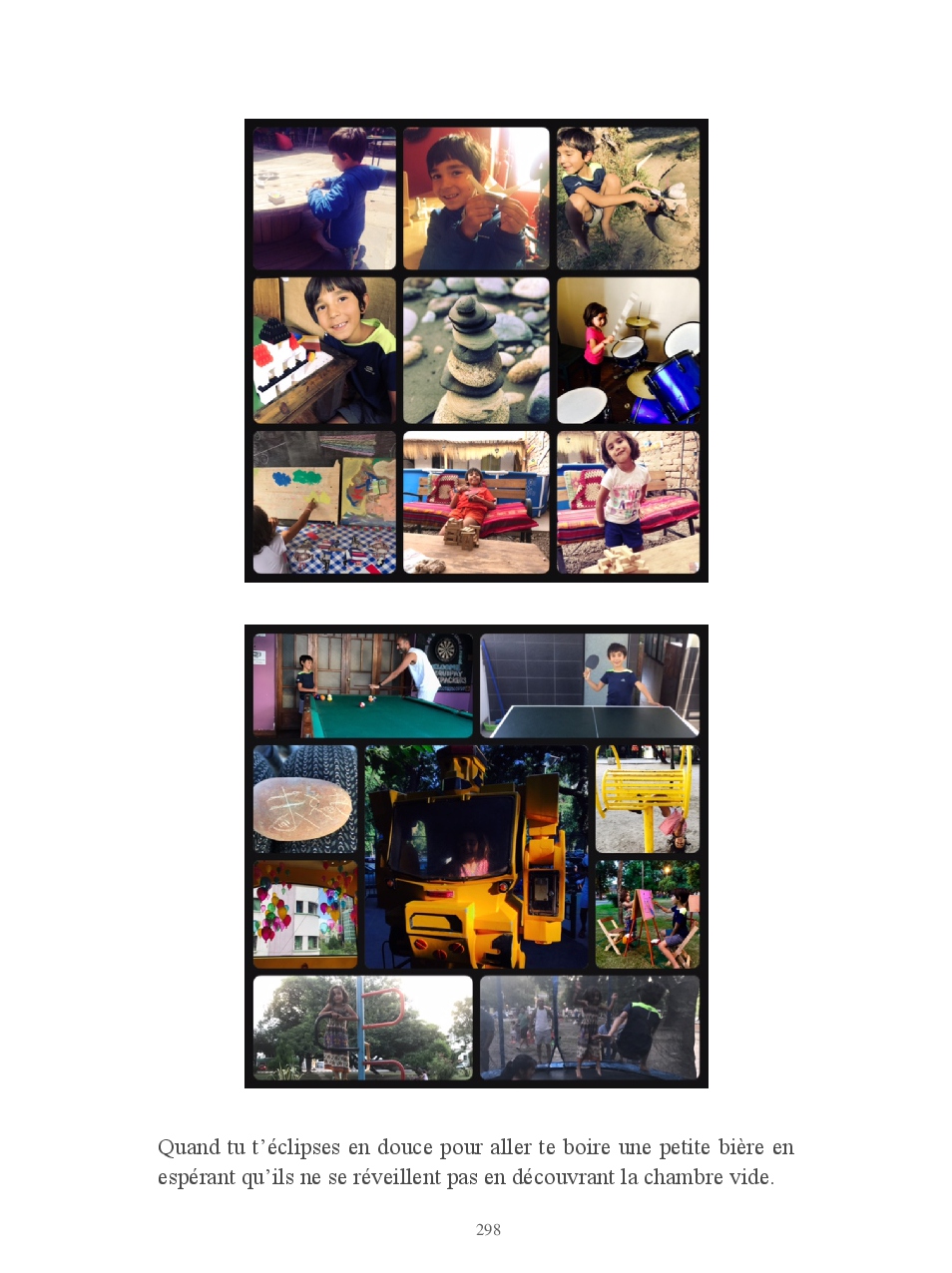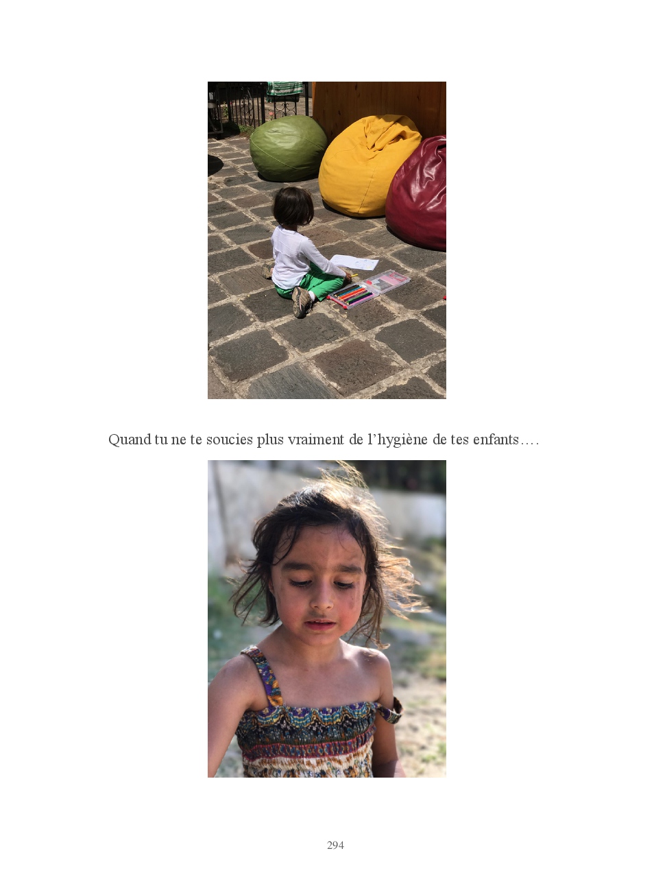 Lucas pose des questions inlassablement. Anodines, existentielles, philosophiques, il veut tout savoir. Il crée pour créer: des mètres qui ne mesurent pas, des tongs en carton, des pinceaux avec ses cheveux... des origamis. Manon sort une vanne avec un aplomb d'enfer puis s'éclate littéralement de rire. Elle aime que les choses soient rangées, précises. Regard intense et sauvage, droit dans les yeux. Pas un mot. Elle ne le montre pas mais Manon c'est une dure au cœur tendre.